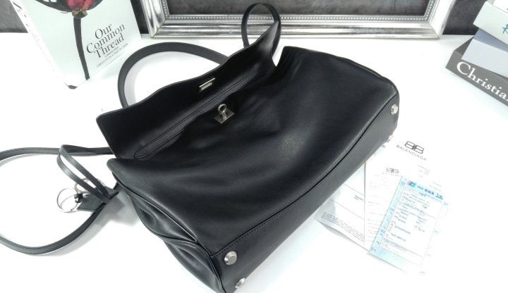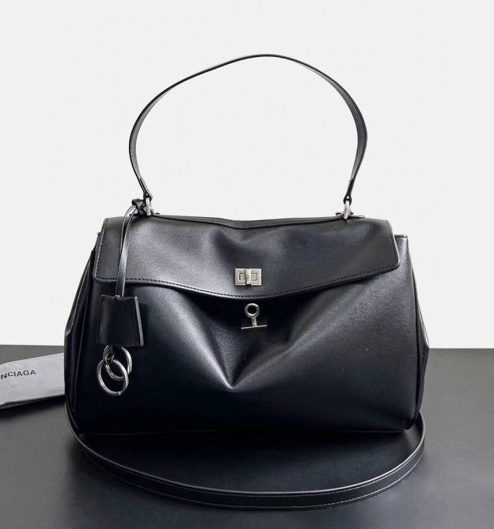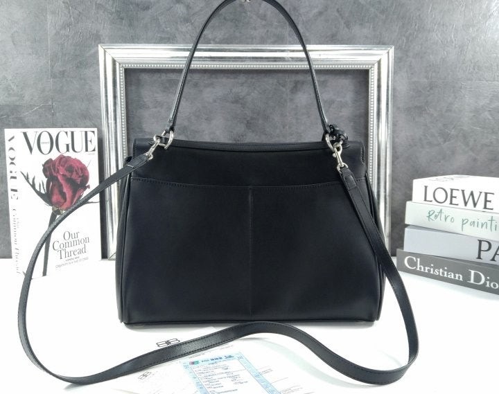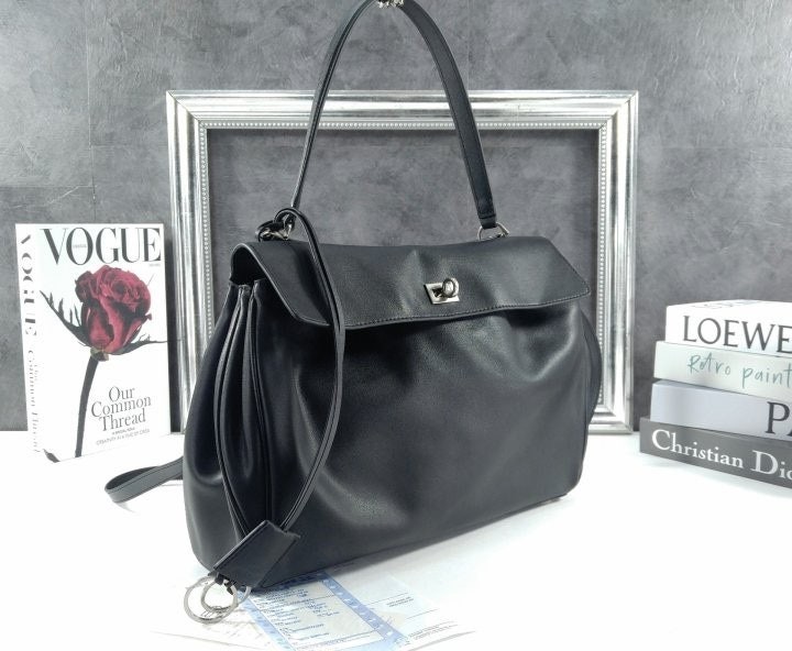 원 참 디테일 및 블랙 유즈드 스무드 카프스킨 소재의 로데오 미디엄 핸드백, 빈티지 실버 장식