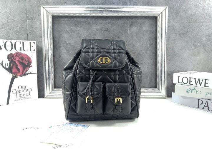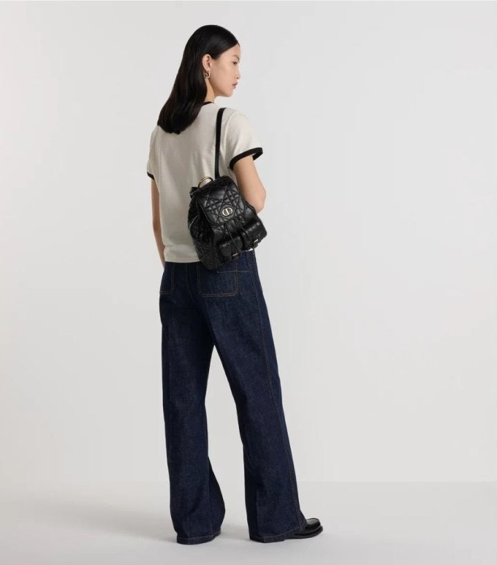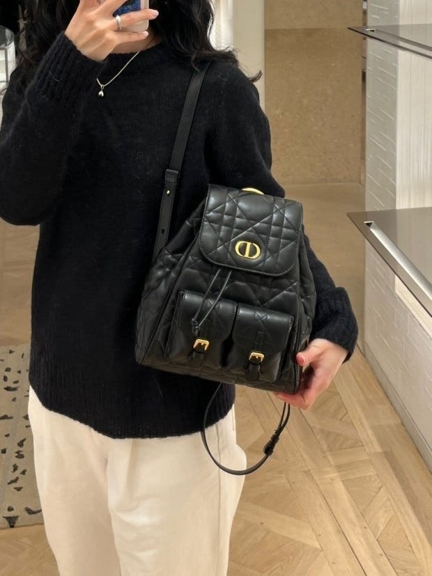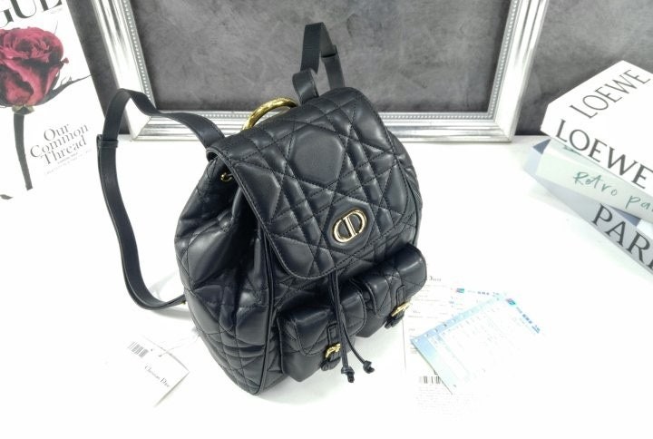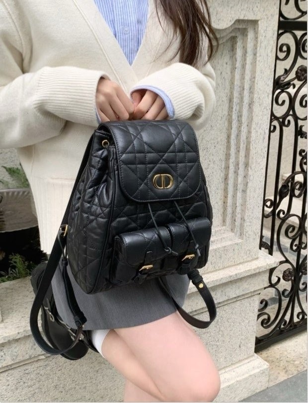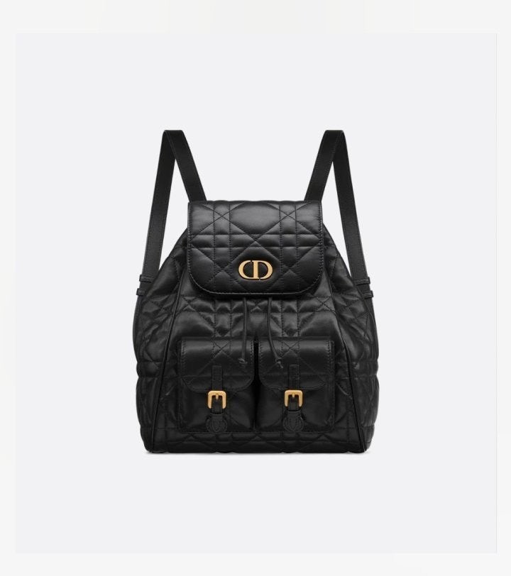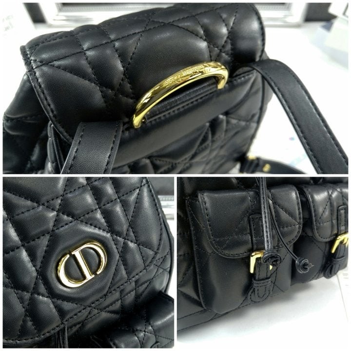 모던하고 우아한 스타일의 Di*r Caro 백팩입니다. 매크로까나쥬 스티칭을 더한 블랙 양가죽 소재로 제작되었으며, 앤틱 골드 피니시 메탈 CD 시그니처 디테일의 플랩을 열면 나타나는 넉넉한 드로우스트링 메인 수납공간과 작은 데일리 소지품을 모두 담을 수 있는 스몰 플랩 포켓 2개가 특징입니다. 골드 피니시 핸들과 길이 조절 가능한 스트랩으로 편안하게 완성된 미디엄 백팩입니다.