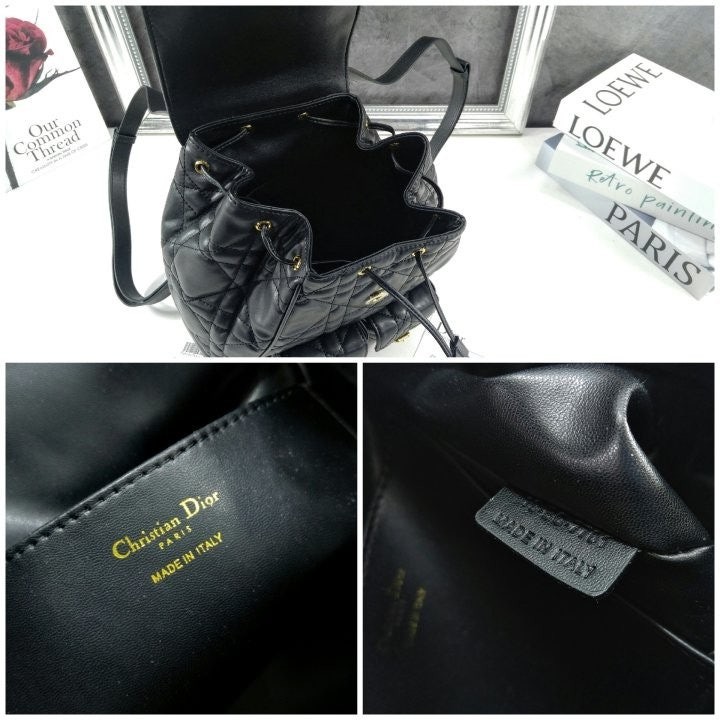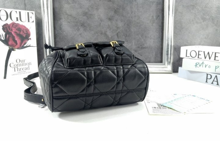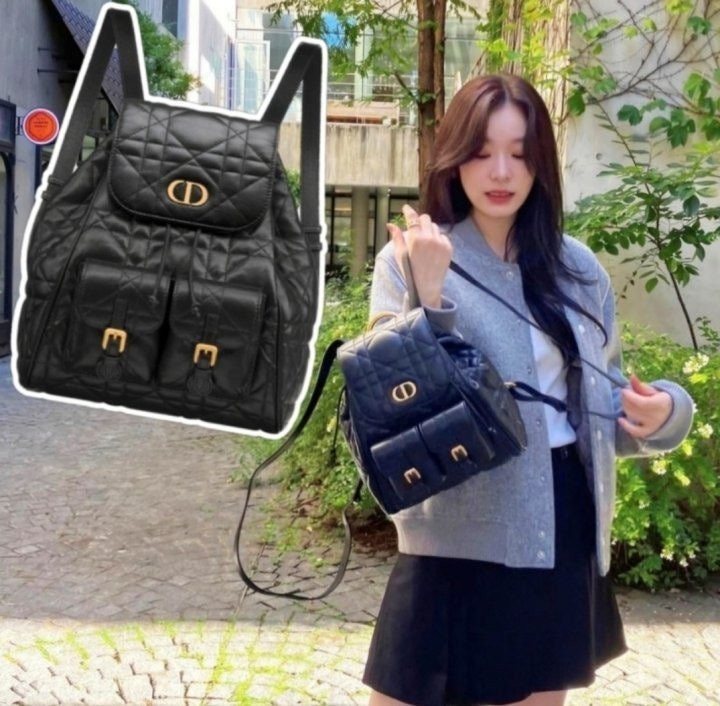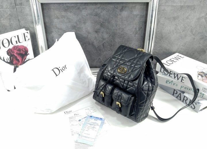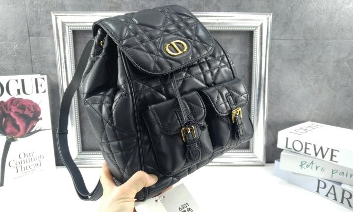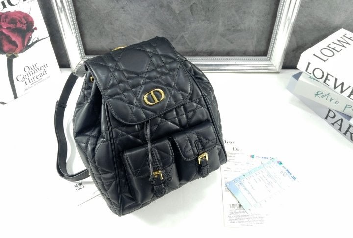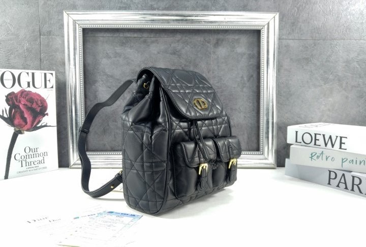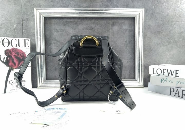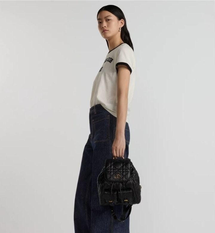 모던하고 우아한 스타일의 Di*r Caro 백팩입니다. 매크로까나쥬 스티칭을 더한 블랙 양가죽 소재로 제작되었으며, 앤틱 골드 피니시 메탈 CD 시그니처 디테일의 플랩을 열면 나타나는 넉넉한 드로우스트링 메인 수납공간과 작은 데일리 소지품을 모두 담을 수 있는 스몰 플랩 포켓 2개가 특징입니다. 골드 피니시 핸들과 길이 조절 가능한 스트랩으로 편안하게 완성된 미디엄 백팩입니다.