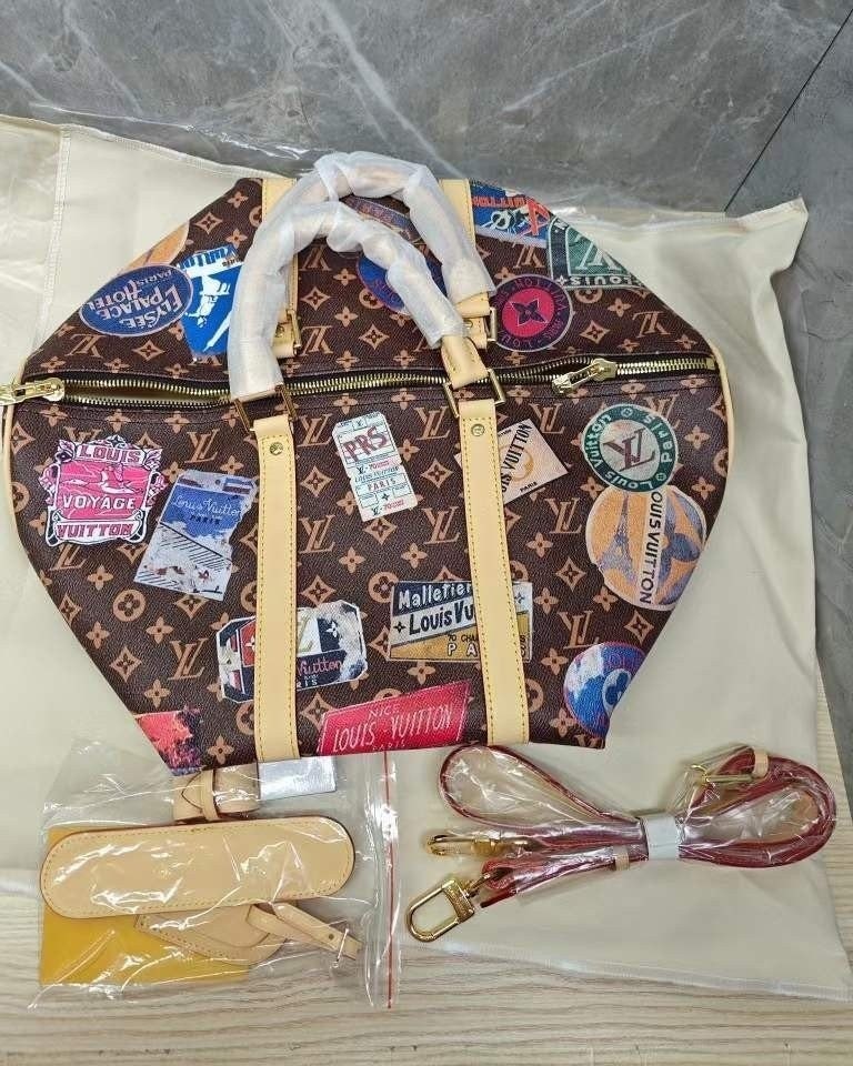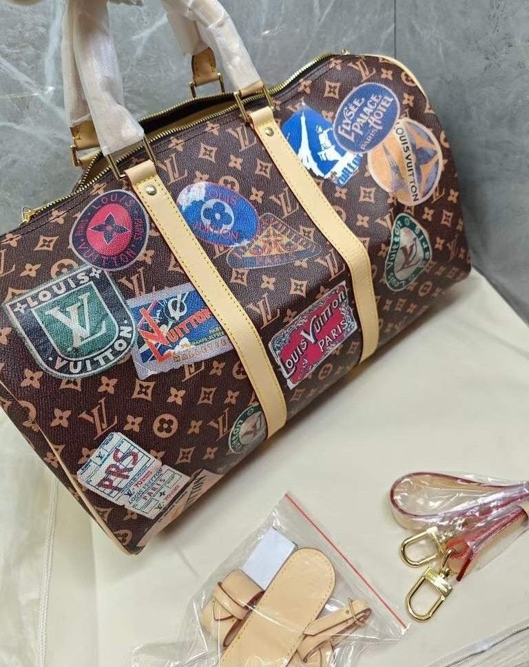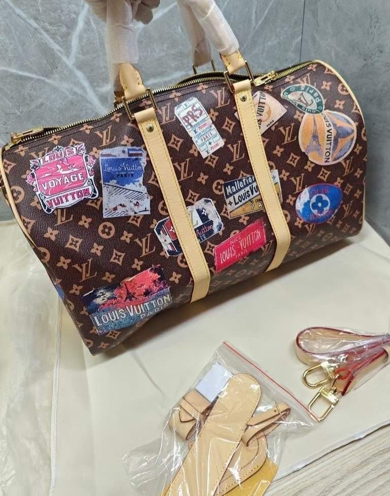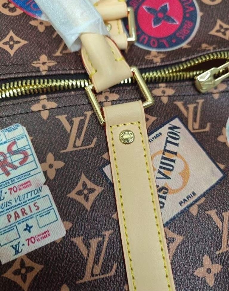 루*의 여행 스티커로 호화로우면서도 신뢰감을 자아내는 모노그램 캔버스 소재의 키폴 반둘리에 45. 모든 여행자를 위한 완벽한 아이템. 빈티지한 분위기를 더하는 천연 카우하이드 가죽 소재의 트리밍. 두 개의 상단 핸들과 탈착 및 조절 가능한 숄더 스트랩을 구성한 기내용 사이즈의 디자인.