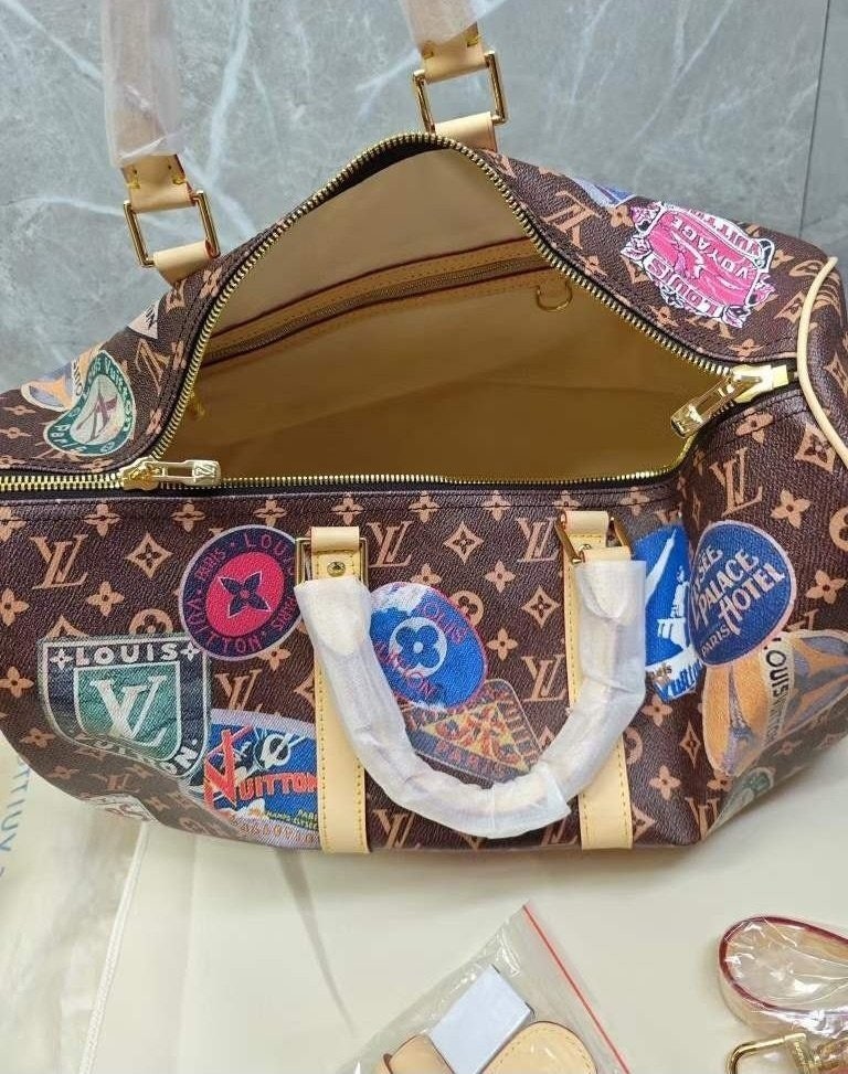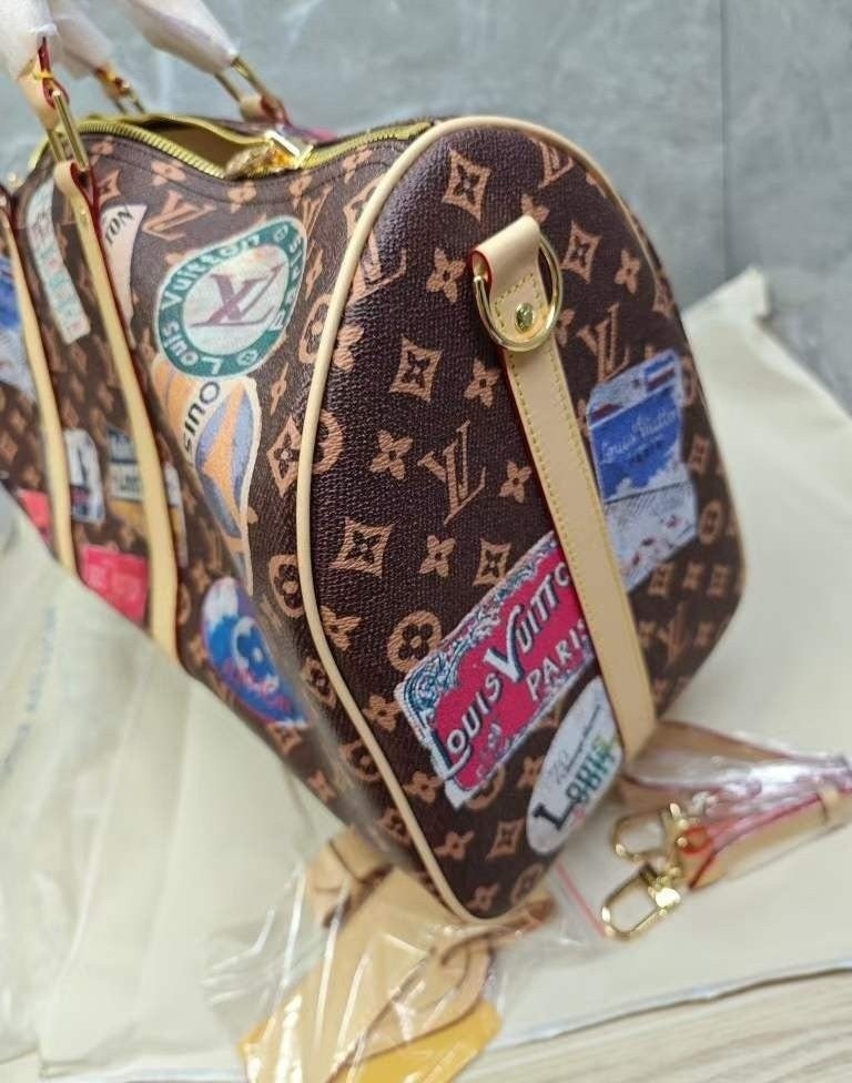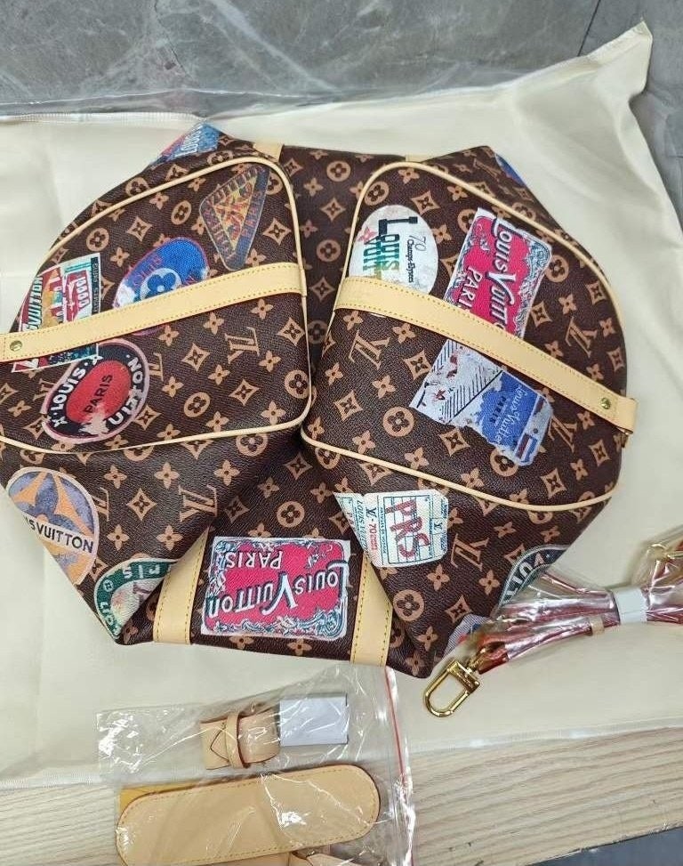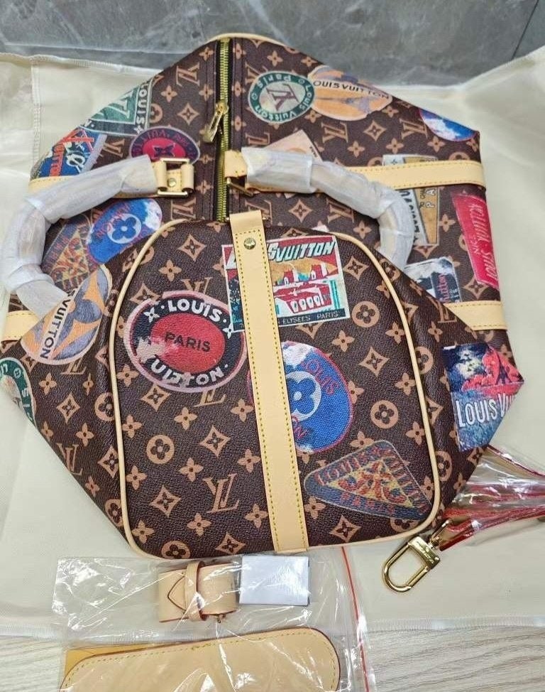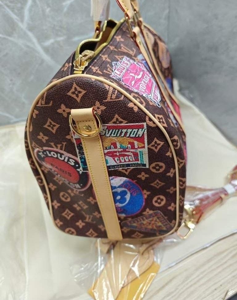 루*의 여행 스티커로 호화로우면서도 신뢰감을 자아내는 모노그램 캔버스 소재의 키폴 반둘리에 45. 모든 여행자를 위한 완벽한 아이템. 빈티지한 분위기를 더하는 천연 카우하이드 가죽 소재의 트리밍. 두 개의 상단 핸들과 탈착 및 조절 가능한 숄더 스트랩을 구성한 기내용 사이즈의 디자인.
