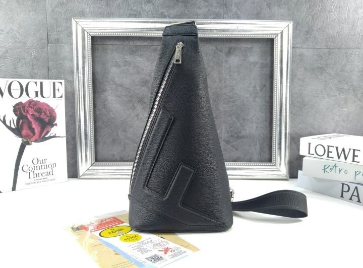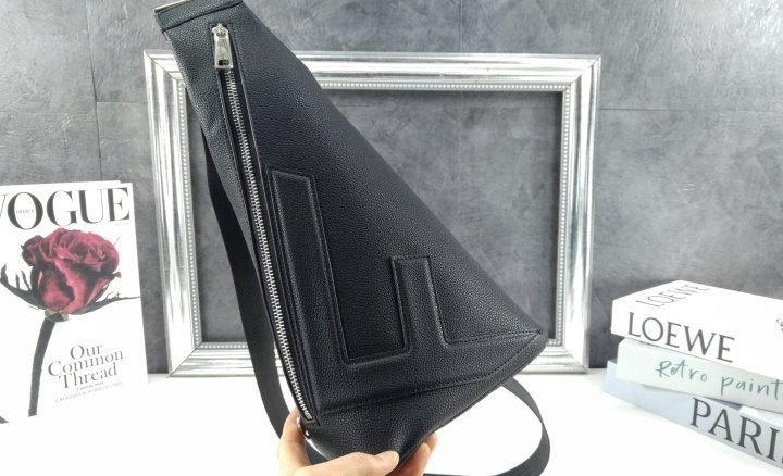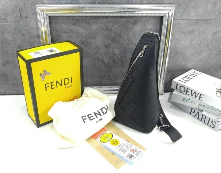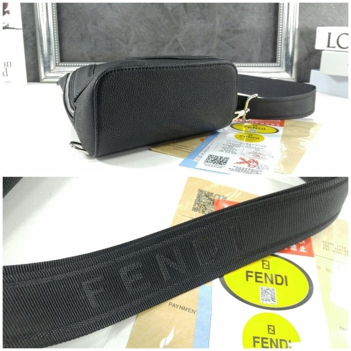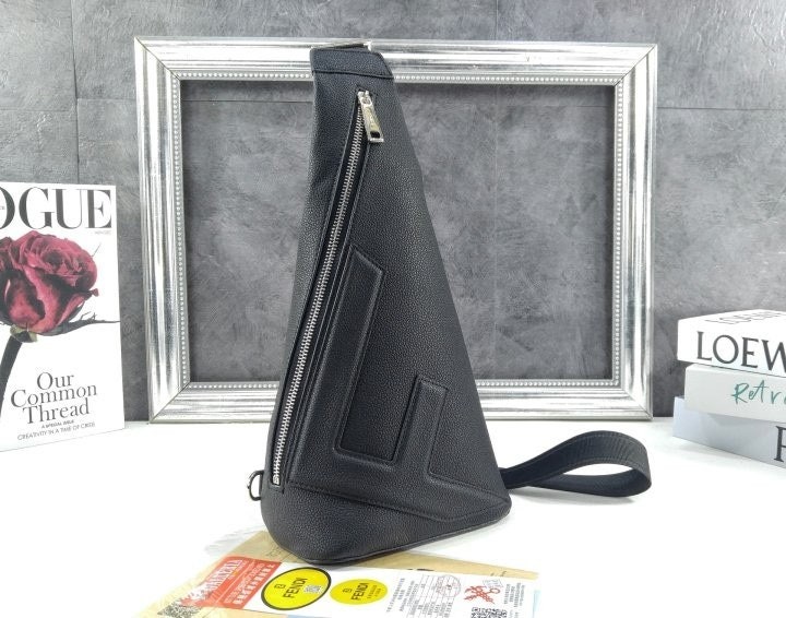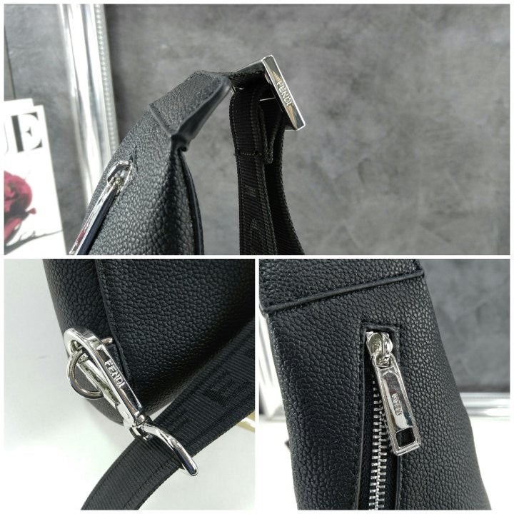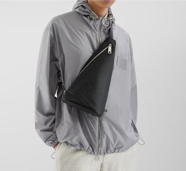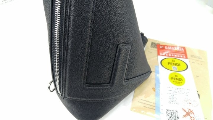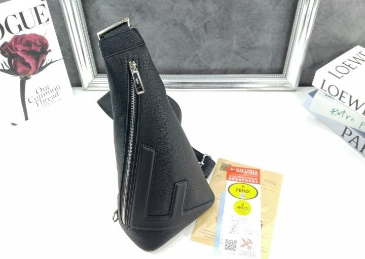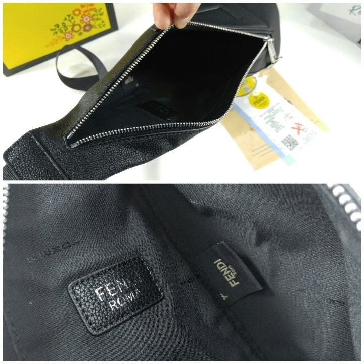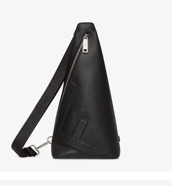 블랙 풀 그레인 가죽 소재, 엠보싱 오버사이즈 F 디테일. 비대칭형 지퍼 잠금장치.