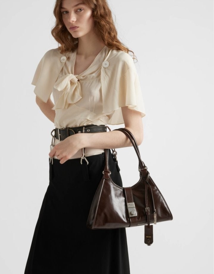 기하학 라인과 세련된 장인의 디테일과 부드러운 볼륨이 특징인 백입니다. 사다리꼴 디자인에 긴 핸들이 달려 있어 숄더백으로도 간편하게 착용할 수 있습니다. 아카이브에서 영감을 받은 세로 클라스프와 가죽 거울이 세련된 액세서리를 완성합니다.