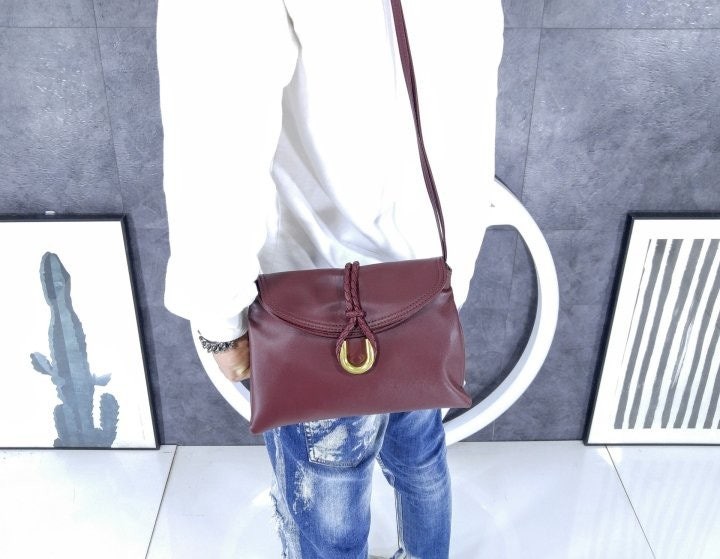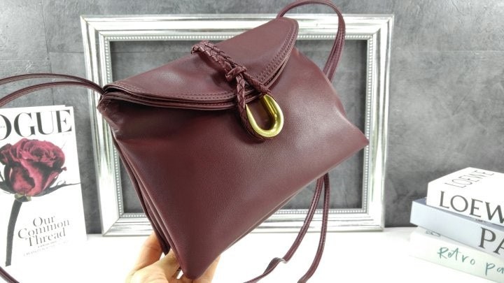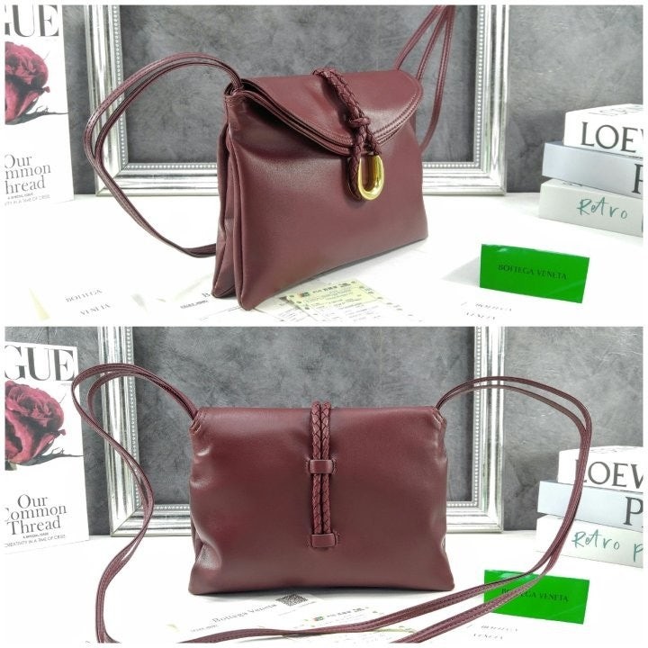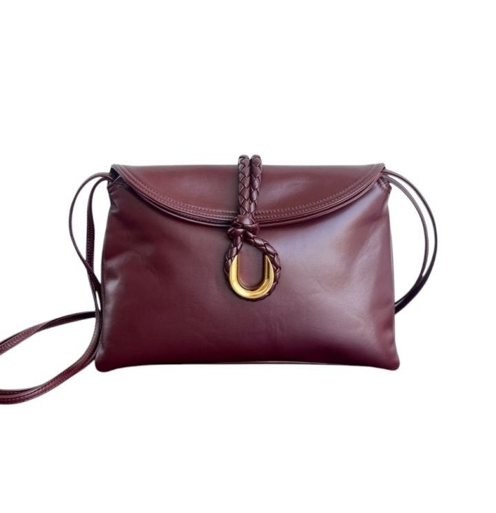더블 플랩을 갖춘 부드러운 송아지가죽 소재의 크로스바디 백. 조각 같은 메탈 잠금장치 및 가죽 위빙 코드.