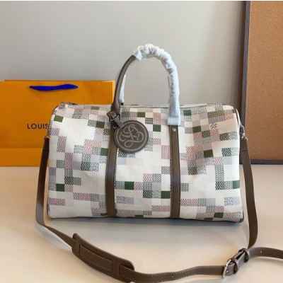 다미에 에벤 체커보드 위에 손으로 칠한 듯한 사각형을 프린트한 퍼렐 윌리엄스의 LV 버스 다미에 캔버스로 선보이는 키폴 반둘리에 45. 지퍼 풀러, LV 버스 유나이티드 택, 'Marque Lo*is Vuitton Déposée'와 같은 고급스러운 디테일로 과거와 현재를 융합하는 퍼렐 윌리엄스의 디자인을 구현한 아이템.