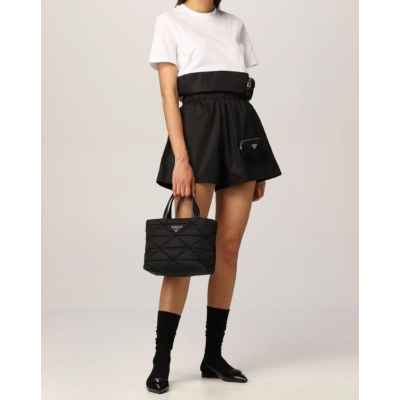 프** 고급 리나일론 나파 트라이앵글 퀼팅 패딩 더블핸들 지퍼 포켓 토트 블랙 > BAG&WALLET