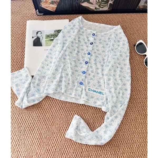 •블루 톤의 무드가 돋보이는 달콤하고 귀여운 미니 플라워 패턴입니다. 시각적으로 더 시원해 보이게 해주는 스타일로, 얇은 가디건 하나만으로도 분위기가 확 살아납니다. 정말 예쁘고 세련된 느낌이에요. 인스타에서 인기 많은 샤* 스타일의 꽃무늬 탑으로, 맞춤 제작한 원단과 단추 등 디테일이 정교합니다.