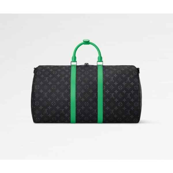 옆면 밴드와 상단 핸들의 생기 넘치는 색상으로 포인트를 더한 모노그램 이클립스 캔버스 소재의 키폴 반둘리에 50. 블랙 색상 텍스타일 소재의 안감. 내부 지퍼형 포켓. 탈착 가능한 조절형 스트랩을 활용해 숄더 백 또는 크로스 바디 백으로 연출할 수 있는 스타일. 넉넉하면서도 기내용 캐리어로 활용하기 좋은 컴팩트한 아이템.