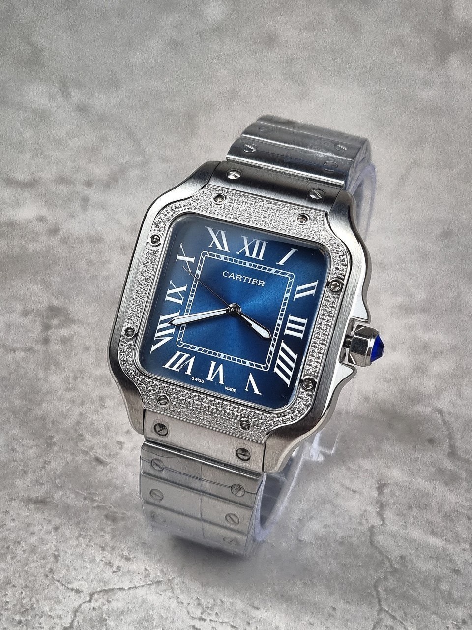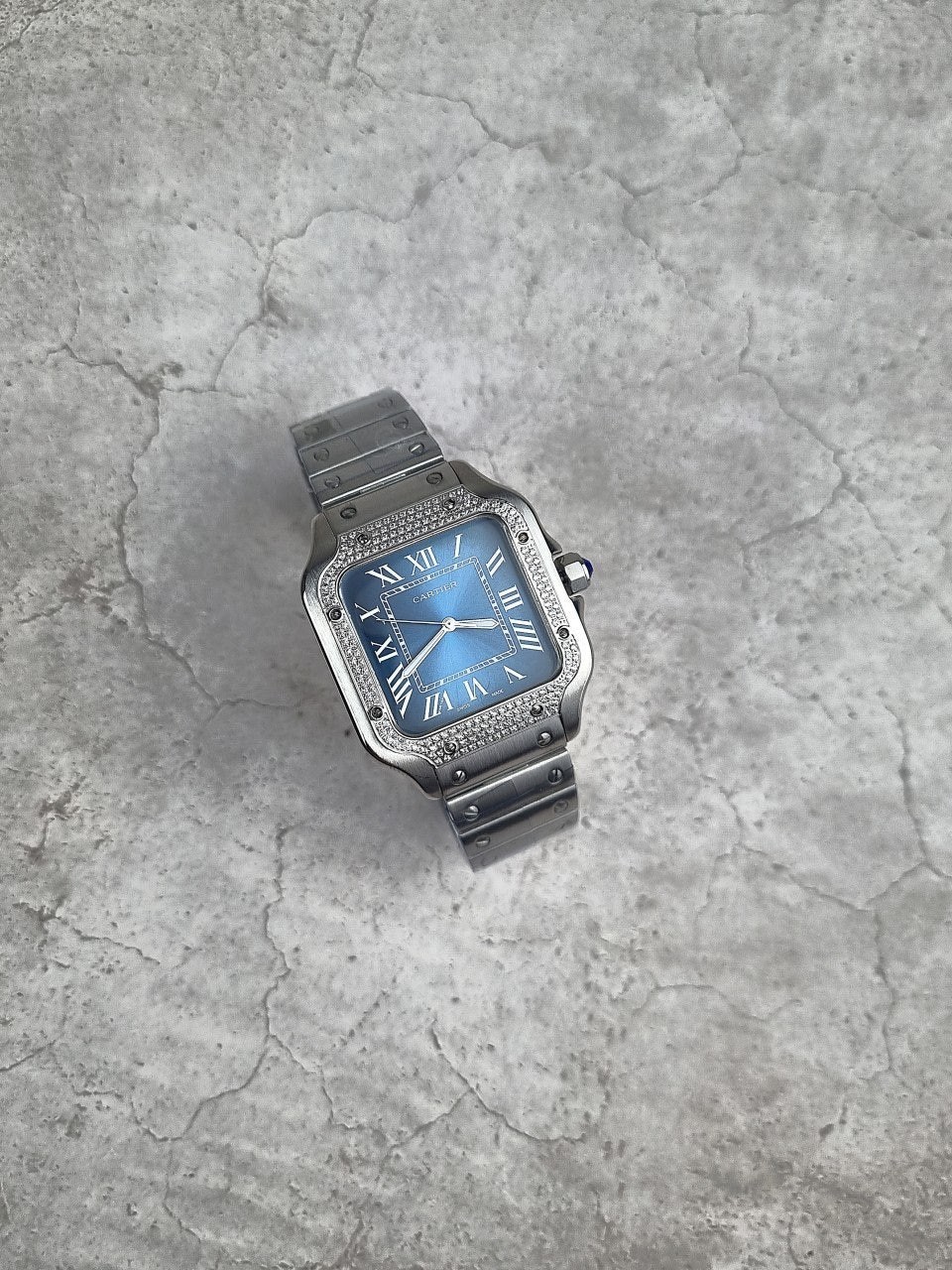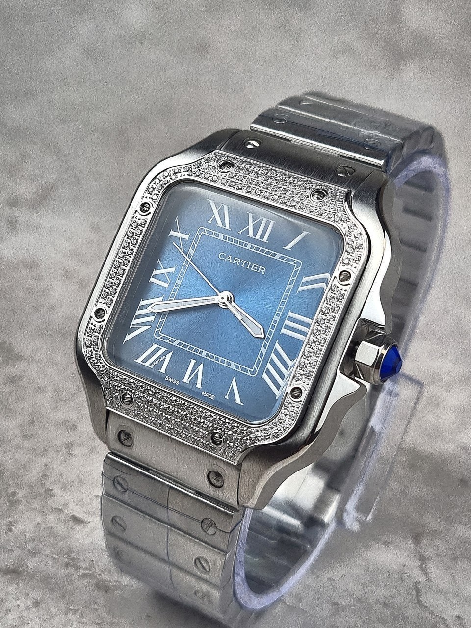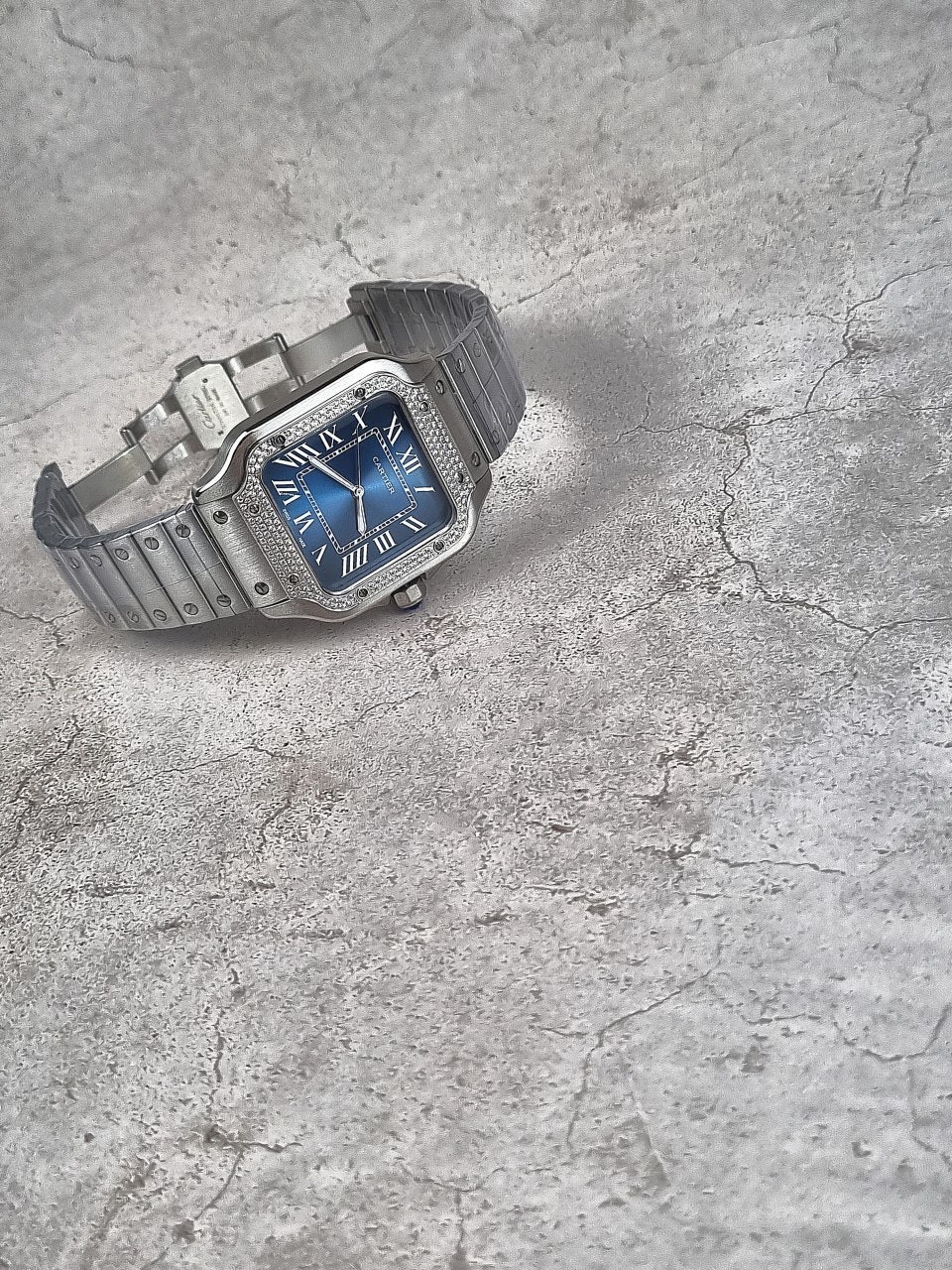 이번에 소개해드릴 시계는 까*** 산토스 블루다이얼 다이아몬드 셋팅 입니다. 산토스는 의미가 깊은데요 최초의 손목시계라는 타이틀이 있는만큼 파일럿워치의 원조의 모습을 보여주는데요 산토스는 브라질 출신의 비행사 알베르토 산토스 뒤몽을 위해 최초로 디자인한 손목시계입니다. 산토스 뒤몽은 비행 도중 간편하게 시간확인을 위해 탄생하였는데요. 사각형의 프레임에 모서리를 곡선처리해주면서 일반적인 사각형의 프레임에서 특징을 더욱 살려주었는데요 케이스와 베젤은 유광과 무광처리를 다르게 해주면서 다른 느낌을 준 모델입니다.