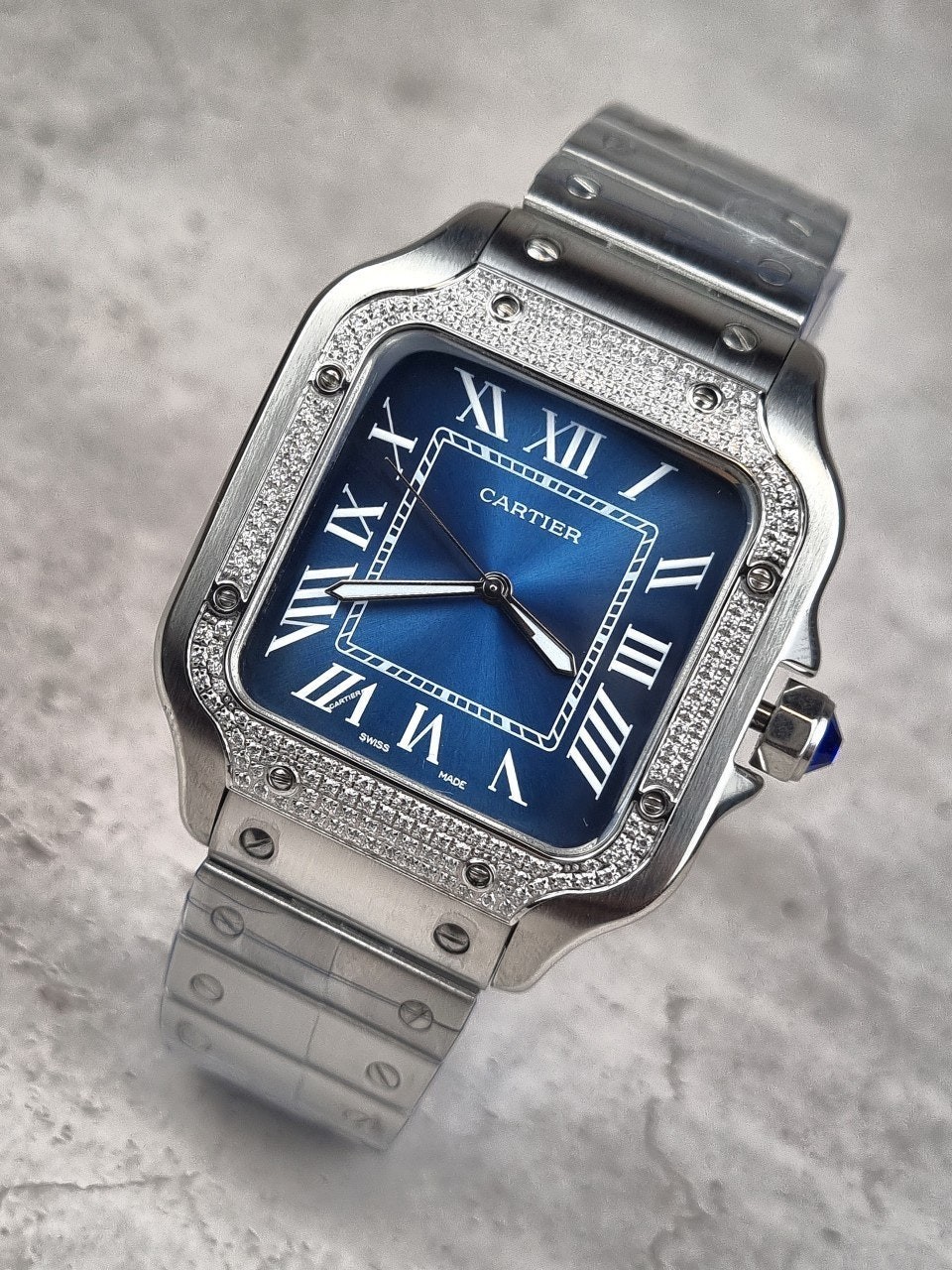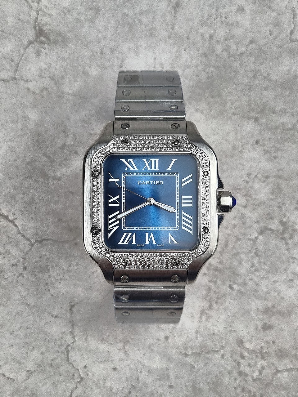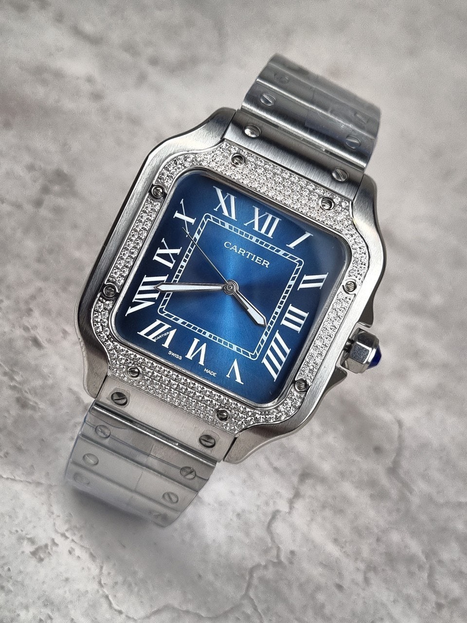 이번에 소개해드릴 시계는 까*** 산토스 블루다이얼 다이아몬드 셋팅 입니다. 산토스는 의미가 깊은데요 최초의 손목시계라는 타이틀이 있는만큼 파일럿워치의 원조의 모습을 보여주는데요 산토스는 브라질 출신의 비행사 알베르토 산토스 뒤몽을 위해 최초로 디자인한 손목시계입니다. 산토스 뒤몽은 비행 도중 간편하게 시간확인을 위해 탄생하였는데요. 사각형의 프레임에 모서리를 곡선처리해주면서 일반적인 사각형의 프레임에서 특징을 더욱 살려주었는데요 케이스와 베젤은 유광과 무광처리를 다르게 해주면서 다른 느낌을 준 모델입니다.
