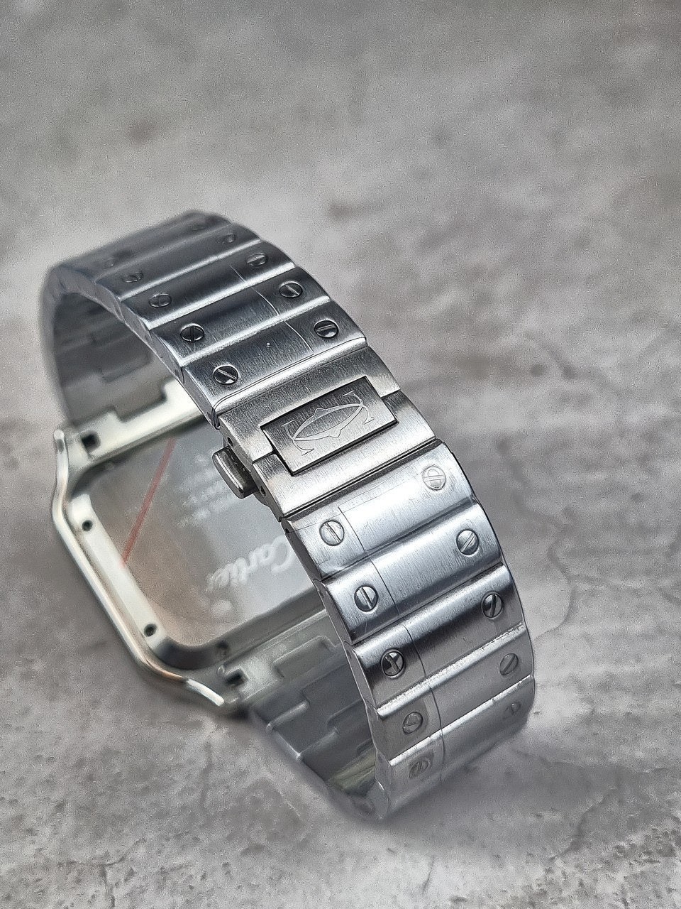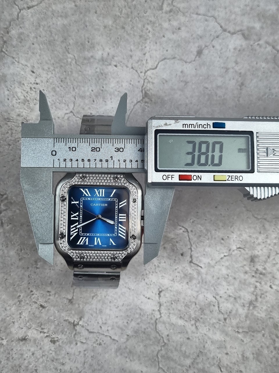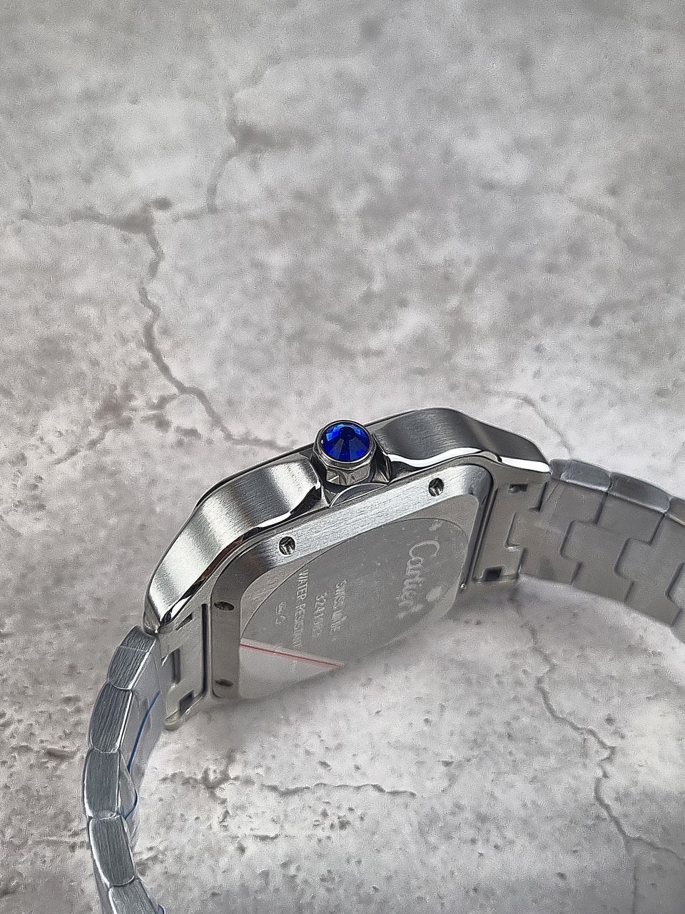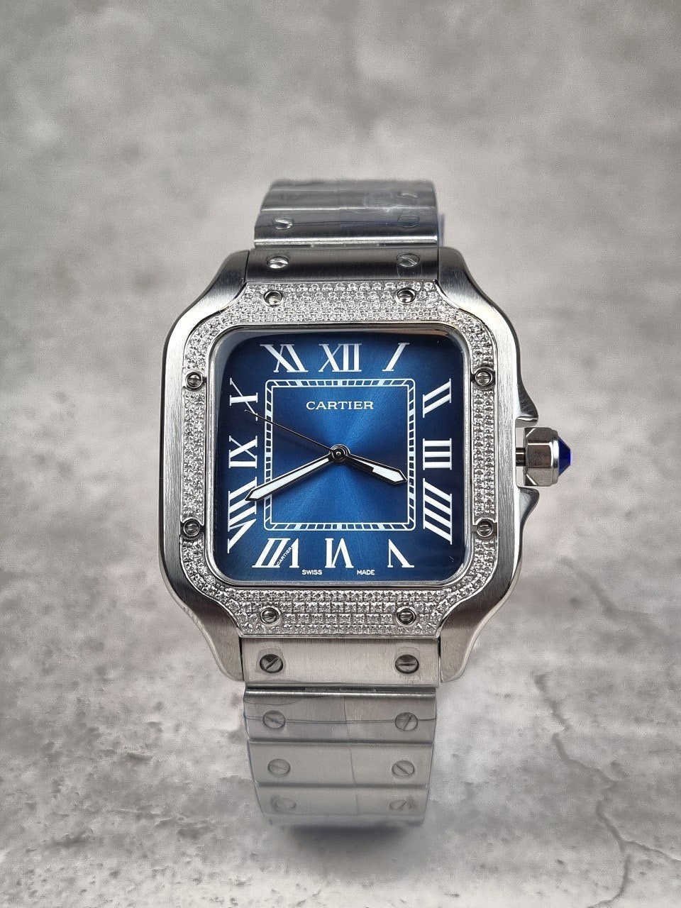 이번에 소개해드릴 시계는 까*** 산토스 블루다이얼 다이아몬드 셋팅 입니다. 산토스는 의미가 깊은데요 최초의 손목시계라는 타이틀이 있는만큼 파일럿워치의 원조의 모습을 보여주는데요 산토스는 브라질 출신의 비행사 알베르토 산토스 뒤몽을 위해 최초로 디자인한 손목시계입니다. 산토스 뒤몽은 비행 도중 간편하게 시간확인을 위해 탄생하였는데요. 사각형의 프레임에 모서리를 곡선처리해주면서 일반적인 사각형의 프레임에서 특징을 더욱 살려주었는데요 케이스와 베젤은 유광과 무광처리를 다르게 해주면서 다른 느낌을 준 모델입니다.