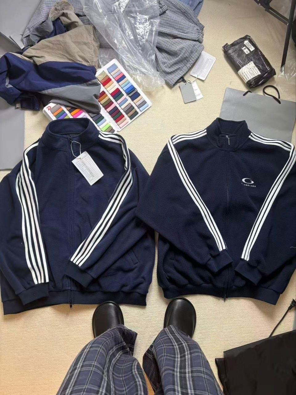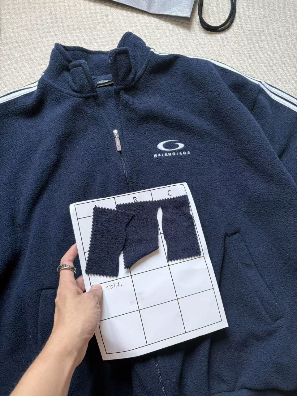•발**** FW25 스탠드 칼라 플리스 ‘스트라이프 다섯 줄’ 자켓은 남녀 모두 착용 가능한 루즈 핏으로, 오리지널을 기반으로 최고 수준으로 개발되었습니다. 원단은 380g급 양면 플리스이며, 염색은 대량(킬로미터 단위) 기준으로 맞춰 컬러 정확도를 높였습니다. 어깨 바인딩은 0.5cm 간격으로 전용 설비를 들여 제작했고, 230g 올코튼으로 바인딩을 재단해 배색 처리까지 더했습니다. 포켓은 2cm 슬릿으로 깔끔하게 열고, 지퍼 주변에는 데코 원단을 덧대어 디테일을 충실히 복원했습니다. 시보리는 본체 색상과 실사 매칭하여 편직했고, 레터링 디테일은 BAILINGDA 자수기로 정교하게 재현했습니다.