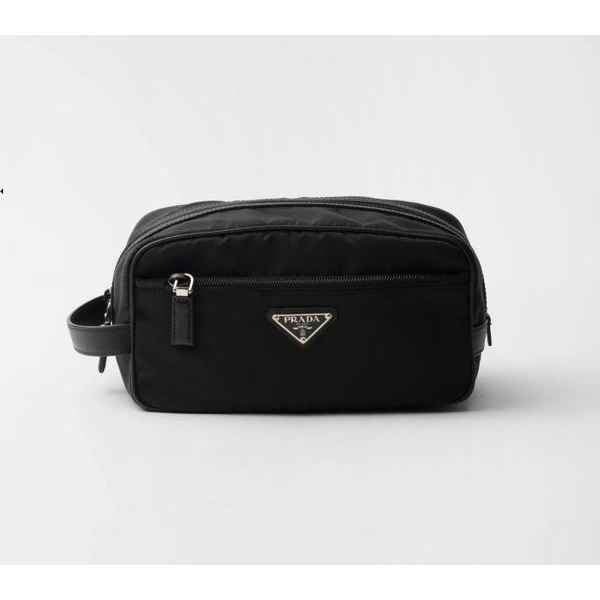 슬릭하고 기능적인 디자인의 트래블 파우치로, 리나일론으로 제작. 에나멜 트라이앵글 로고, 상단 지퍼 클로저가 인상적이며 사피아노 가죽 디테일로 장식했습니다.