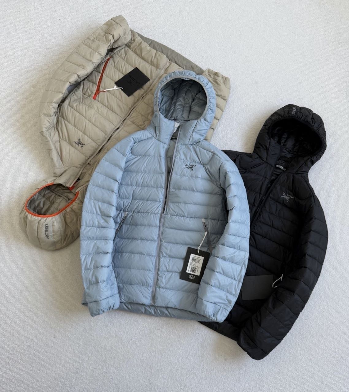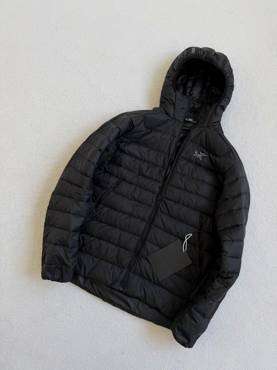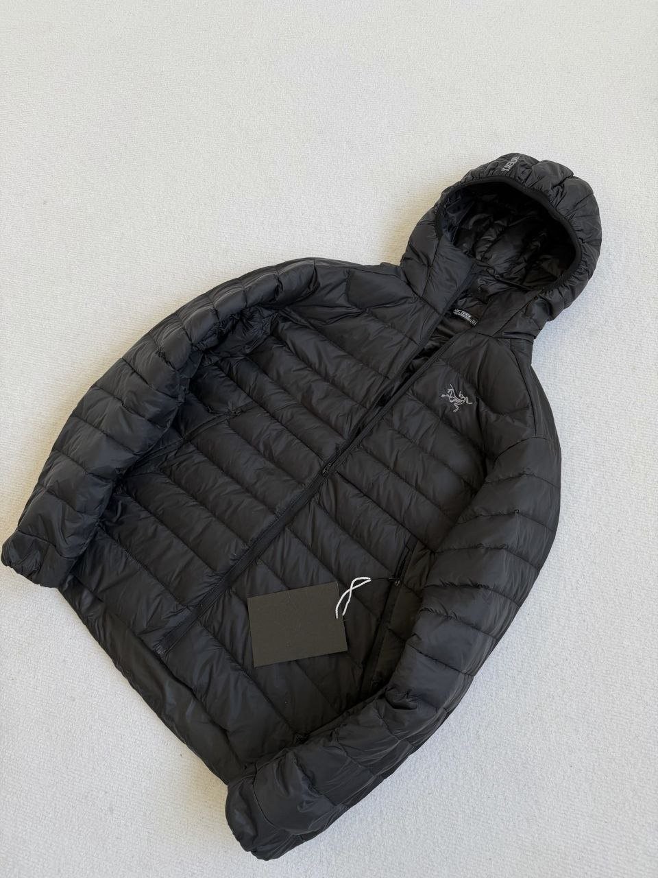 •Arcter**(아크테릭*) Cerium 850 필파워 구스다운 경량 방풍 보온 후드 재킷 입니다. 옷 전체에 초경량 원단과 충전재를 사용해 매우 작게 압축할 수 있으며, 옷 안쪽 가슴 포켓에 내장된 수납 파우치에 넣어 보관할 수 있습니다. 수납 시 크기는 중간 맥주캔(중간 크기 캔) 정도로 작아 휴대가 편리합니다. 초경량으로 활동 시 제약이 거의 없고(제품별·사이즈별 충전량은 약 200–250g 내외로 상이함) 얇지만 보온성과 방풍성은 뛰어납니다. 진정한 다운의 보온성을 잘 살린 제품입니다.