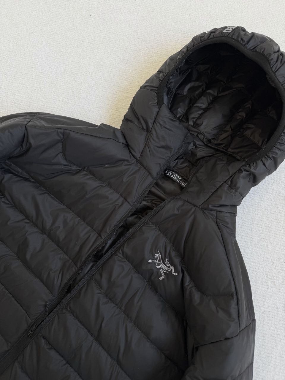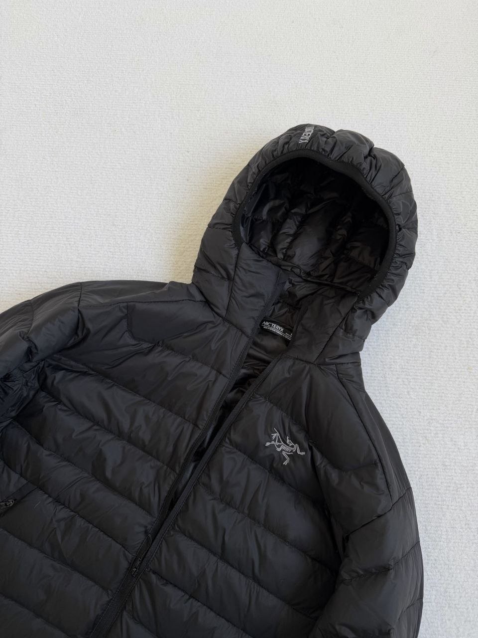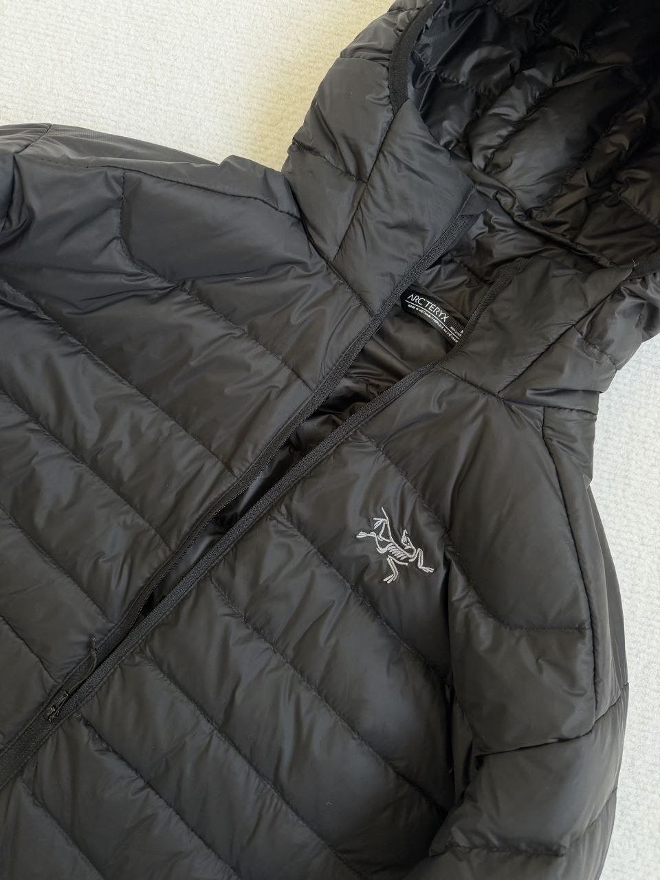 •Arcter**(아크테릭*) Cerium 850 필파워 구스다운 경량 방풍 보온 후드 재킷 입니다. 옷 전체에 초경량 원단과 충전재를 사용해 매우 작게 압축할 수 있으며, 옷 안쪽 가슴 포켓에 내장된 수납 파우치에 넣어 보관할 수 있습니다. 수납 시 크기는 중간 맥주캔(중간 크기 캔) 정도로 작아 휴대가 편리합니다. 초경량으로 활동 시 제약이 거의 없고(제품별·사이즈별 충전량은 약 200–250g 내외로 상이함) 얇지만 보온성과 방풍성은 뛰어납니다. 진정한 다운의 보온성을 잘 살린 제품입니다.