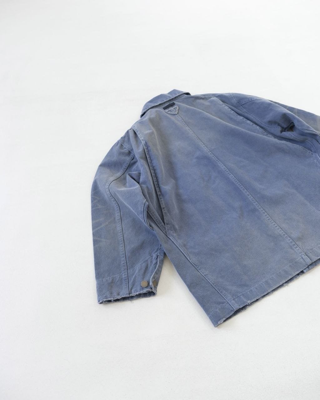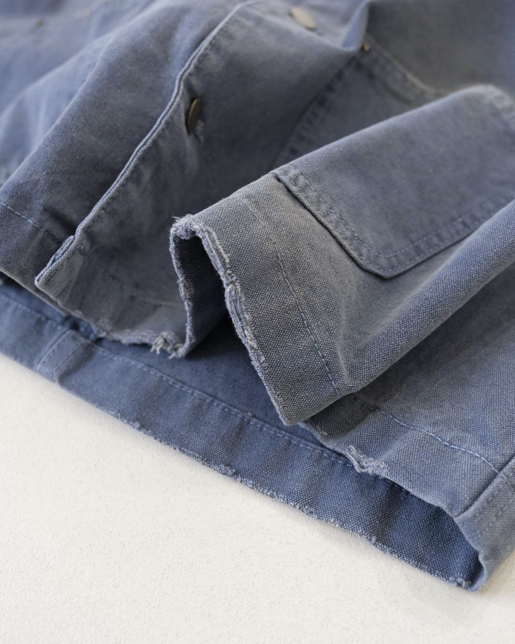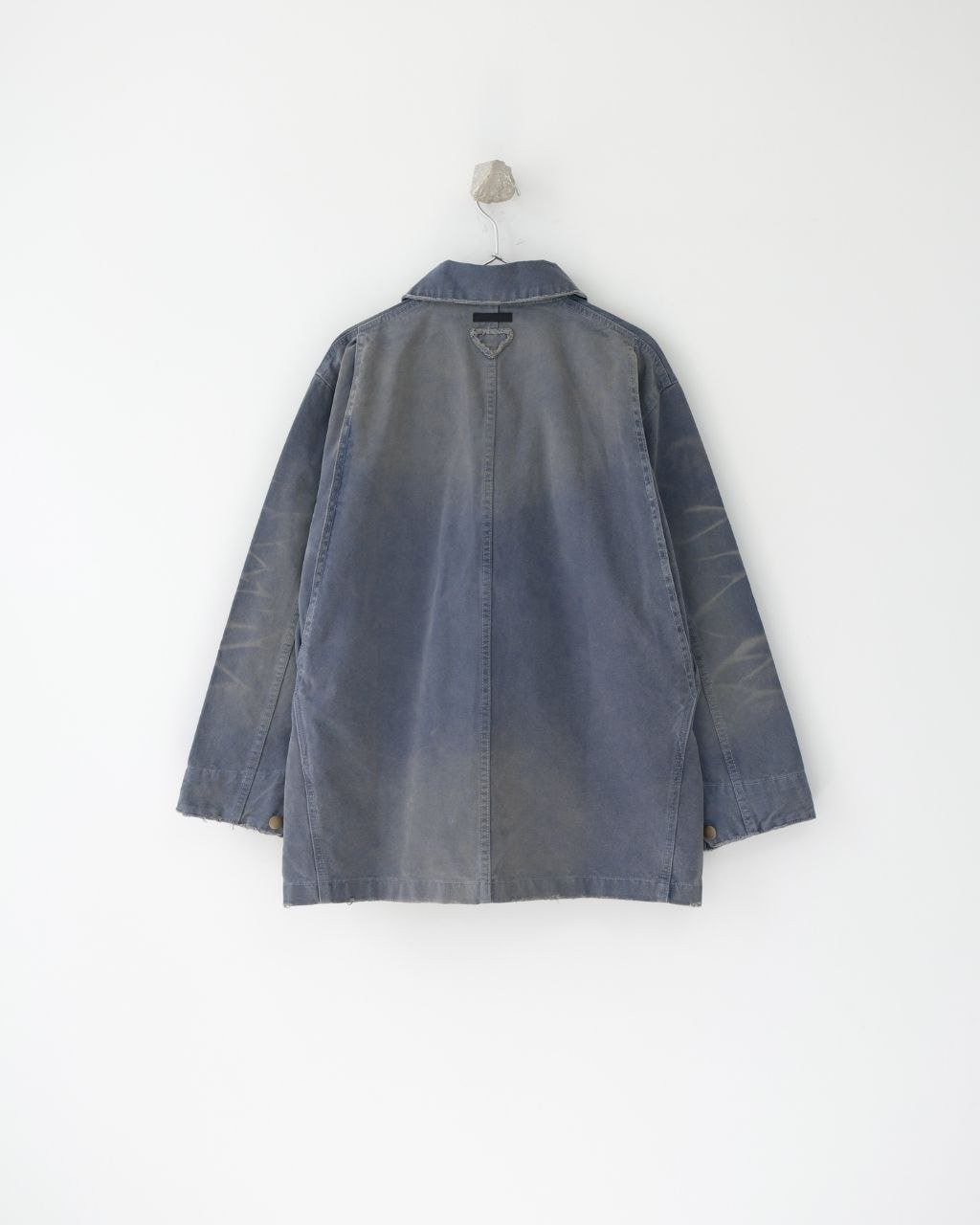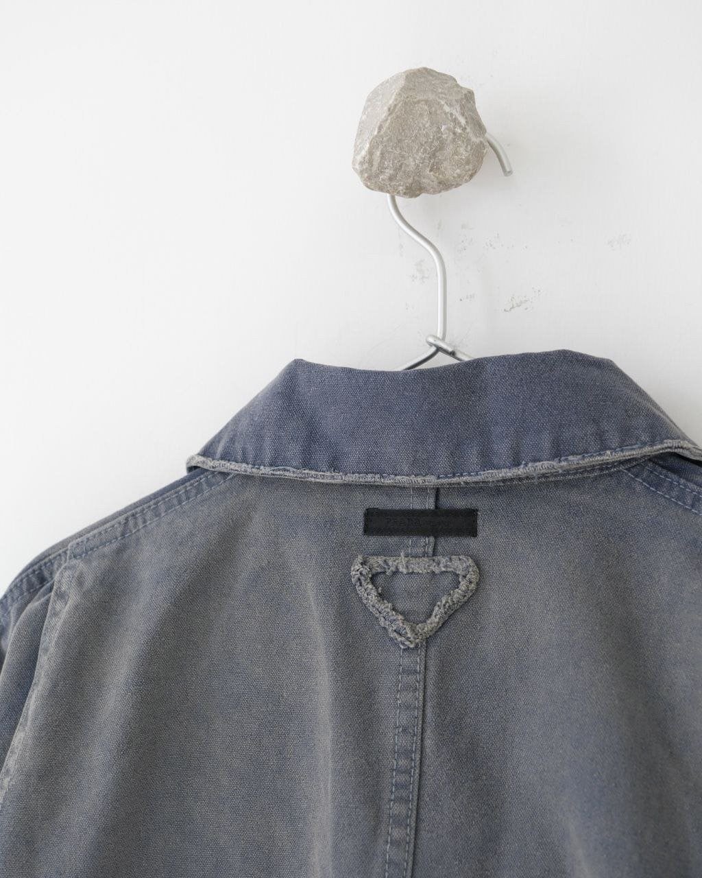 •오리지널 레퍼런스를 기반으로 개발되었으며, 고중량 면 캔버스를 사용했습니다. 특수 무두질과 선축 가공을 통해 형태는 단단하게 잡아주면서 내구성을 높였습니다. 여러 단계의 수작업 데미지 공정을 적용했는데, 사포 샌딩, 효소 워싱으로의 탈색, 가장자리 트리밍(찢김) 처리 등을 통해 칼라, 소매, 밑단 같은 하중이 많이 실리는 부위에 자연스러운 그라데이션 페이딩을 구현하여 장기간 착용한 듯한 빈티지 무드를 재현했습니다.