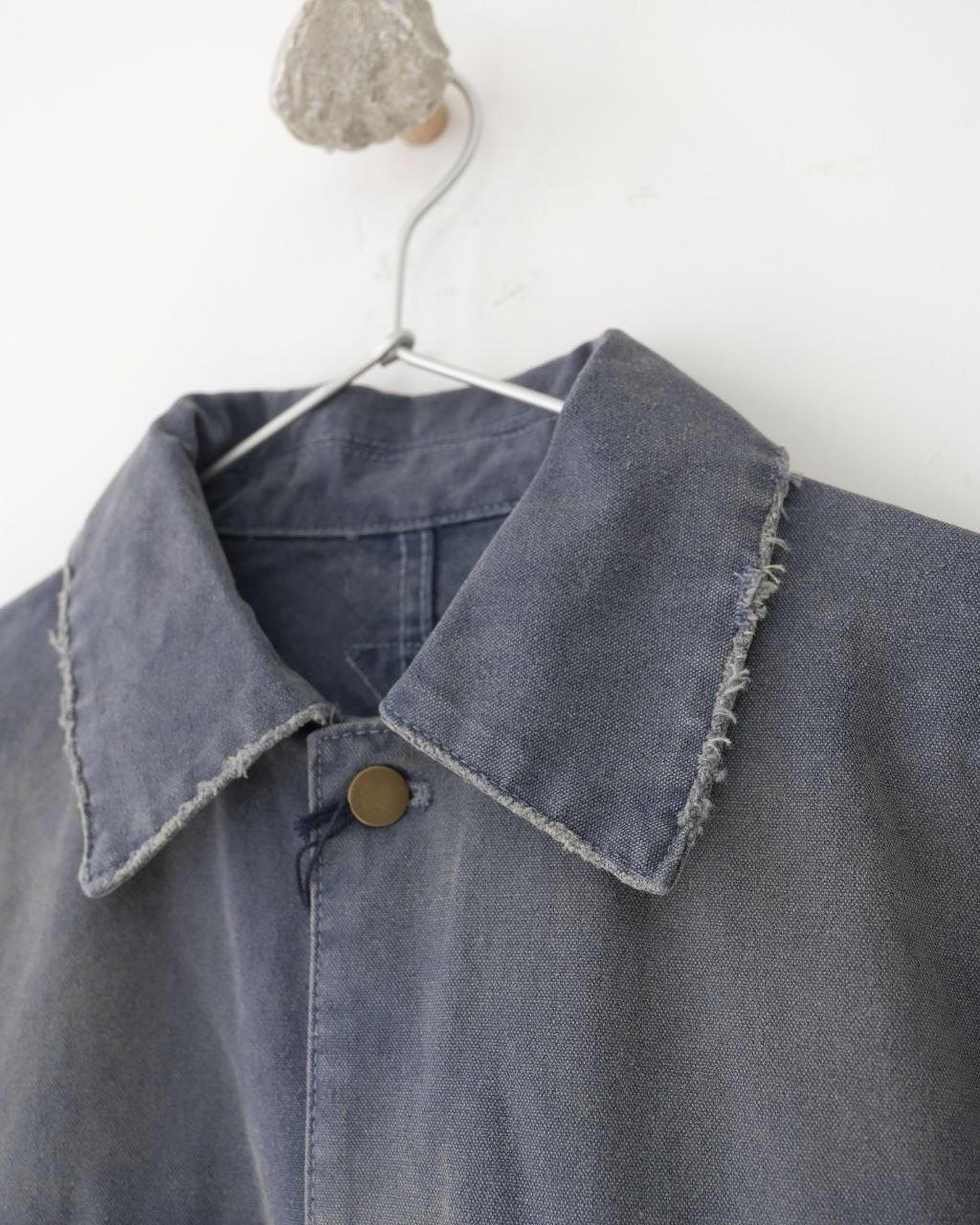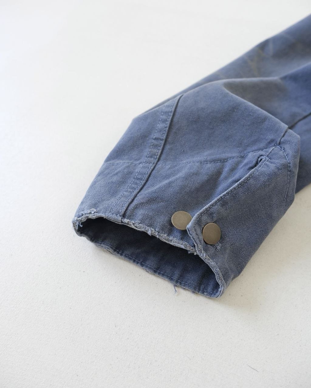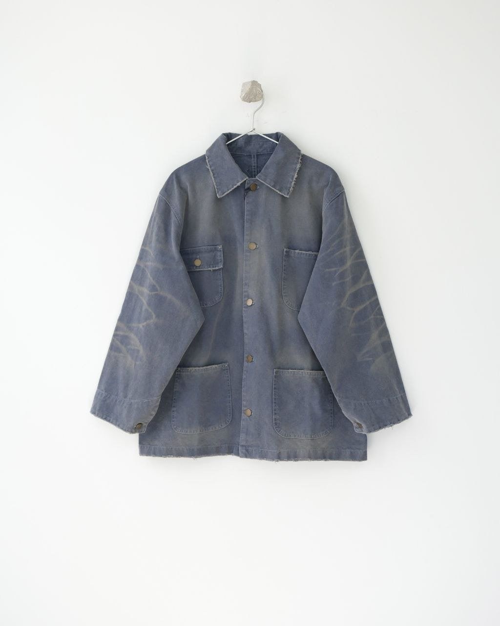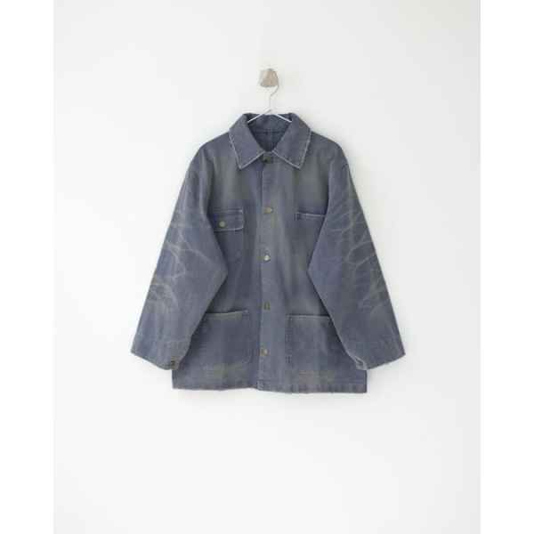•오리지널 레퍼런스를 기반으로 개발되었으며, 고중량 면 캔버스를 사용했습니다. 특수 무두질과 선축 가공을 통해 형태는 단단하게 잡아주면서 내구성을 높였습니다. 여러 단계의 수작업 데미지 공정을 적용했는데, 사포 샌딩, 효소 워싱으로의 탈색, 가장자리 트리밍(찢김) 처리 등을 통해 칼라, 소매, 밑단 같은 하중이 많이 실리는 부위에 자연스러운 그라데이션 페이딩을 구현하여 장기간 착용한 듯한 빈티지 무드를 재현했습니다.