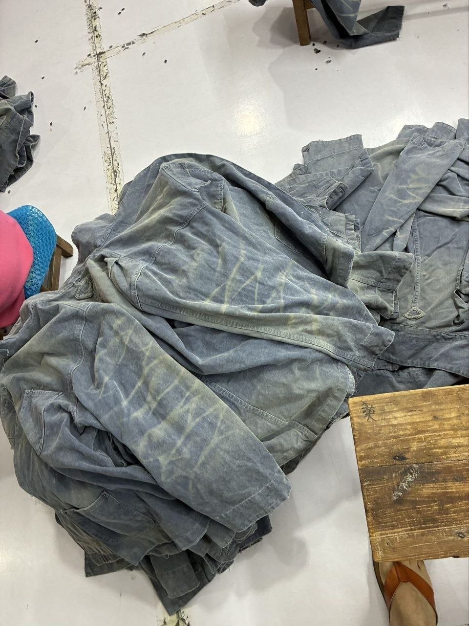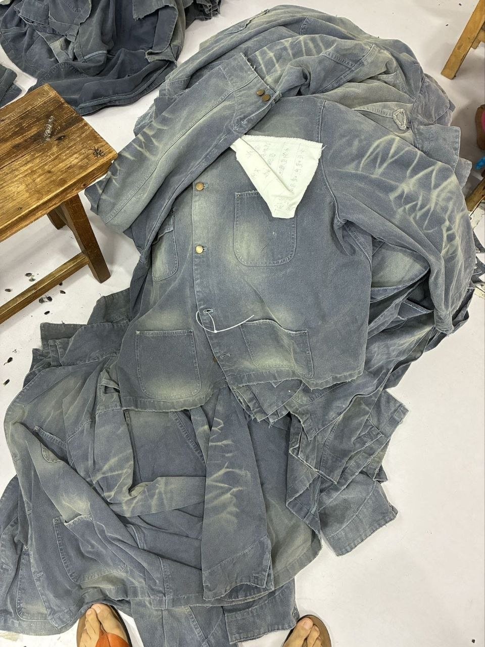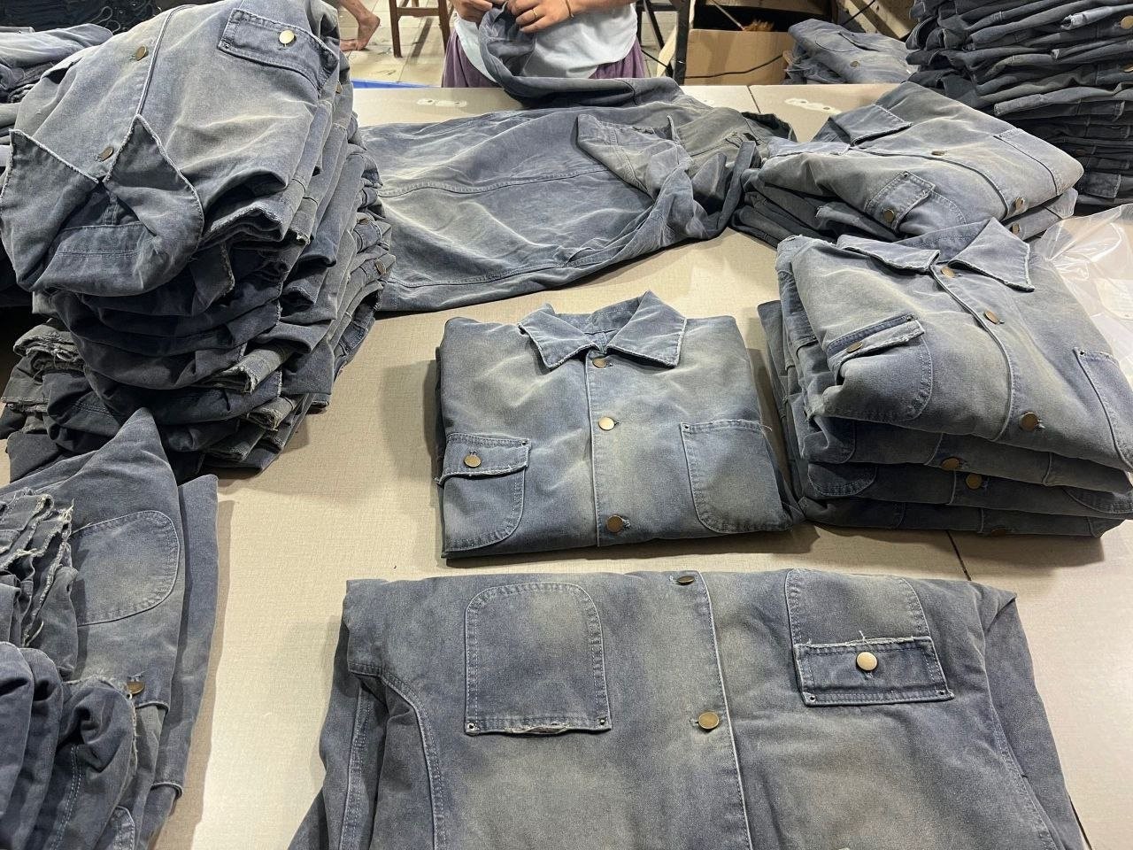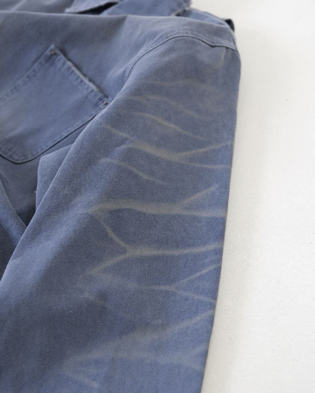 •오리지널 레퍼런스를 기반으로 개발되었으며, 고중량 면 캔버스를 사용했습니다. 특수 무두질과 선축 가공을 통해 형태는 단단하게 잡아주면서 내구성을 높였습니다. 여러 단계의 수작업 데미지 공정을 적용했는데, 사포 샌딩, 효소 워싱으로의 탈색, 가장자리 트리밍(찢김) 처리 등을 통해 칼라, 소매, 밑단 같은 하중이 많이 실리는 부위에 자연스러운 그라데이션 페이딩을 구현하여 장기간 착용한 듯한 빈티지 무드를 재현했습니다.