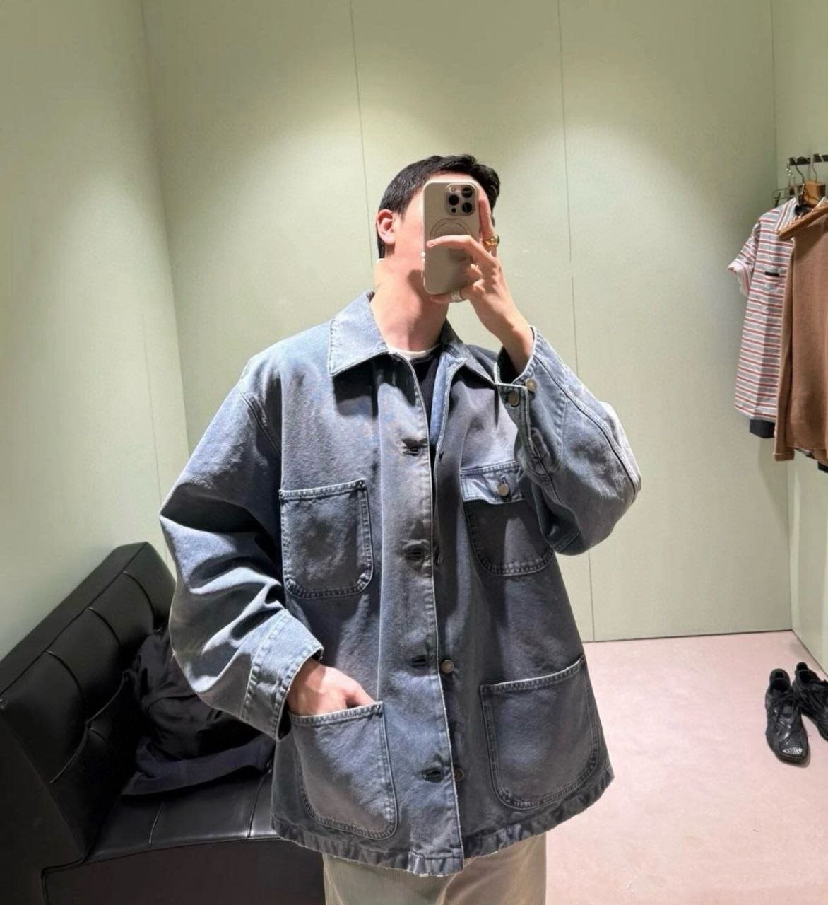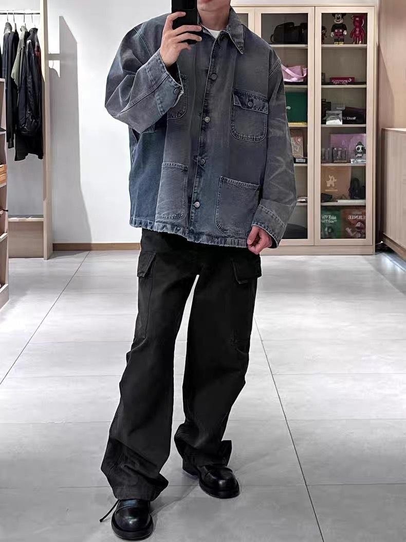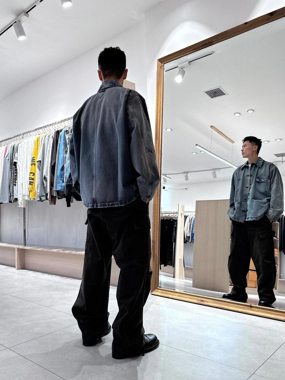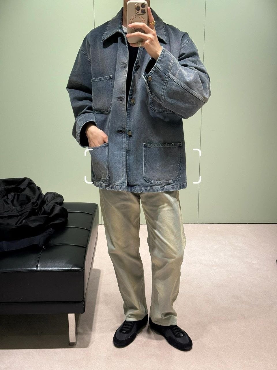 •오리지널 레퍼런스를 기반으로 개발되었으며, 고중량 면 캔버스를 사용했습니다. 특수 무두질과 선축 가공을 통해 형태는 단단하게 잡아주면서 내구성을 높였습니다. 여러 단계의 수작업 데미지 공정을 적용했는데, 사포 샌딩, 효소 워싱으로의 탈색, 가장자리 트리밍(찢김) 처리 등을 통해 칼라, 소매, 밑단 같은 하중이 많이 실리는 부위에 자연스러운 그라데이션 페이딩을 구현하여 장기간 착용한 듯한 빈티지 무드를 재현했습니다.