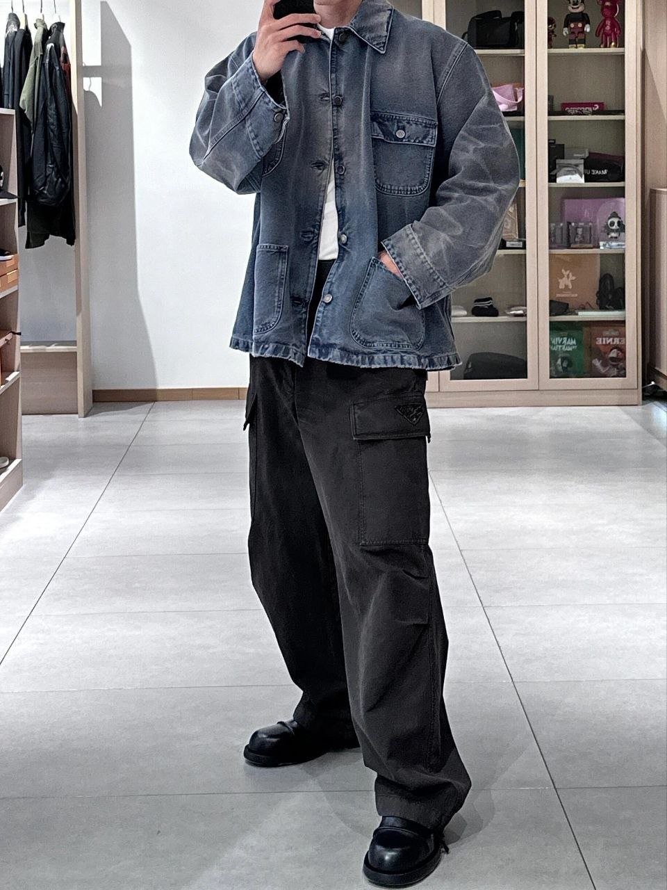 •표면에는 무광 레진 코팅을 더해 캔버스 특유의 거친 질감을 살리면서도 방풍·방오 기능을 강화해 프라*의 ‘기능적 럭셔리’ 철학을 드러냅니다. 주요 봉제에는 럭셔리 스펙의 20/3 합사 고연사 실을, 장식 스티치에는 0.1mm 초미세 폴리에스터 실을 사용해 견고함과 섬세함의 대비를 시각적으로 완성했습니다. 맞춤 제작한 빈티지 무광 금속 부자재에는 바닥면에 PRA** 암각 로고를 새겨 디테일 완성도를 높였습니다. 하이패션의 정밀 엔지니어링으로 워크웨어 아카이브를 해체하고, 런웨이적 빈티지 가공으로 가치를 재해석한 모델입니다. 착용 시 실루엣과 질감이 온전히 드러납니다.