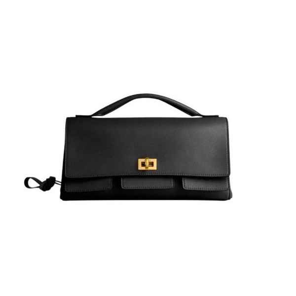 블랙 스무드 카프스킨 소재의 벨 에어 클러치 온 스트랩 스몰, 빈티지 골드 장식