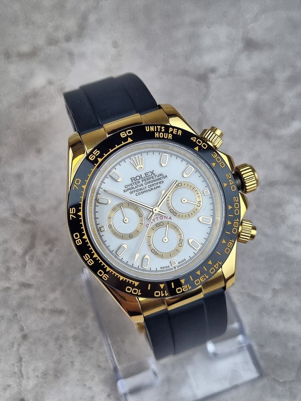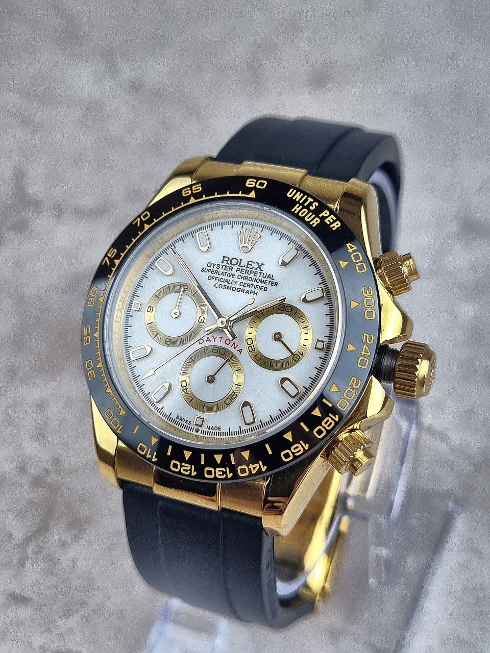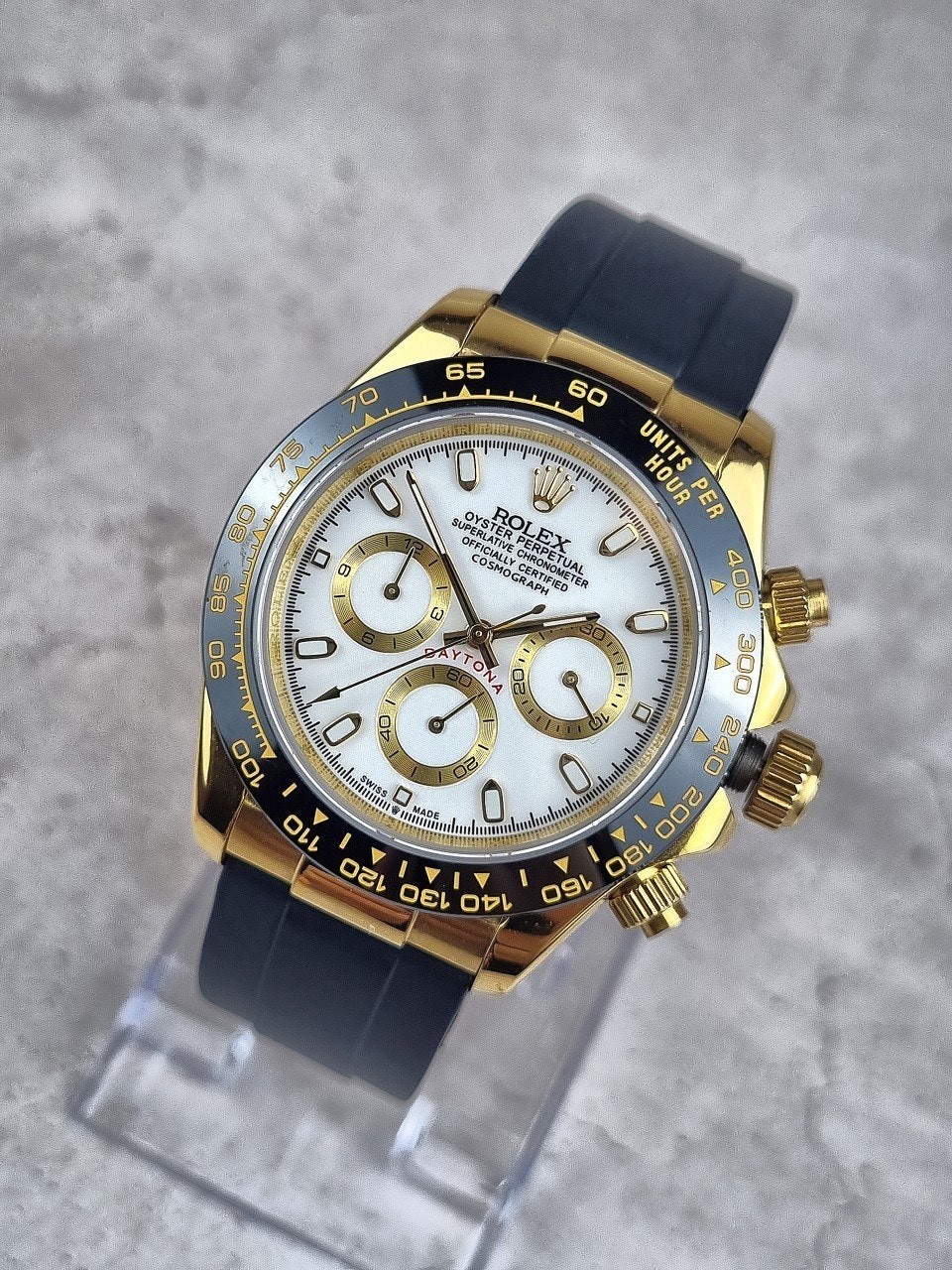 골드색상이 시계 전체를 고루고루 은은하게 비추고 있으면서 블랙 베젤과 화이트다이얼의 조합이 고급스러운 모습을 보이고있습니다. 로**중에서도 꽃이라 해도 과언이 아닌 데이토나 모델은 4계절 매입착용할 수 있는 우레탄스트랩으로 매일매일 함께하고 싶은 마음이 드는 시계입니다.