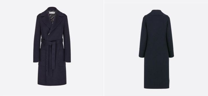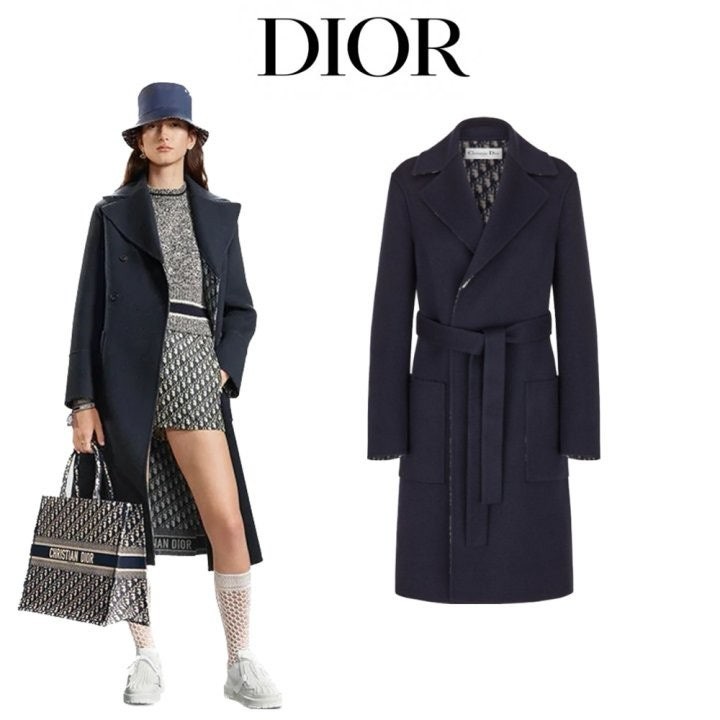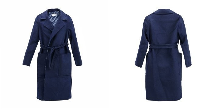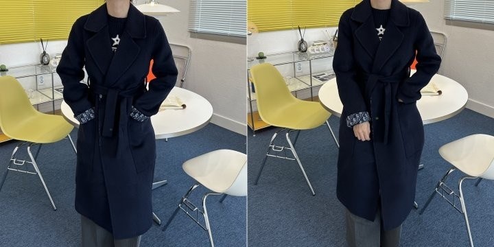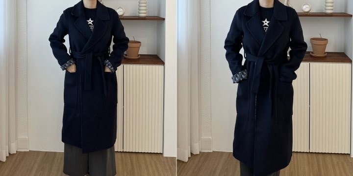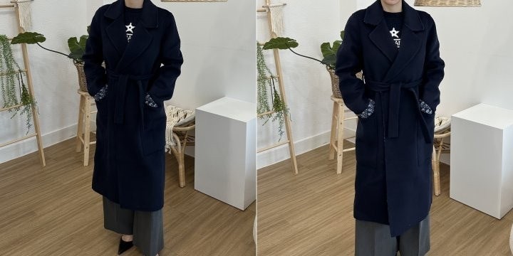 블루 컬러의 경량 양면 울소재로 타이 벨트가 웨이스트를 강조하고