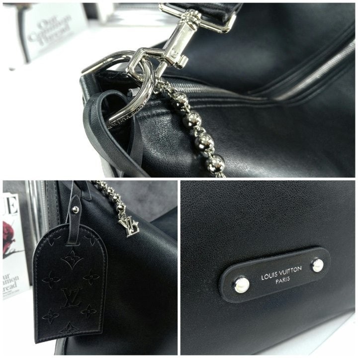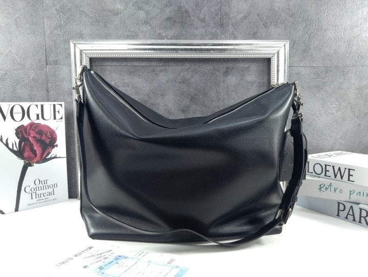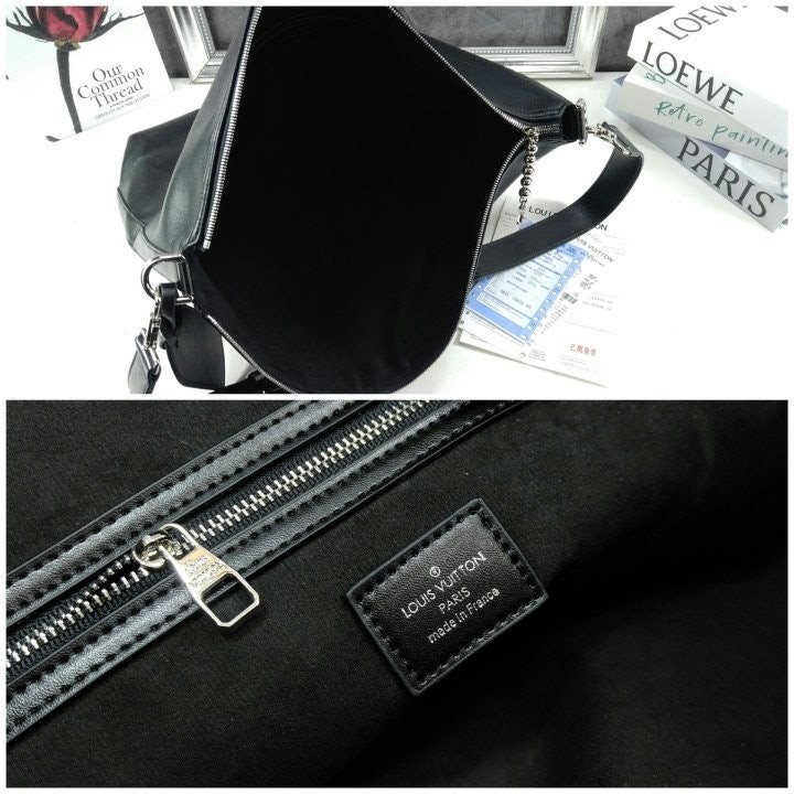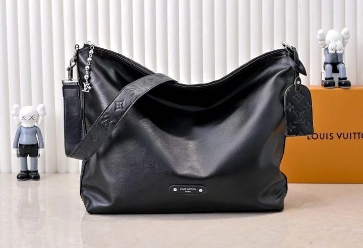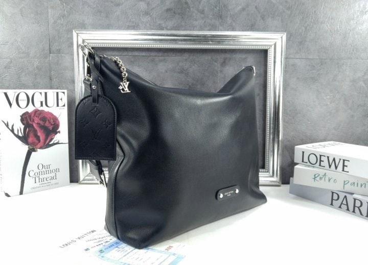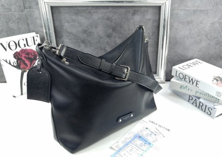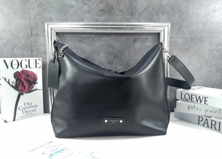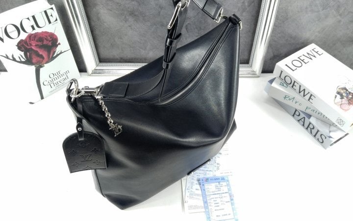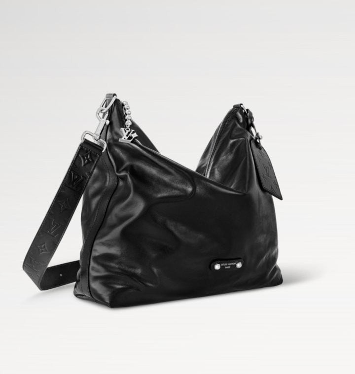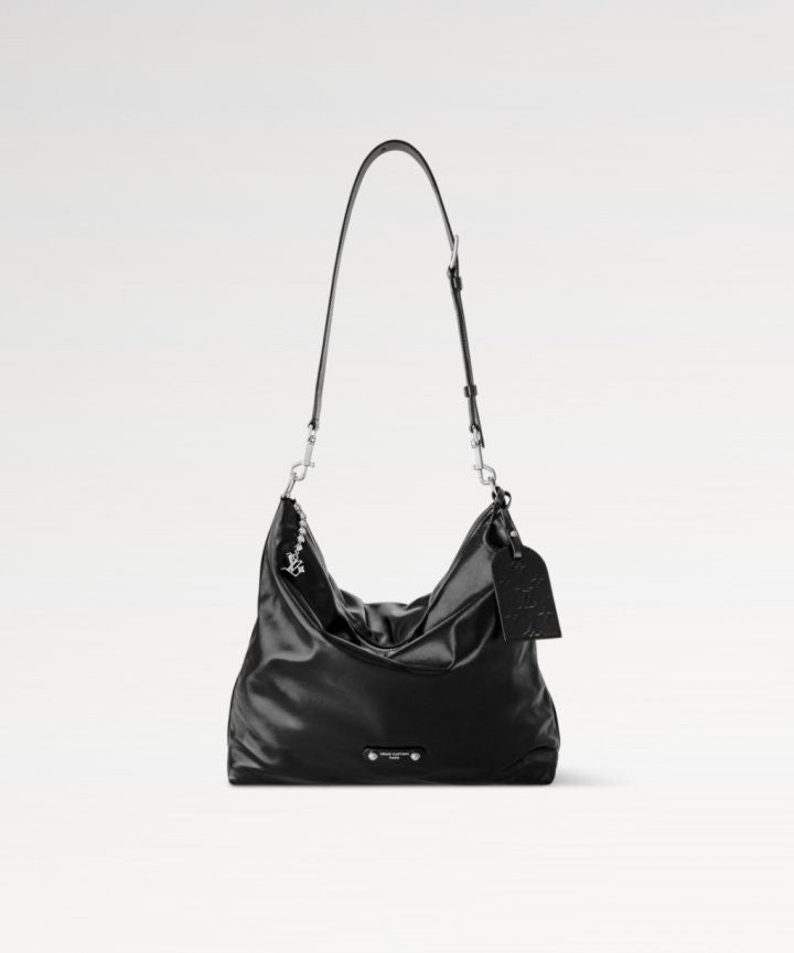 감각이 돋보이는 부드러운 배가본드 호보 백. 블랙 색상의 글로시한 카프스킨 소재와 실버 색상의 하드웨어가 조화를 이루는 디자인. 크로스 바디 백으로 연출하거나 편안한 숄더 스트랩을 활용해 휴대할 수 있는 스타일. 기분 좋은 착용감을 선사하는 인체공학적 형태와 기능성을 겸비한 아이템. 지퍼형 잠금장치. LV 이니셜 참이 달린 볼 체인에 연결된 지퍼 풀러.
