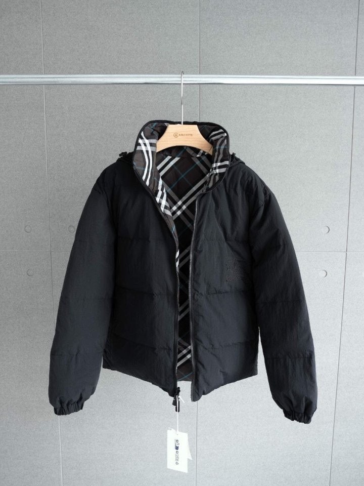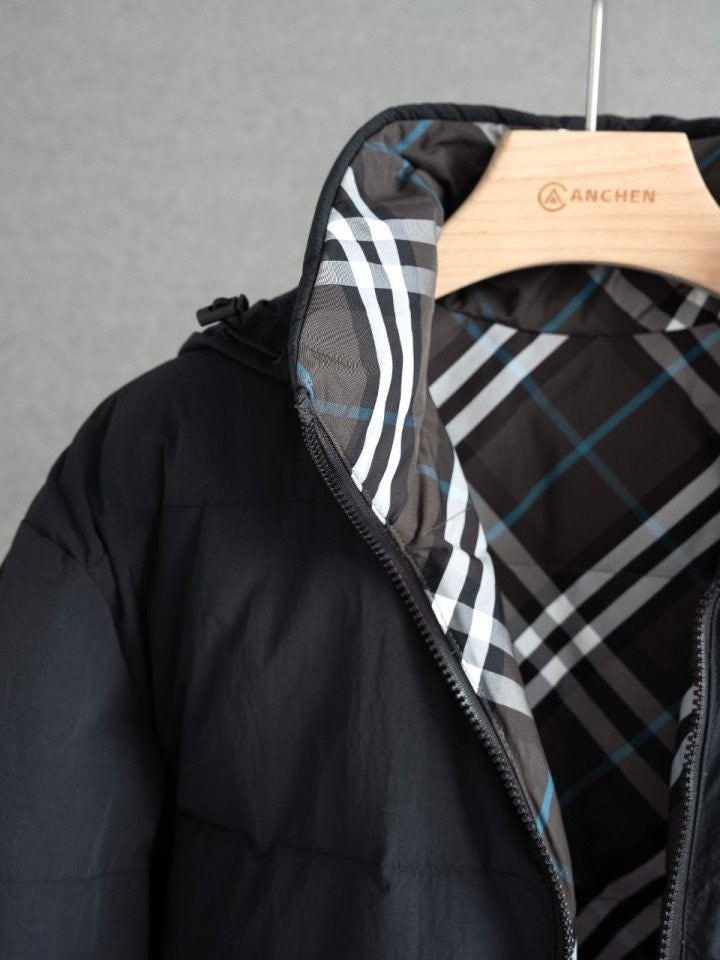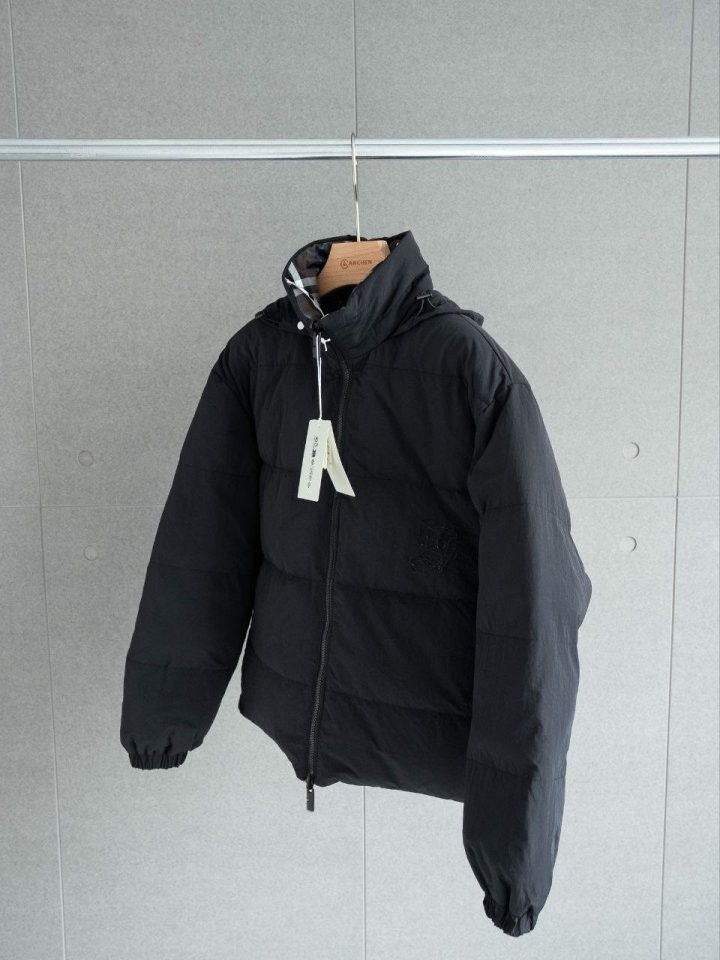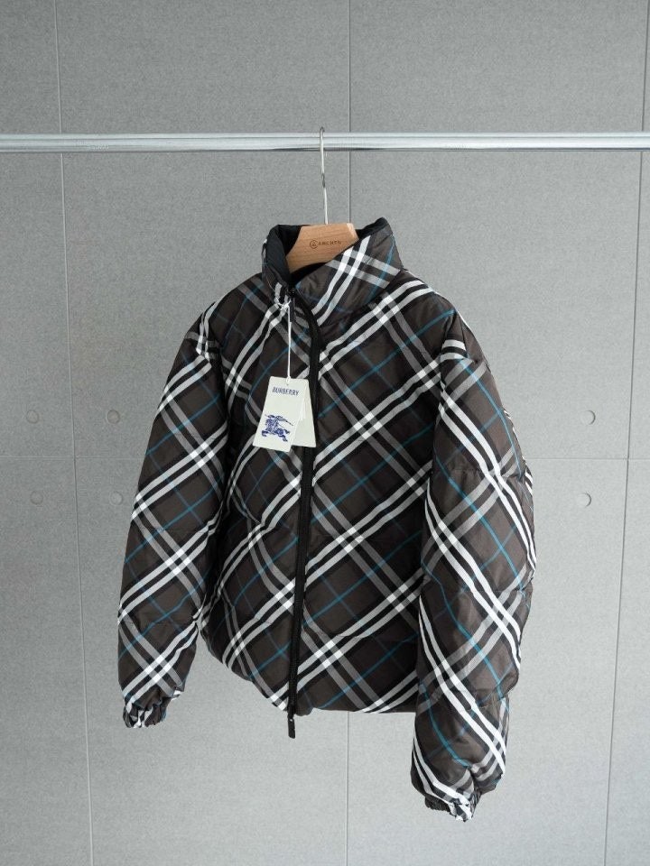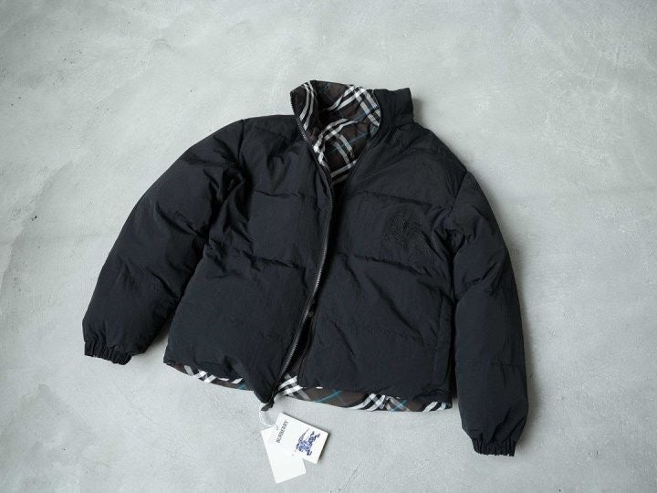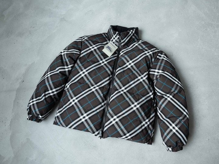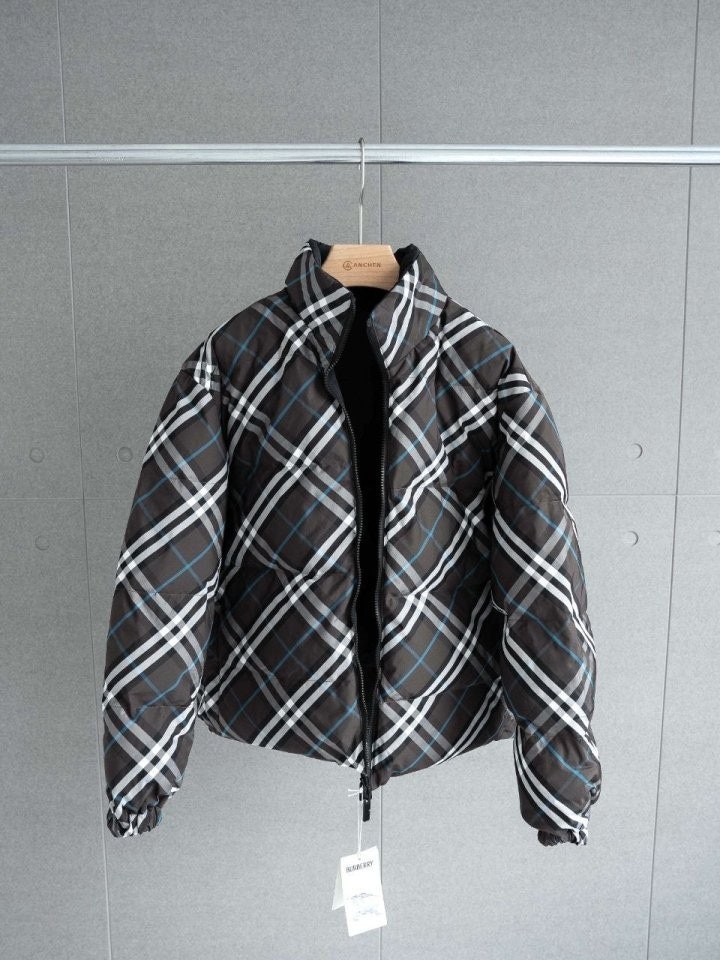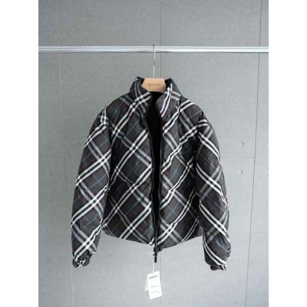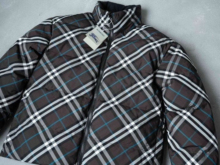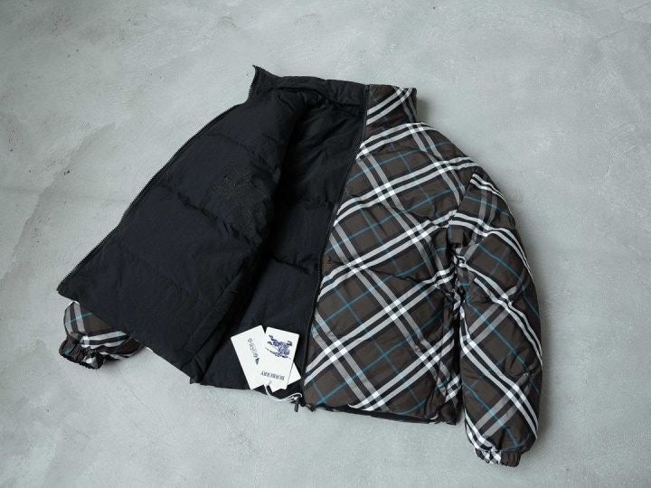 •「인기 제품 지속 판매 중인 스타일 Burber** (버**) Reversible Check Nylon Puffer Jacket 군녹색 체크 양면으로 착용 가능한 스탠드 카라 다운 재킷, 후드는 수납 가능 남녀 공용」