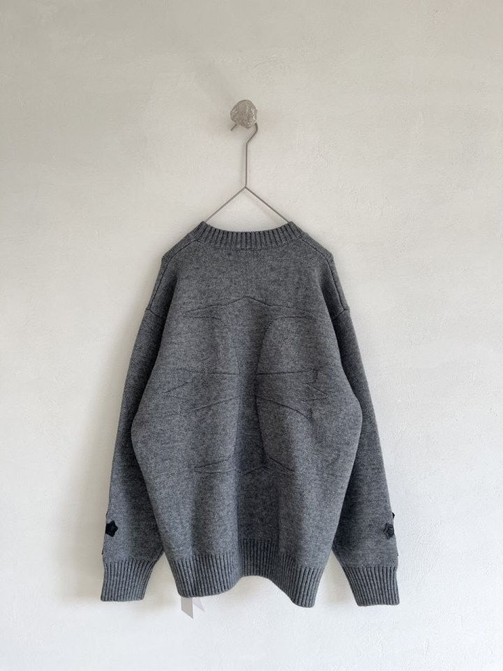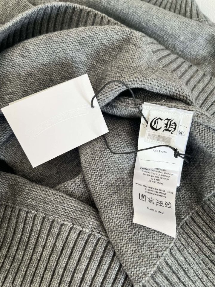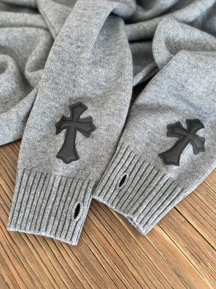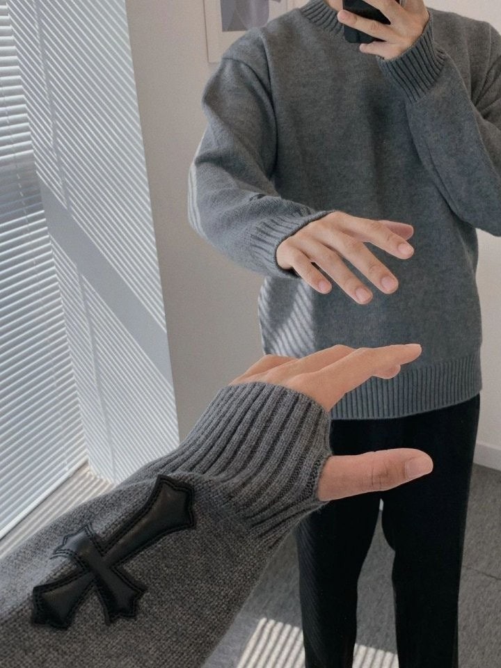 •Chrome Hear** 크* FW 가을·겨울 컬렉션의 십자가 가죽 라벨 입체 인서트 자수 니트 입니다. 회색 100% 양모(울)를 주문 염색·정교하게 편직해 만든 제품입니다. 초정밀 수입 밀편 기술로 촘촘하게 짜여 원단 자체의 두께와 중량감이 충분하며, 원사와 공정 모두 매우 높은 수준으로 완성되어 촉감이 조밀하고 부드러워 피부에 닿는 감이 좋습니다. 통기성과 보온성도 뛰어나 가을·겨울 단품으로 입거나 이너로 활용하기에 매우 쾌적한 착용감을 제공합니다.