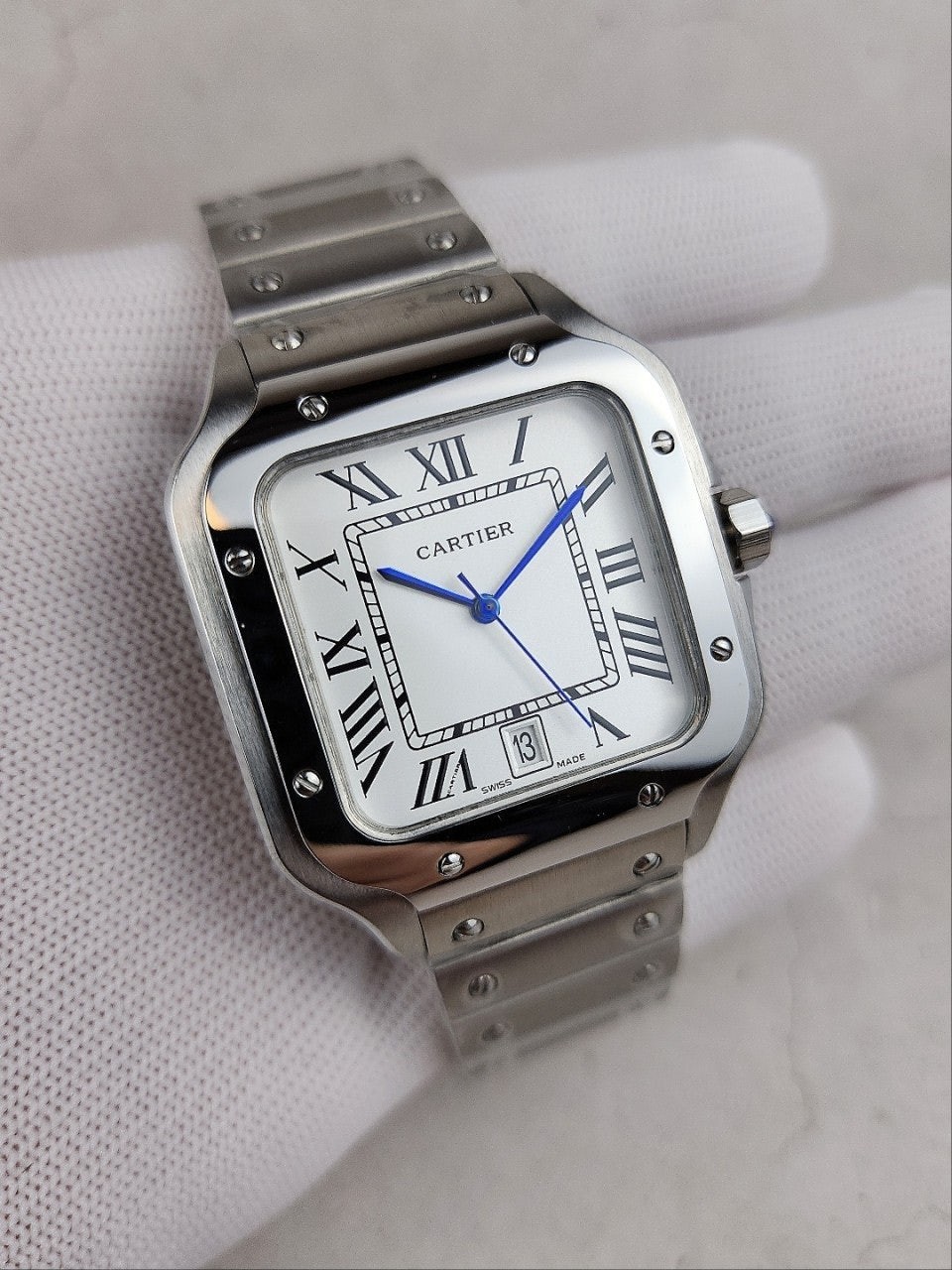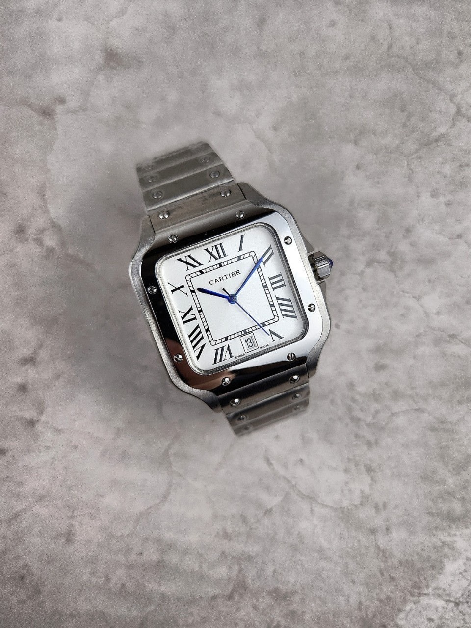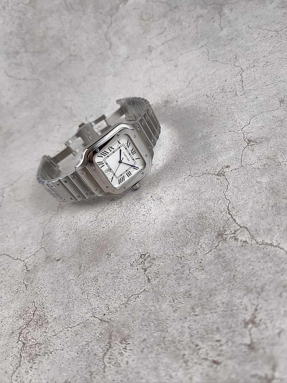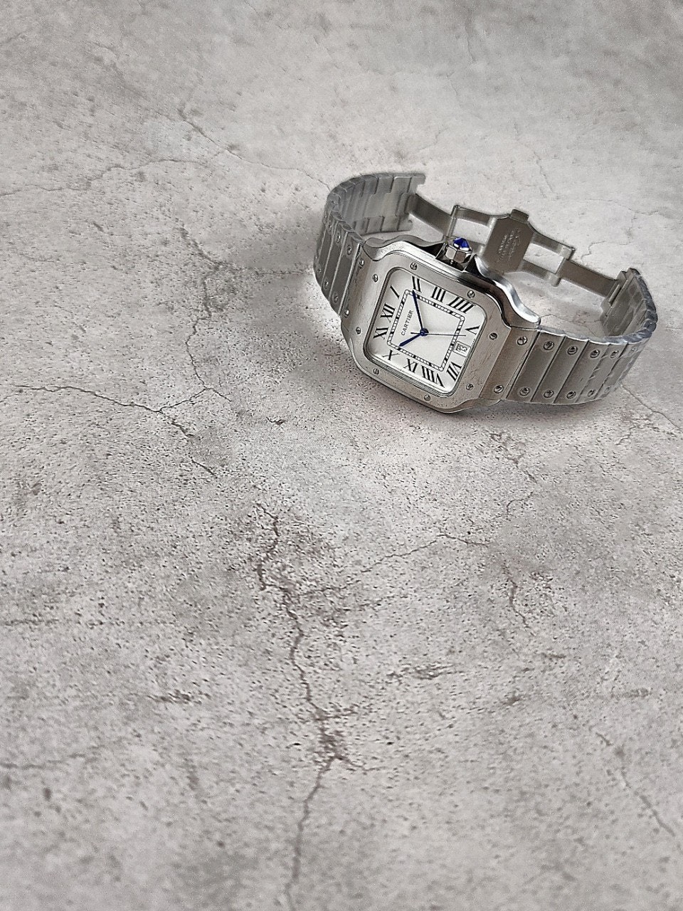 이번에 소개해드릴 시계는 까*** 산토스 화이트다이얼 모델입니다. 왕의 보석함이라고 불렸던 까***는 시게보다 보석세공으로 원래는 유명했지만, 세계최초의 손목시계를 만들어낸 역사와 전통이 깊은 시계입니다. 세계최초란 타이틀을 가지고 있는 손목시계가 바로 이 까*** 산토스 모델인만큼 철길 브레이슬릿과 금장으로 명성에 맞는 디자인을 가지고있습니다.