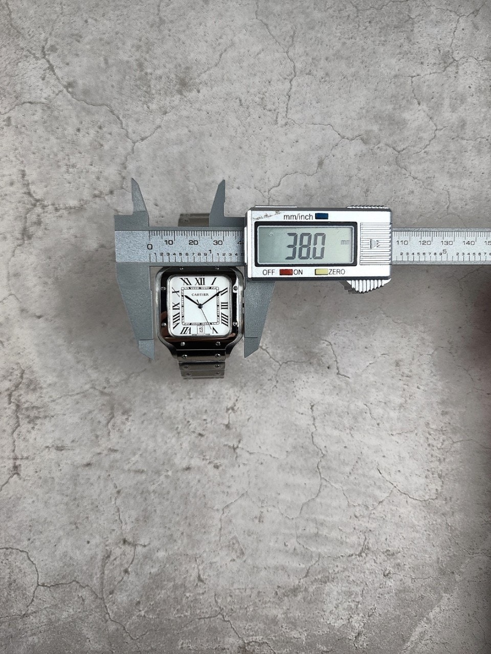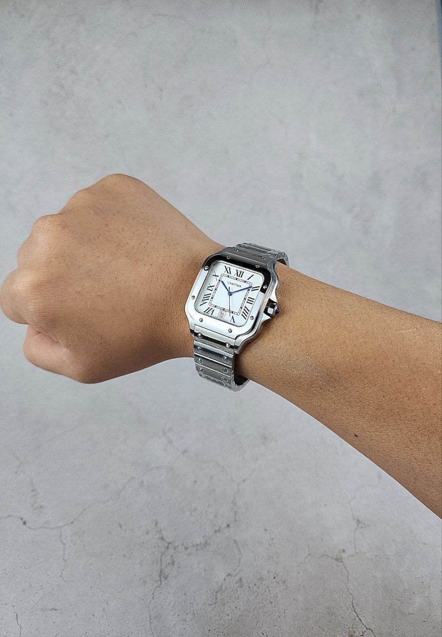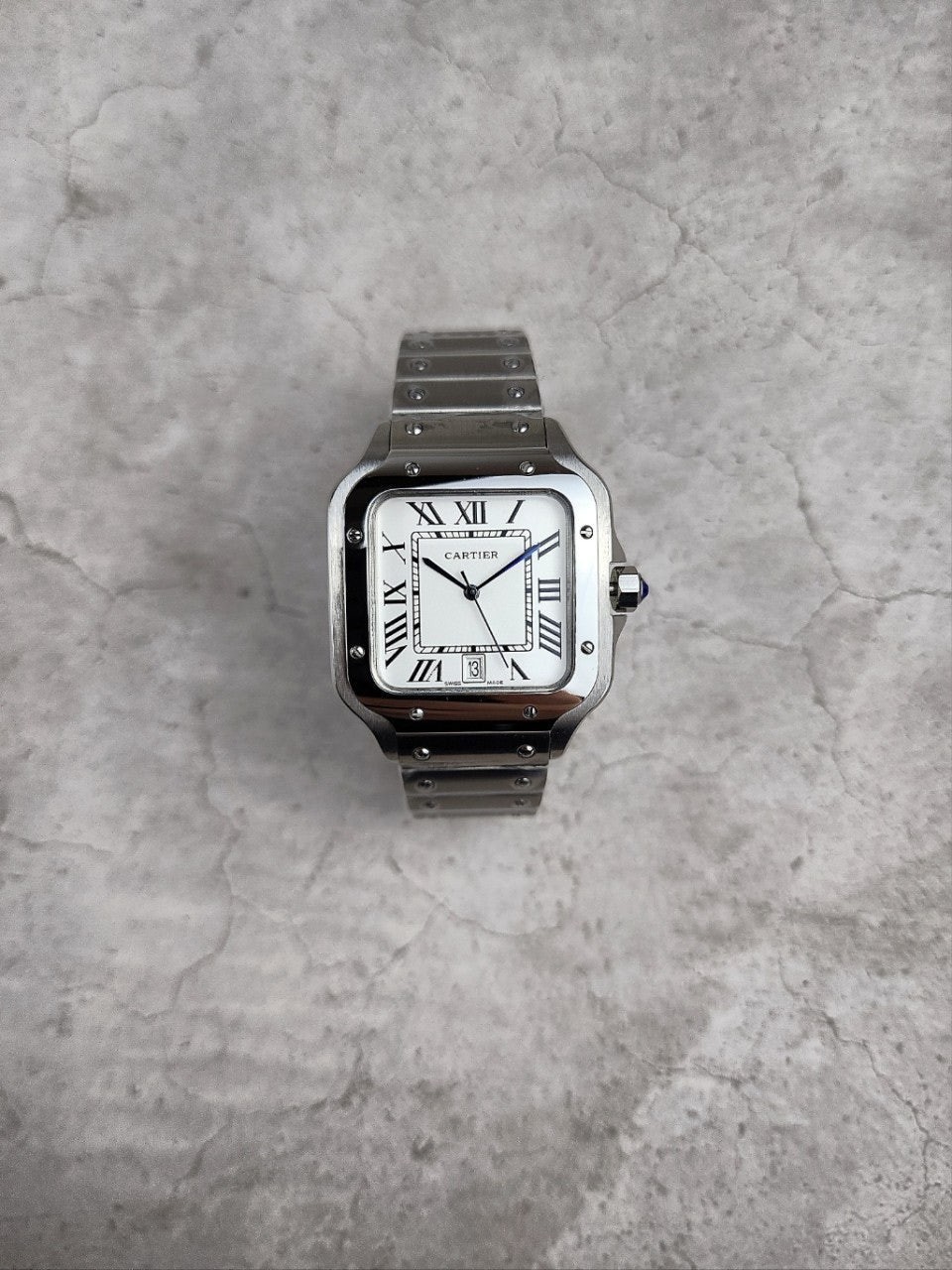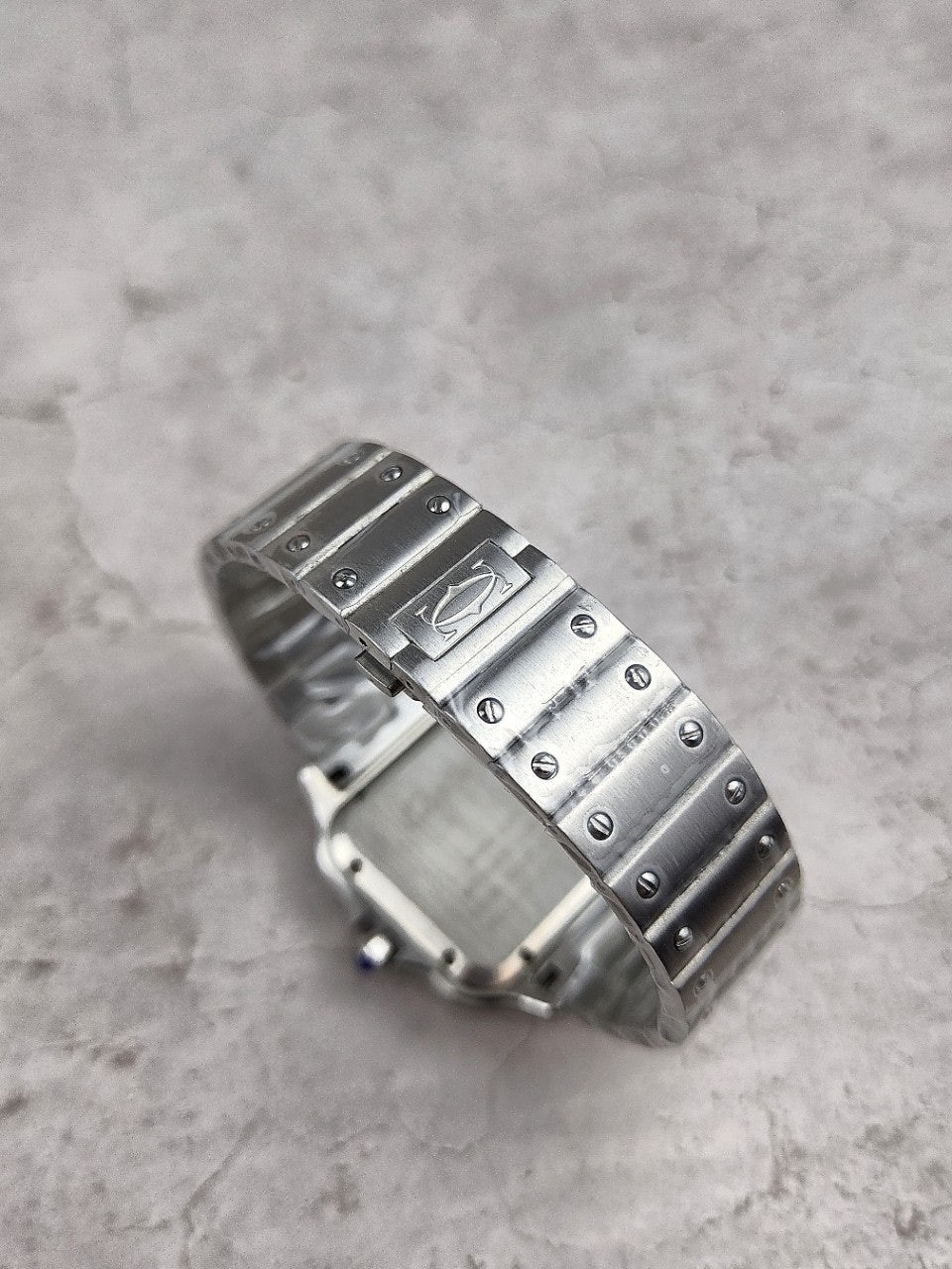 이번에 소개해드릴 시계는 까*** 산토스 화이트다이얼 모델입니다. 왕의 보석함이라고 불렸던 까***는 시게보다 보석세공으로 원래는 유명했지만, 세계최초의 손목시계를 만들어낸 역사와 전통이 깊은 시계입니다. 세계최초란 타이틀을 가지고 있는 손목시계가 바로 이 까*** 산토스 모델인만큼 철길 브레이슬릿과 금장으로 명성에 맞는 디자인을 가지고있습니다.