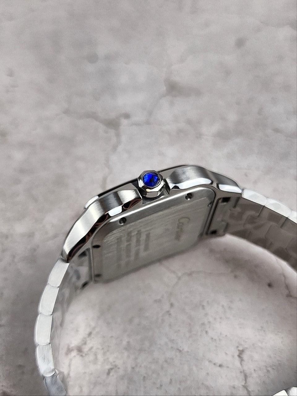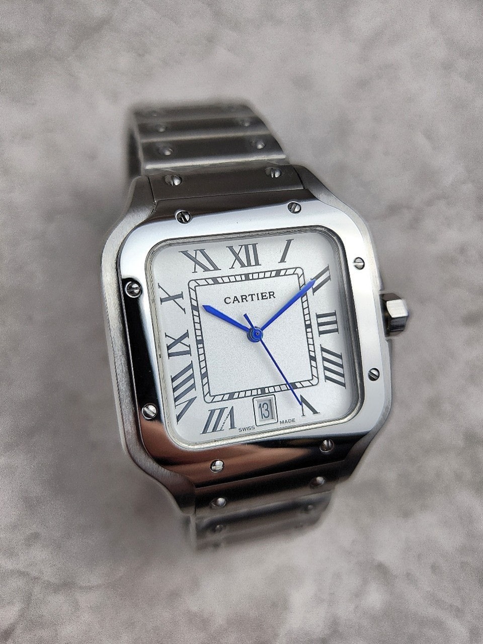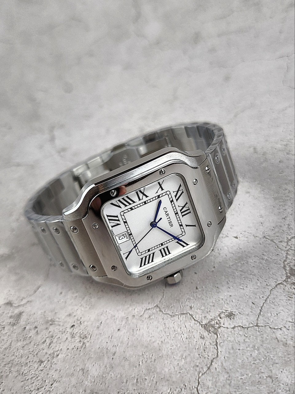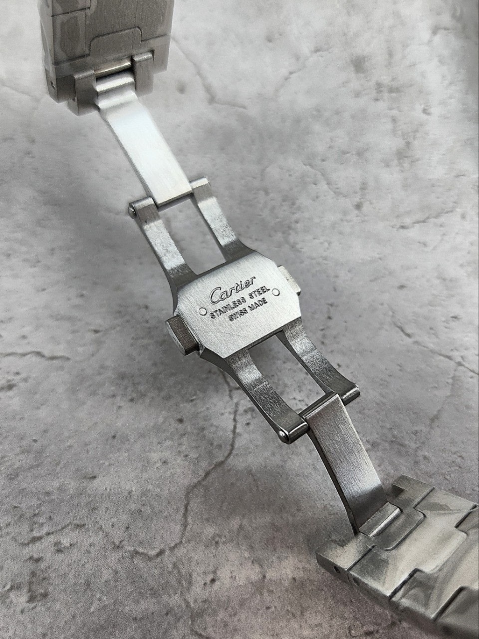 이번에 소개해드릴 시계는 까*** 산토스 화이트다이얼 모델입니다. 왕의 보석함이라고 불렸던 까***는 시게보다 보석세공으로 원래는 유명했지만, 세계최초의 손목시계를 만들어낸 역사와 전통이 깊은 시계입니다. 세계최초란 타이틀을 가지고 있는 손목시계가 바로 이 까*** 산토스 모델인만큼 철길 브레이슬릿과 금장으로 명성에 맞는 디자인을 가지고있습니다.
