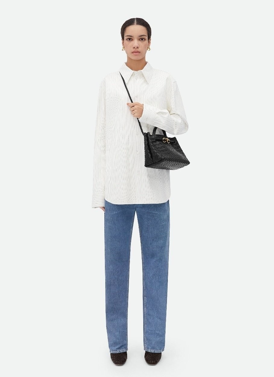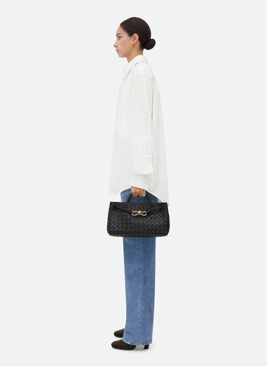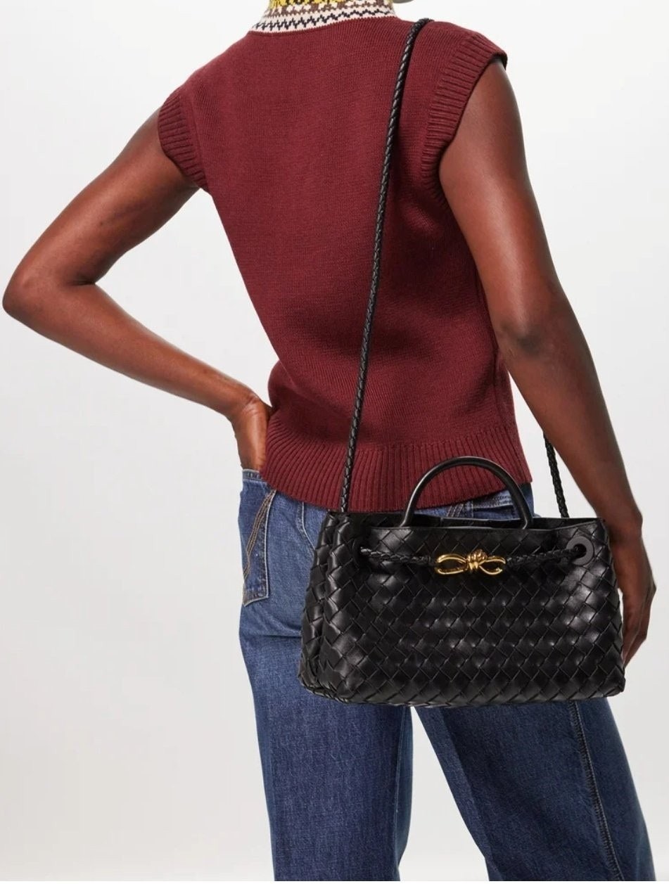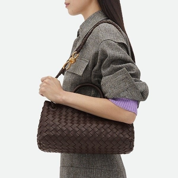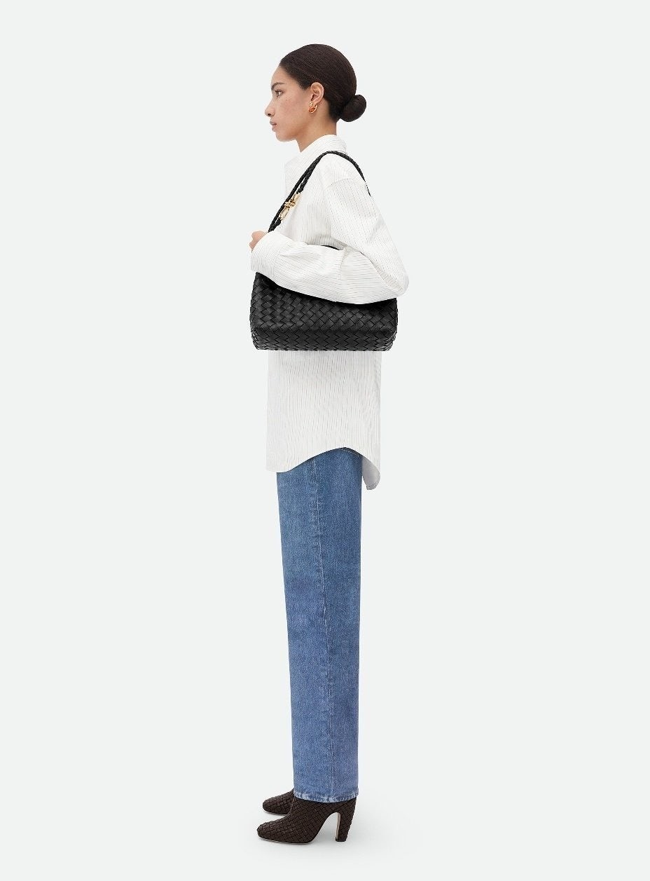 탄력 있는 나파 가죽 소재를 정교한 인트레치아토 위빙으로 완성한 탑 핸들 백으로 긴 실루엣이 특징적이며 슬라이딩 크로스 스트랩과 시그니처 놋 디테일이 있음.