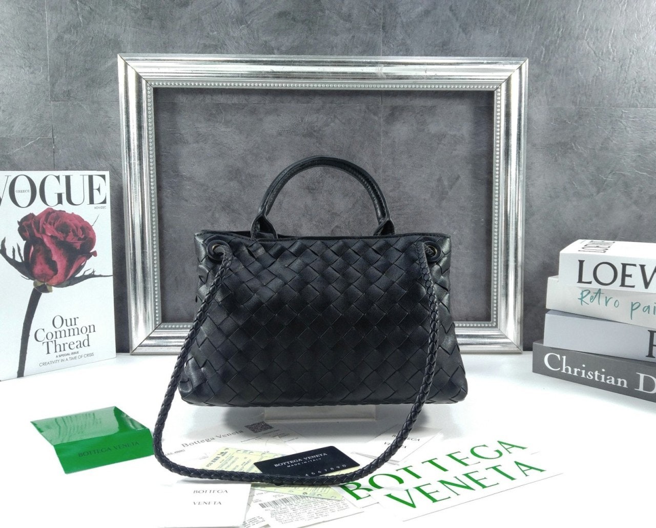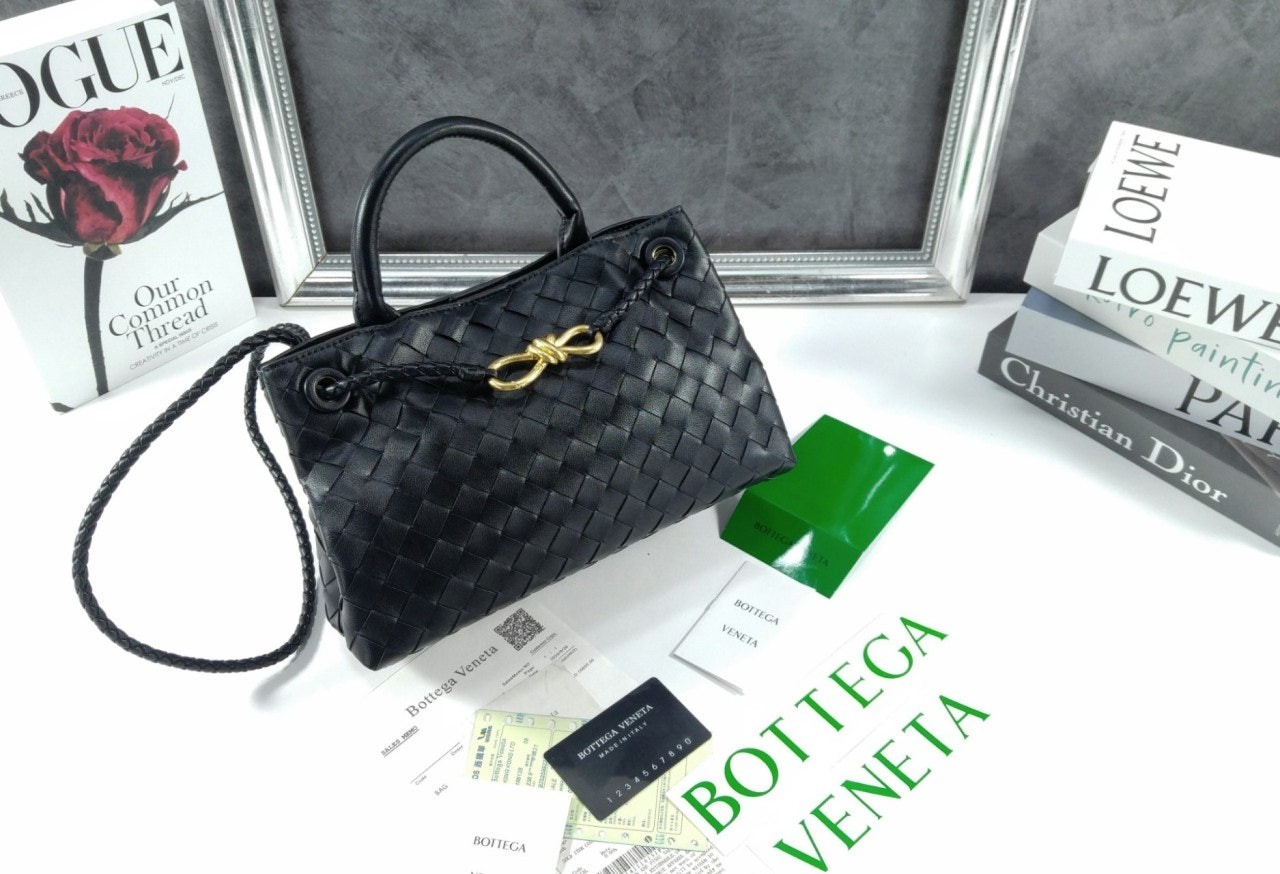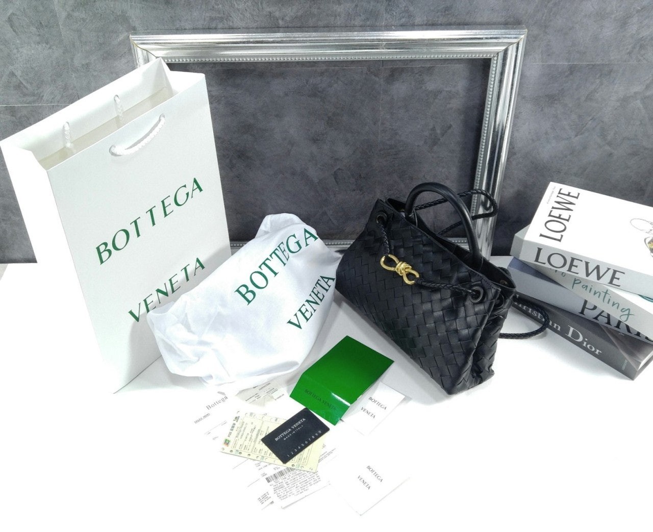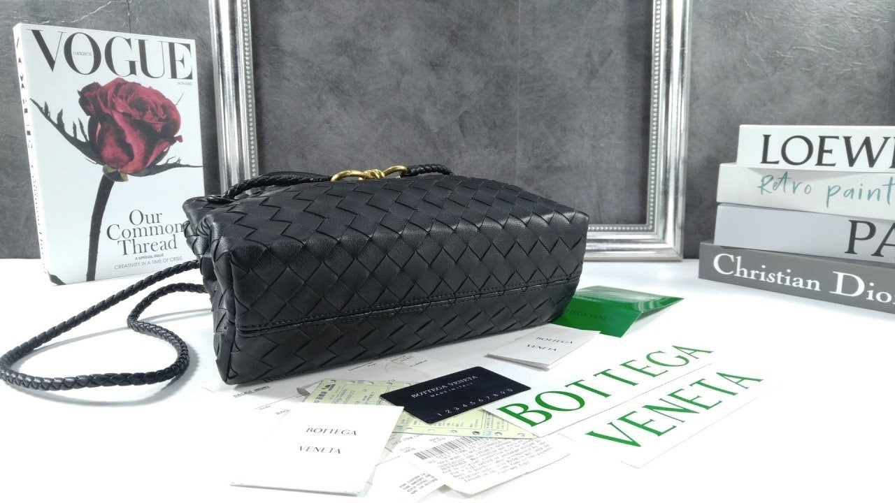 탄력 있는 나파 가죽 소재를 정교한 인트레치아토 위빙으로 완성한 탑 핸들 백으로 긴 실루엣이 특징적이며 슬라이딩 크로스 스트랩과 시그니처 놋 디테일이 있음.
