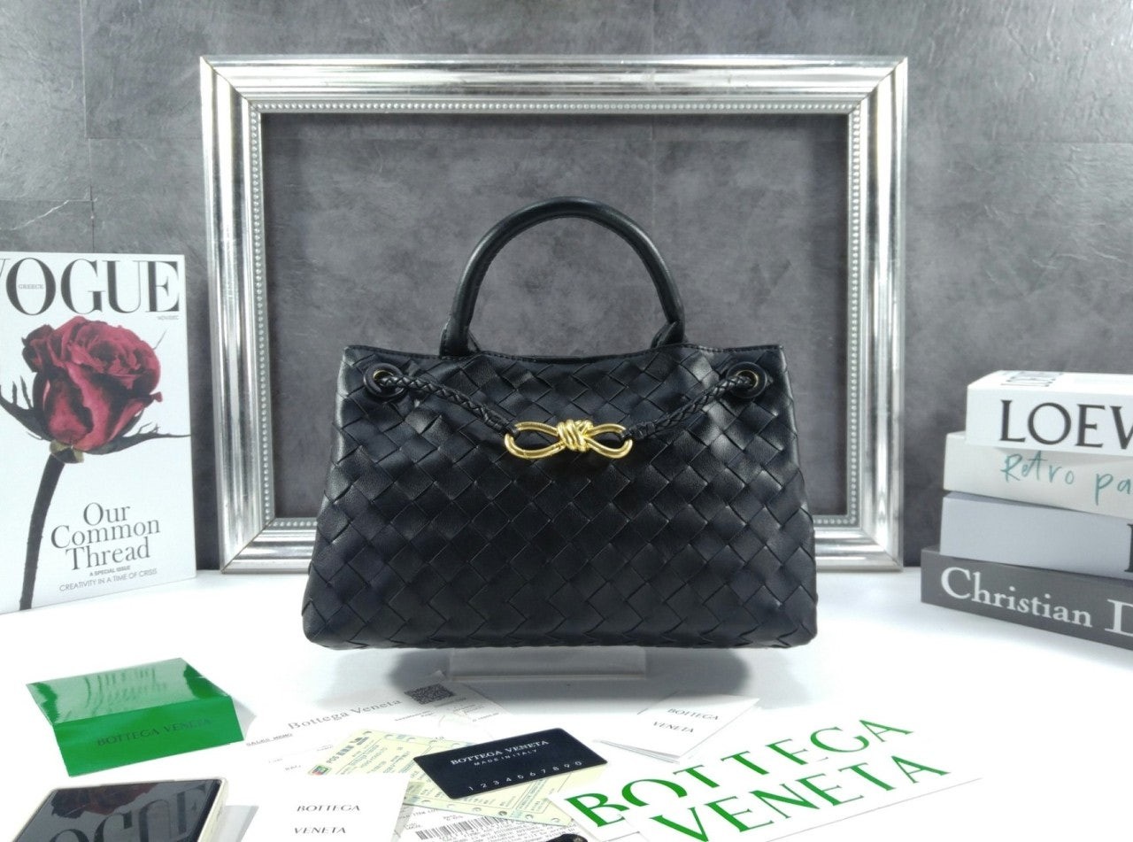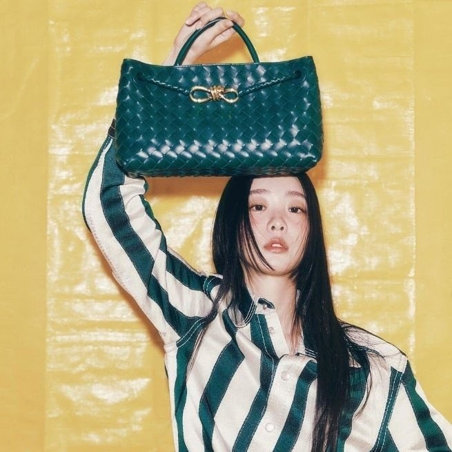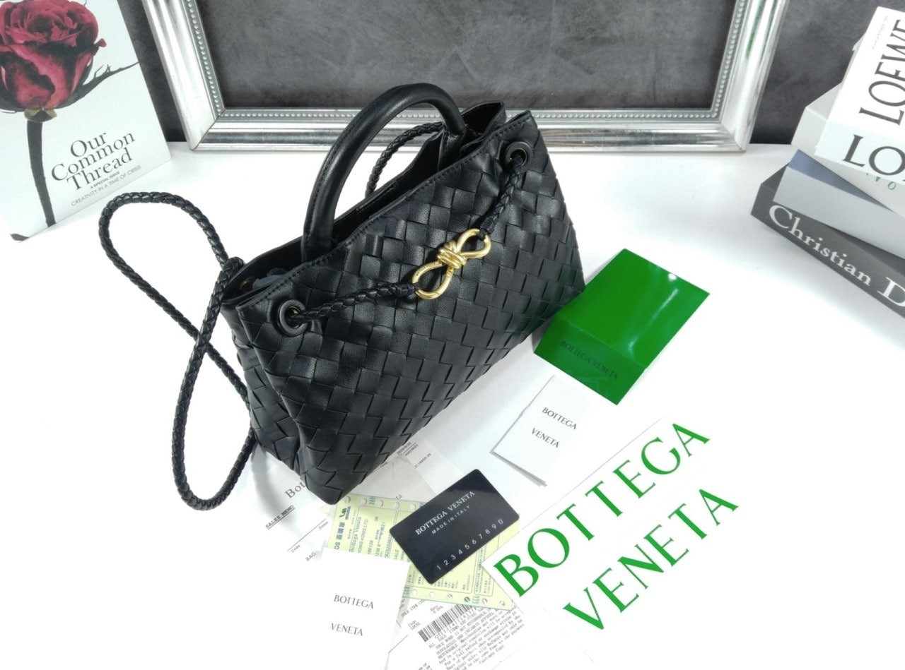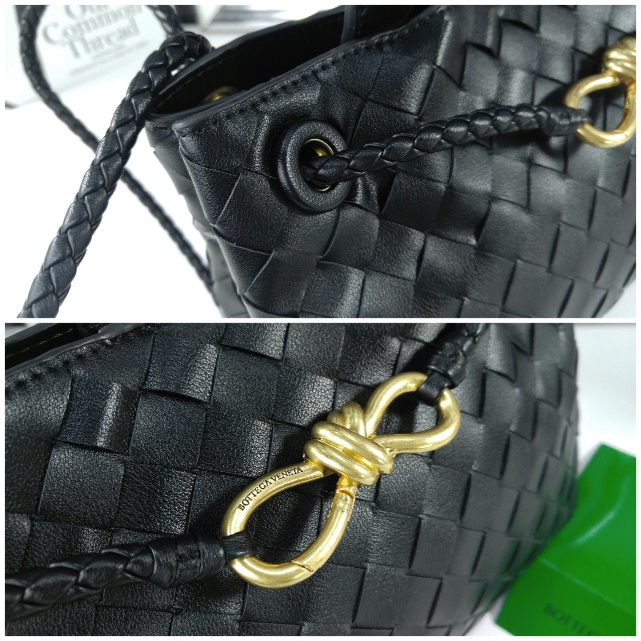 탄력 있는 나파 가죽 소재를 정교한 인트레치아토 위빙으로 완성한 탑 핸들 백으로 긴 실루엣이 특징적이며 슬라이딩 크로스 스트랩과 시그니처 놋 디테일이 있음.