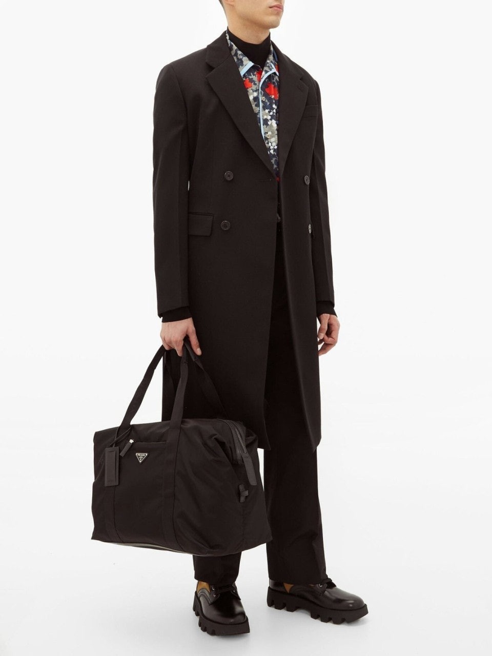 이 더플 백에서는 크로스해치 텍스처와 왁스 마감 처리가 돋보이는 최고급 송아지 가죽인 사피아노 가죽과 메탈 트라이앵글 로고와 네임 태그가 인상적인 디자인