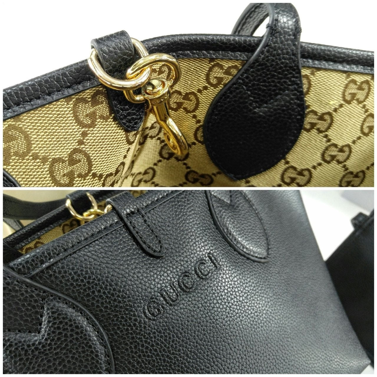 한쪽 면에 블랙 그레이니 레더, 반대쪽 면에 베이지/다크 브라운 GG 캔버스
