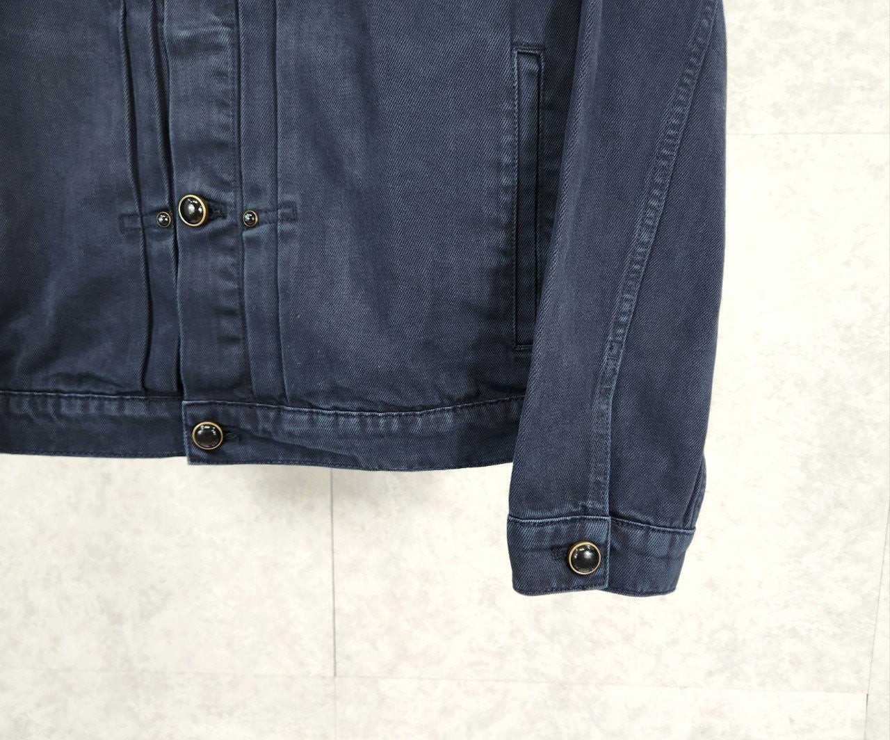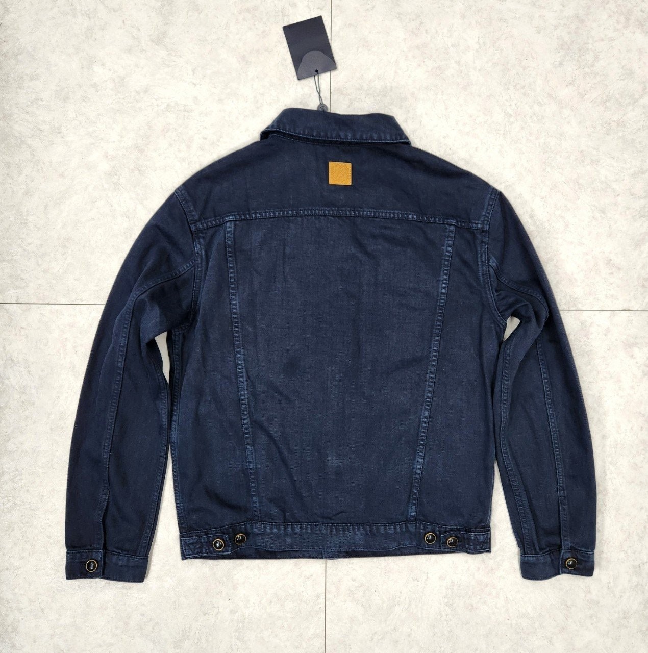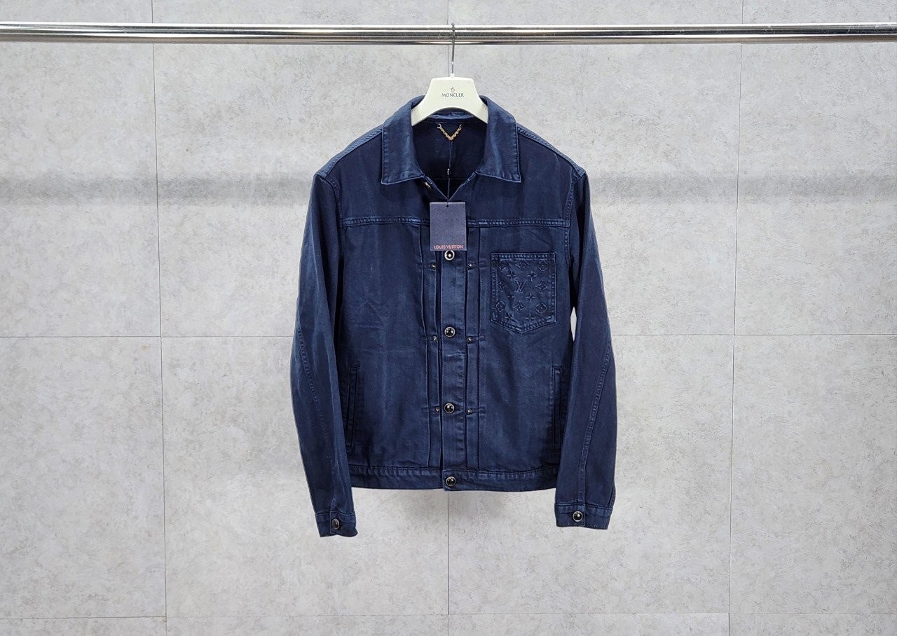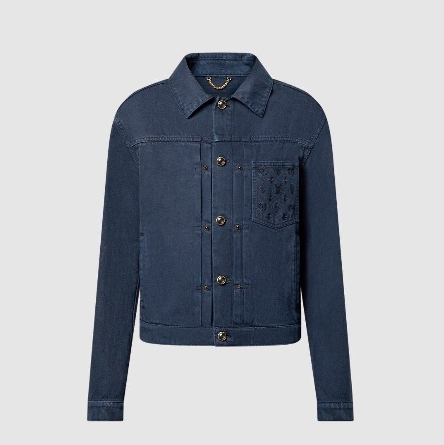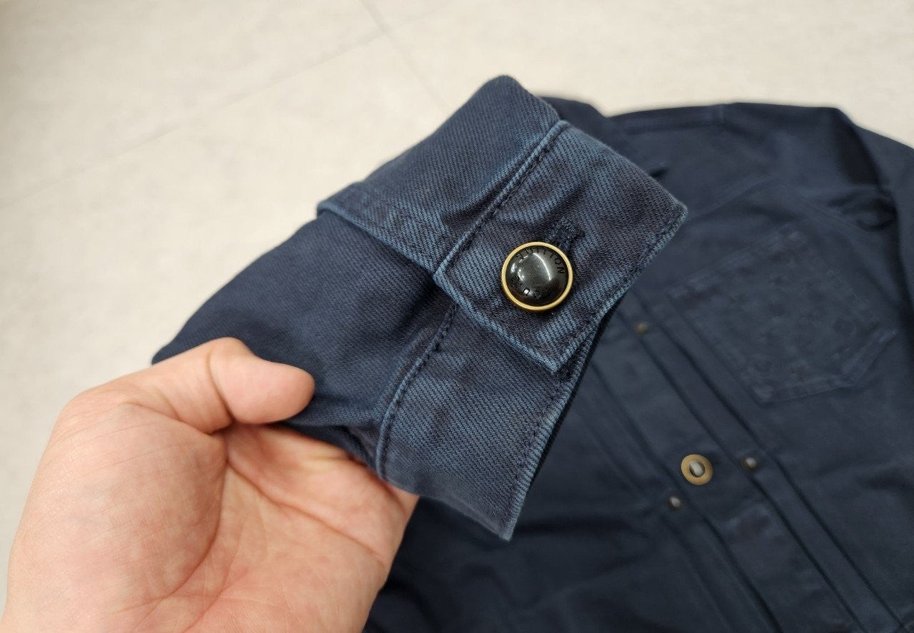 가먼트 다잉 기법으로 다크 네이비 색상을 입혀 빈티지한 워싱 효과를 구현한 타입 II 데님 자켓입니다 클래식한 앞면 플리츠. 모노그램 자수를 장식한 가슴 부분 포켓. 톤 배색을 이루는 진주빛 버튼과 리벳으로 세련된 감각을 더한 디자인 입니다.