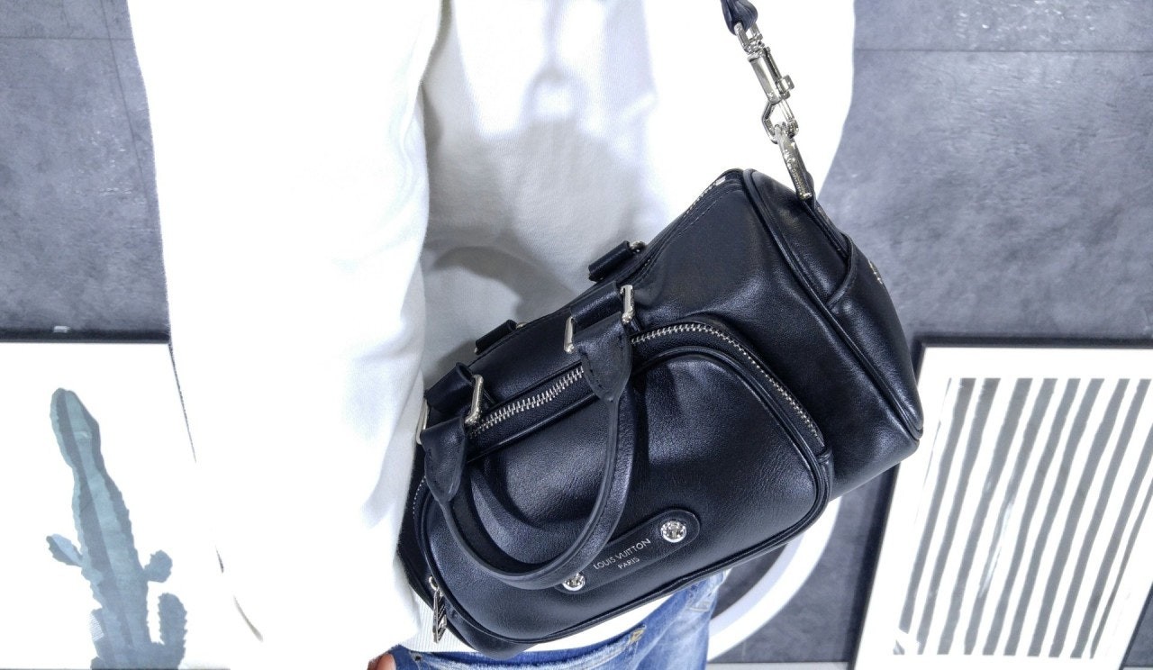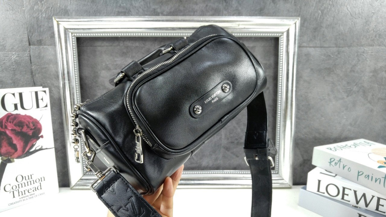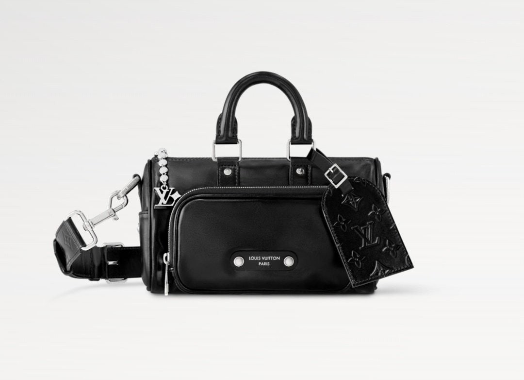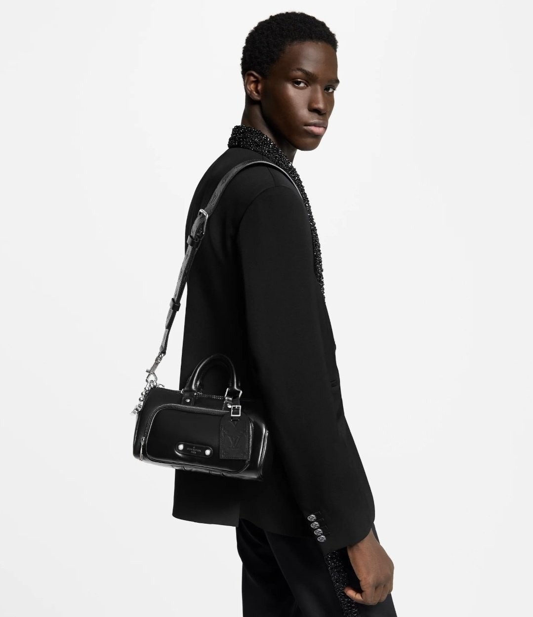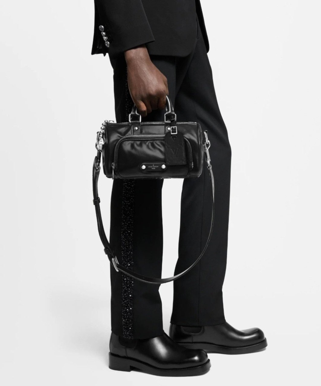 퍼렐 윌리엄스가 반짝이는 블랙 색상의 카프스킨 소재로 선보이는 키폴 카고 반둘리에 25. 퍼렐 윌리엄스 특유의 댄디한 미학을 담아낸 절제되고 우아한 시티백.