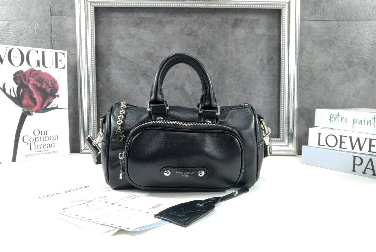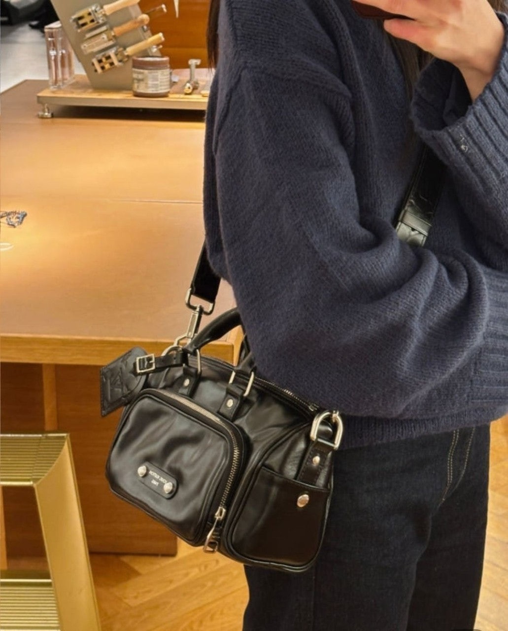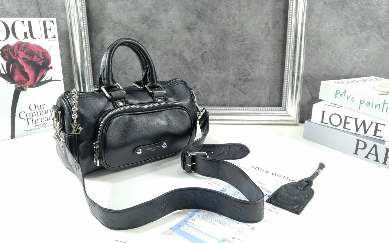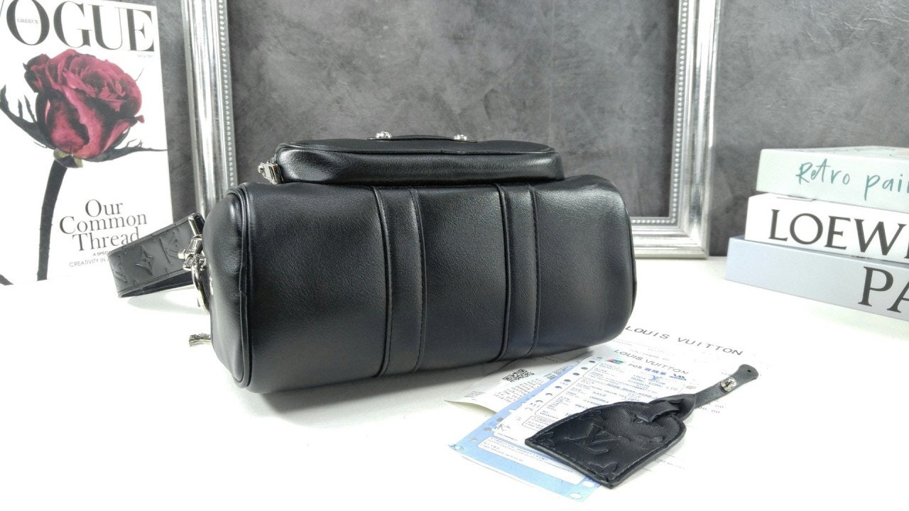 퍼렐 윌리엄스가 반짝이는 블랙 색상의 카프스킨 소재로 선보이는 키폴 카고 반둘리에 25. 퍼렐 윌리엄스 특유의 댄디한 미학을 담아낸 절제되고 우아한 시티백.