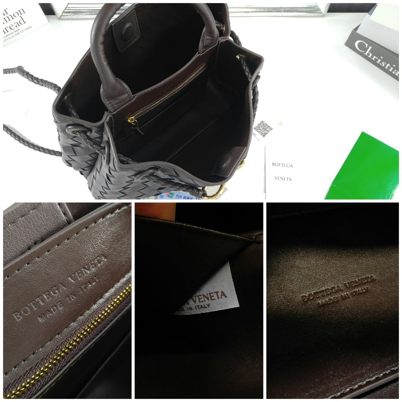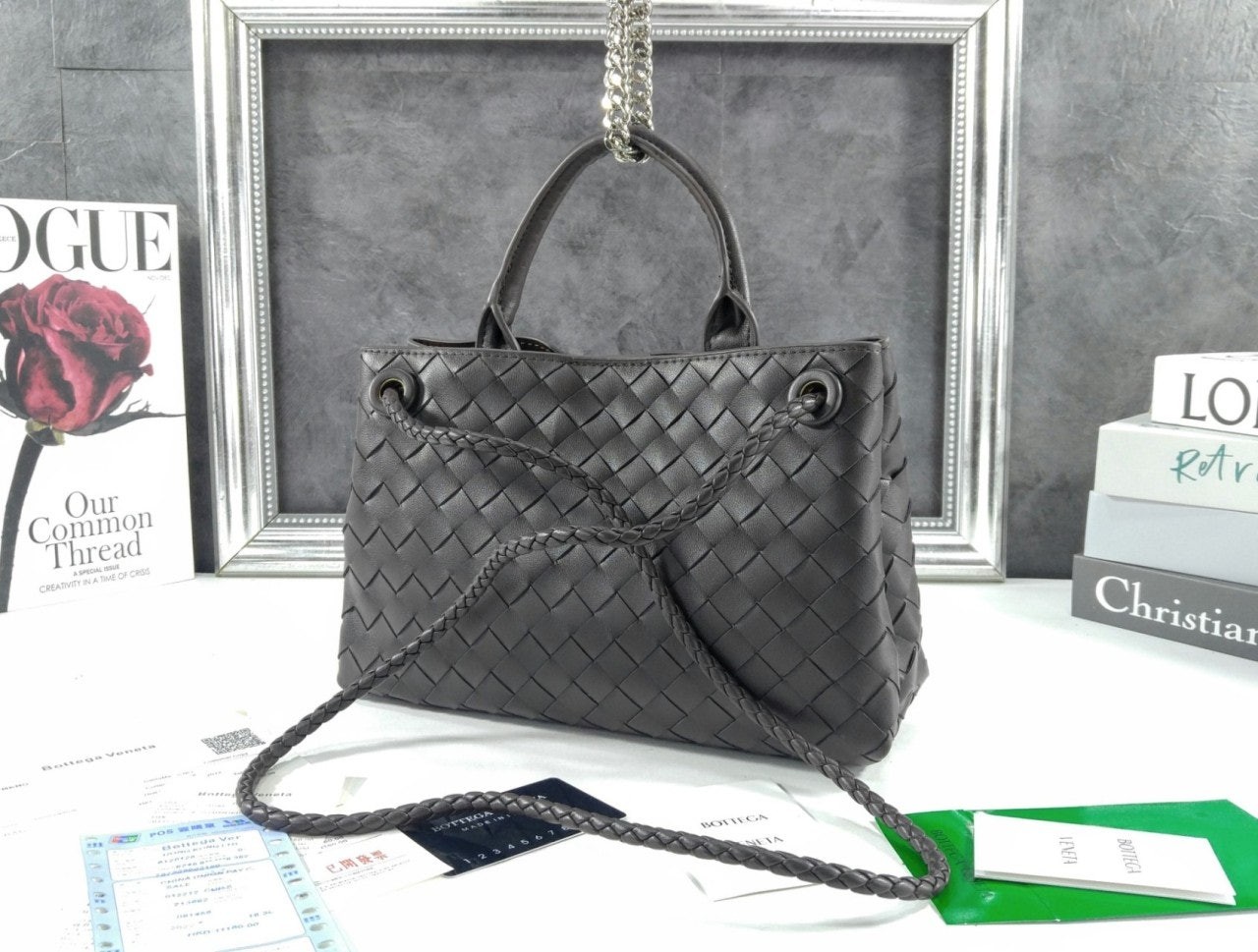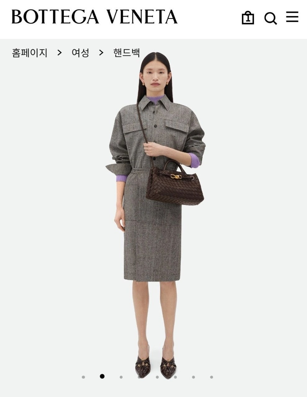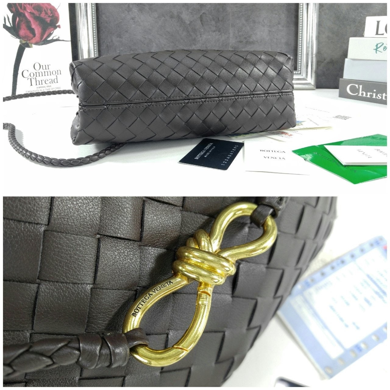 시그니처 놋 디테일 및 슬라이딩 크로스 스트랩을 갖춘 유연한 인트레치아토 가죽 소재의 긴 실루엣을 가진 탑 핸들 백.