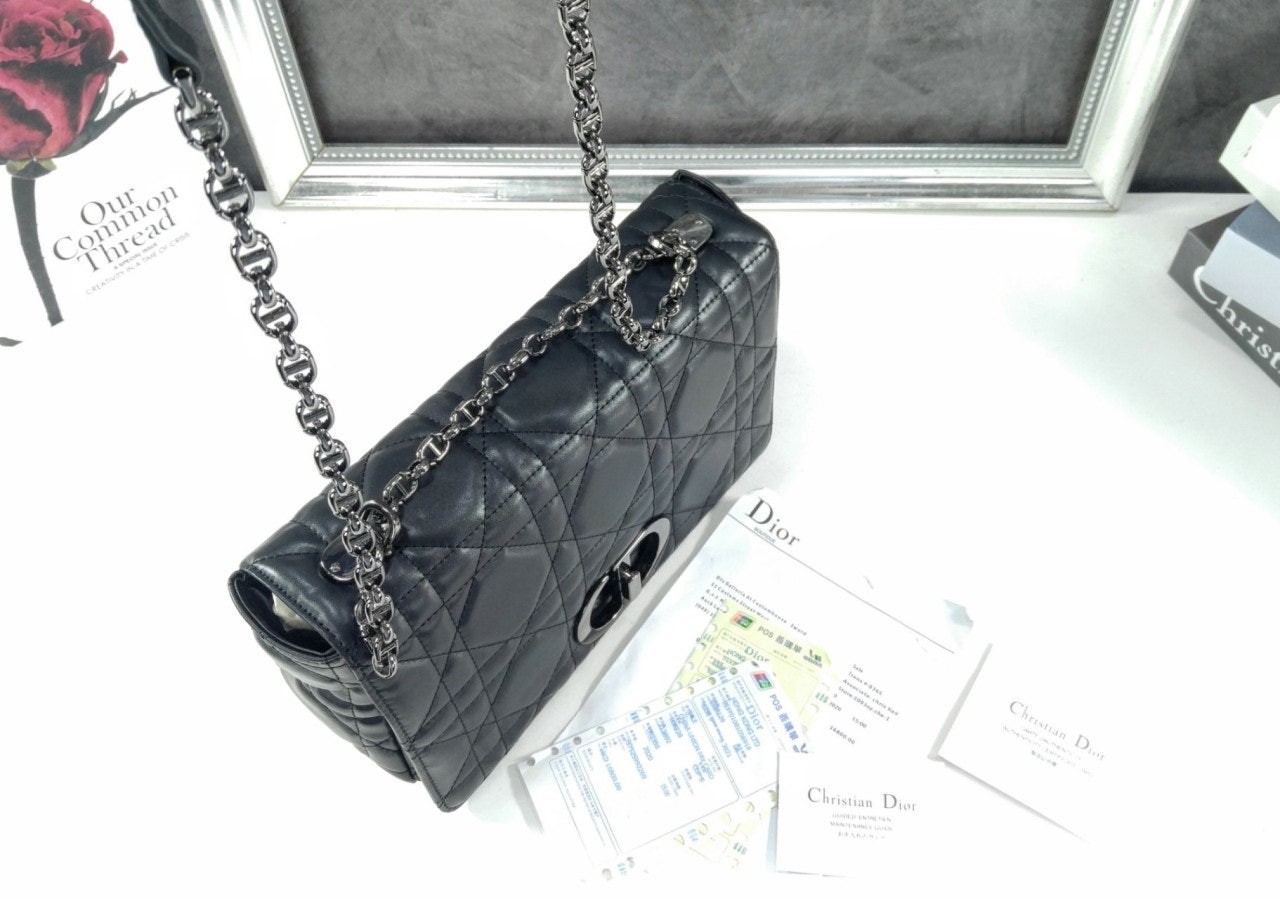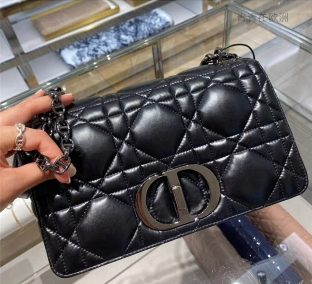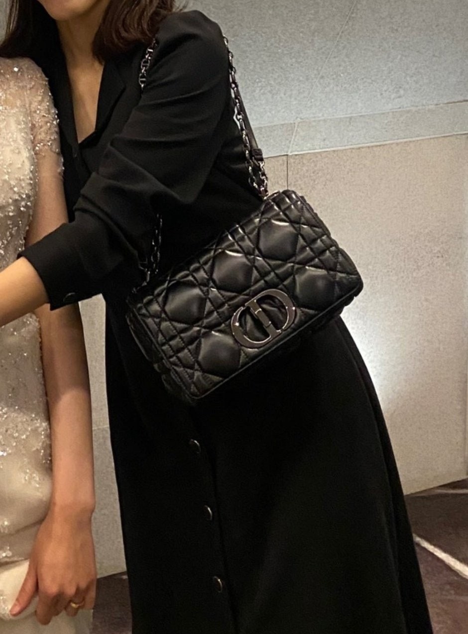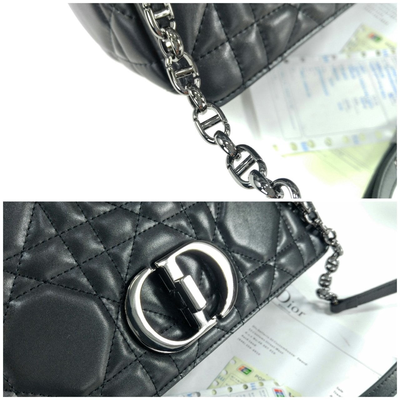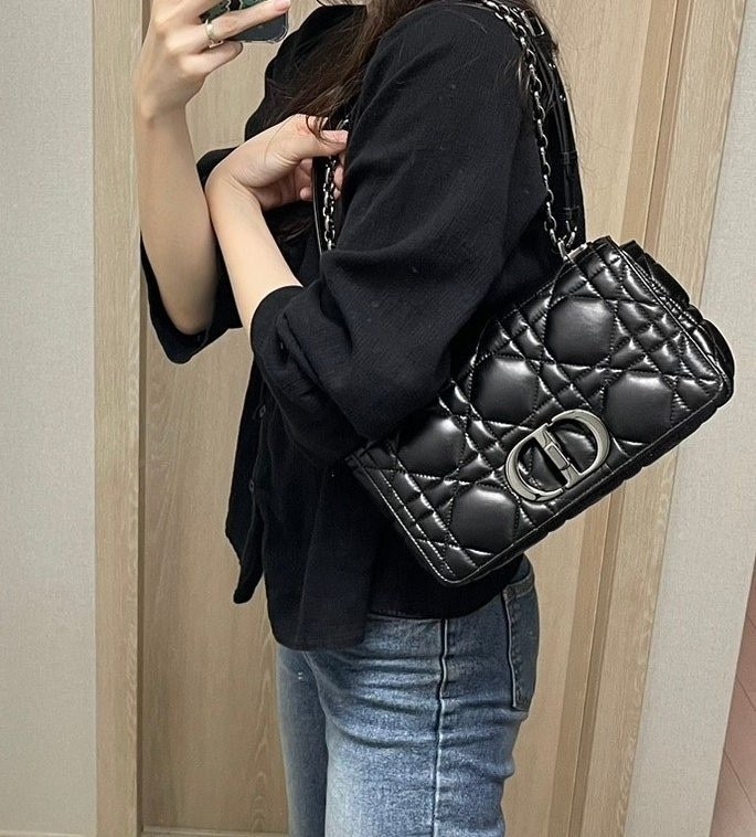 우아한 타임리스 스타일이면서 동시에 모던함이 느껴지는 Di0r Caro 백입니다. 독특한 퀼트-이펙트의 매크로까나쥬 스티칭이 돋보이는 블랙 컬러 송아지 가죽 소재로 제작되었습니다. Christ*an Di0r 향수 보틀 씰에서 영감을 얻은 플랩의 앤틱 블랙 피니시 메탈 CD 트위스트 잠금장치가 특징입니다. CD 시그니처 링크로 이루어진 탈착식 체인 숄더 스트랩을 활용해 핸드백이나 숄더백처럼 착용하기 좋으며, 디* 하우스의 다양한 와이드 자수 스트랩을 매치해 데이 룩이나 이브닝 룩을 연출할 수 있습니다.