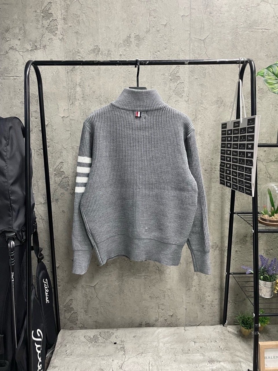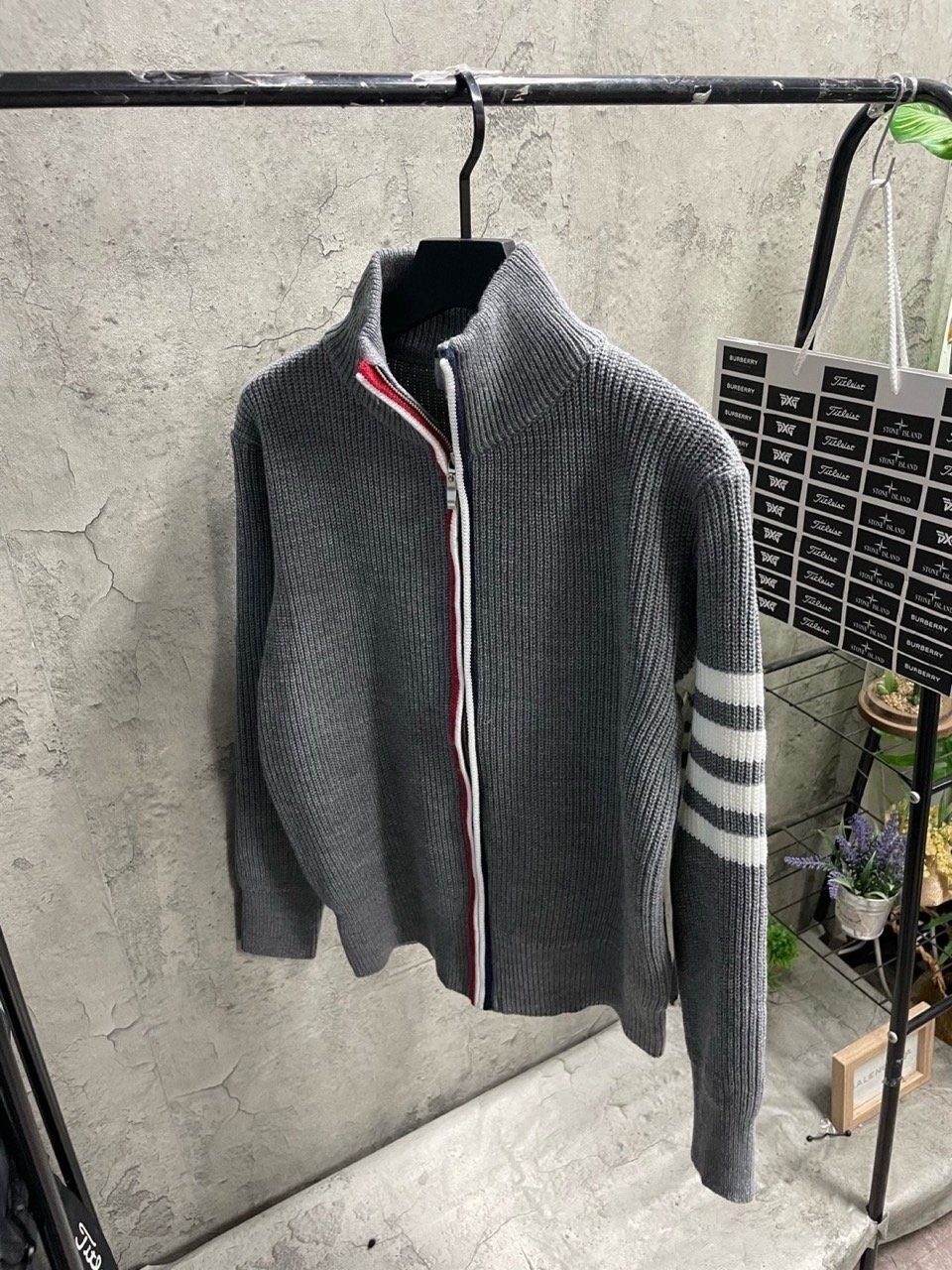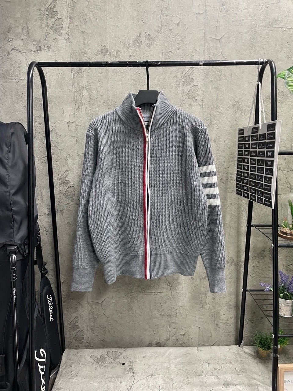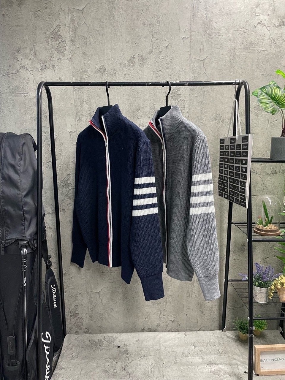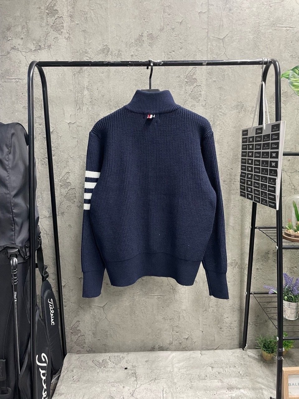 3단 배색 삼선포인트의 고급니트집업 입니다. 몸의 실루엣을 잘 잡아주어 탄탄해 보이는 효과가 있으며, 지퍼에 3단 배색 패턴과 팔에 사선이 더해져 세련된 느낌을 주도록 제작하였습니다.