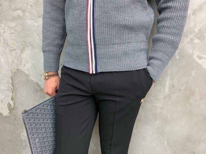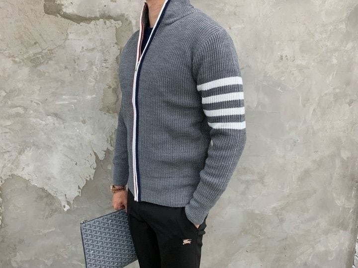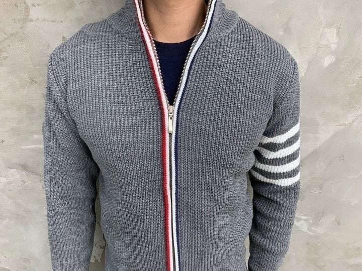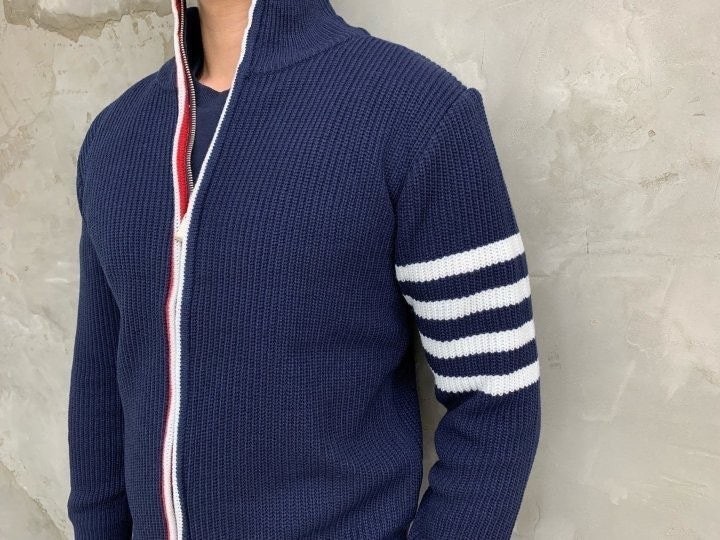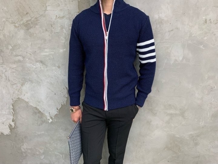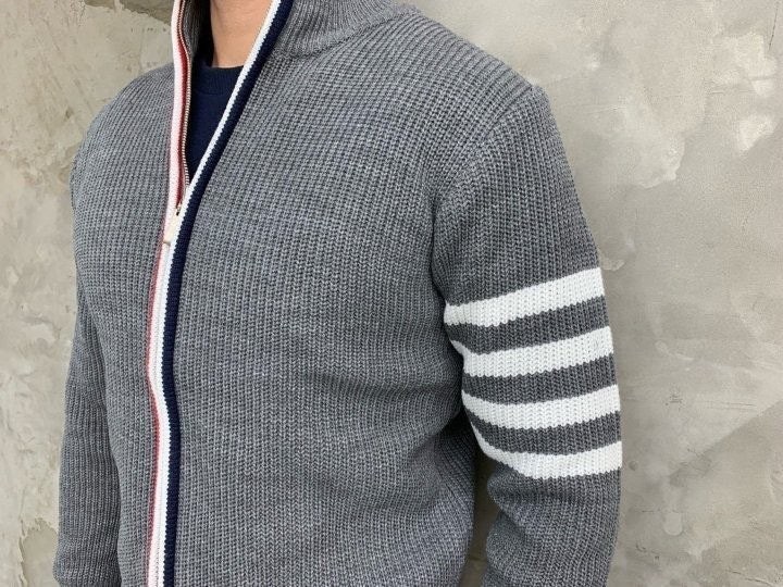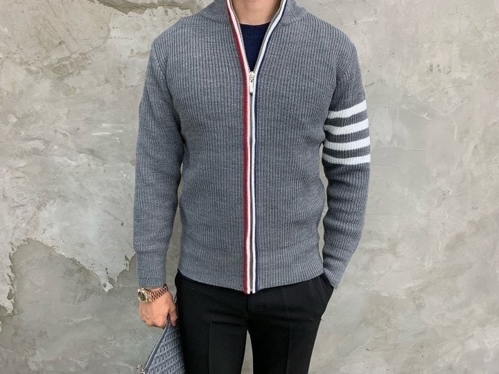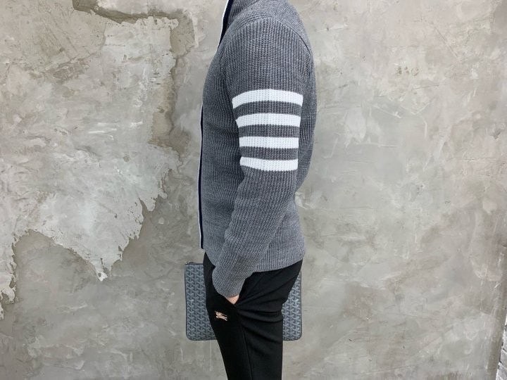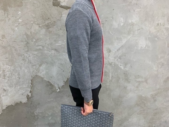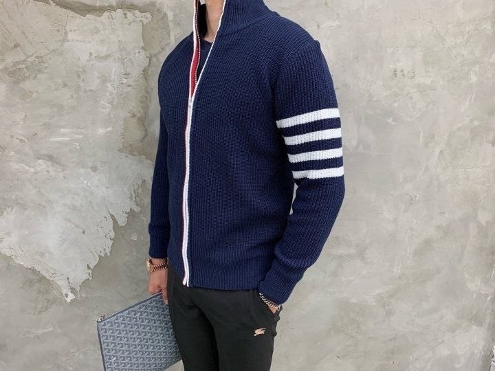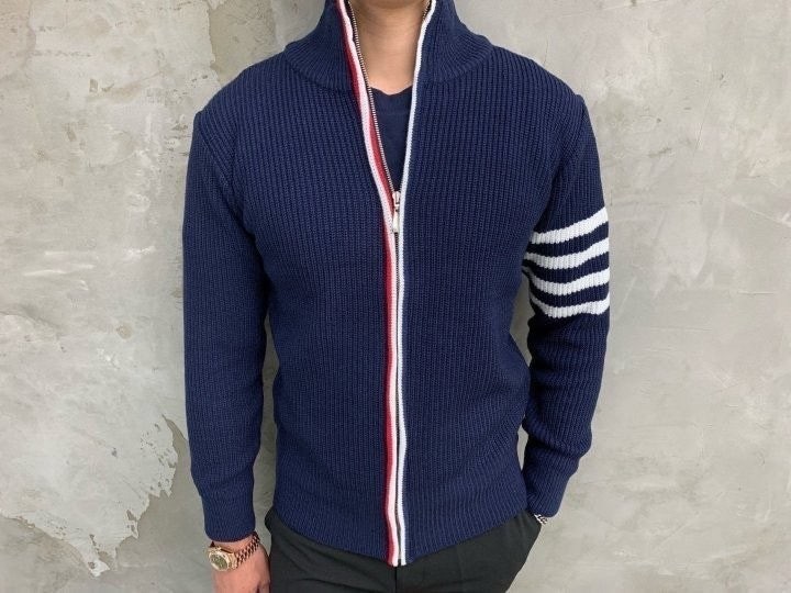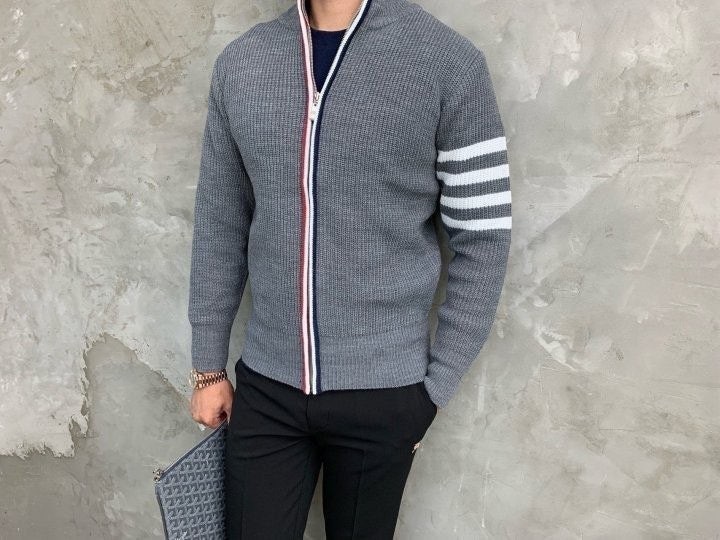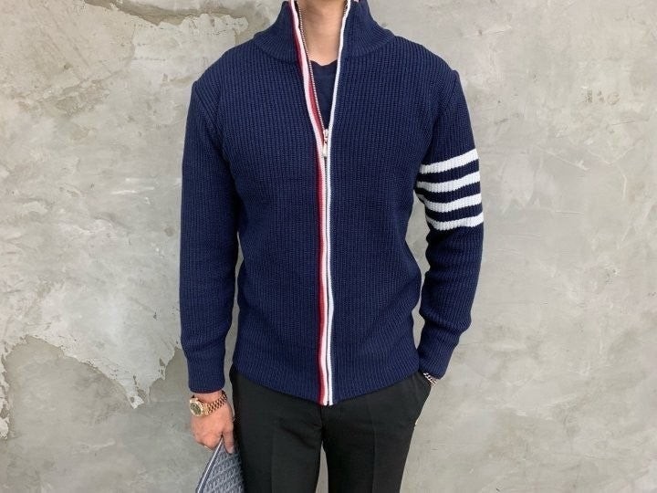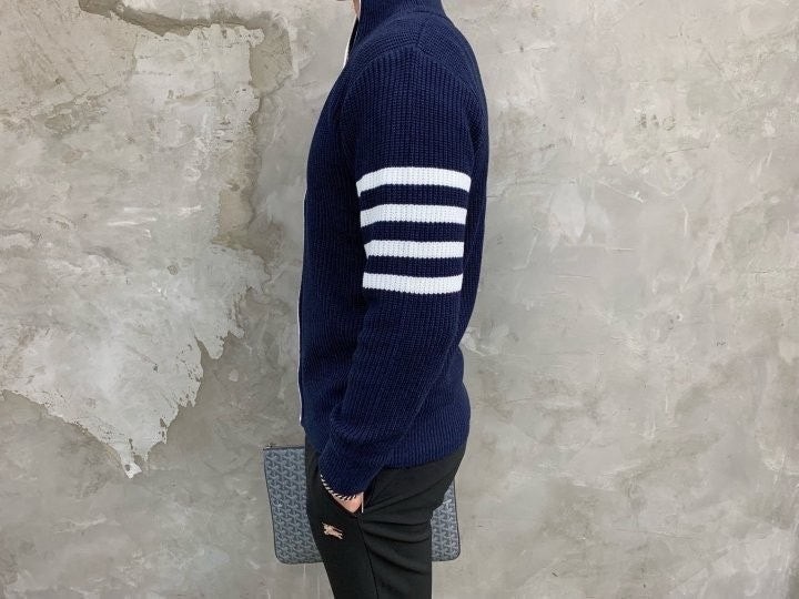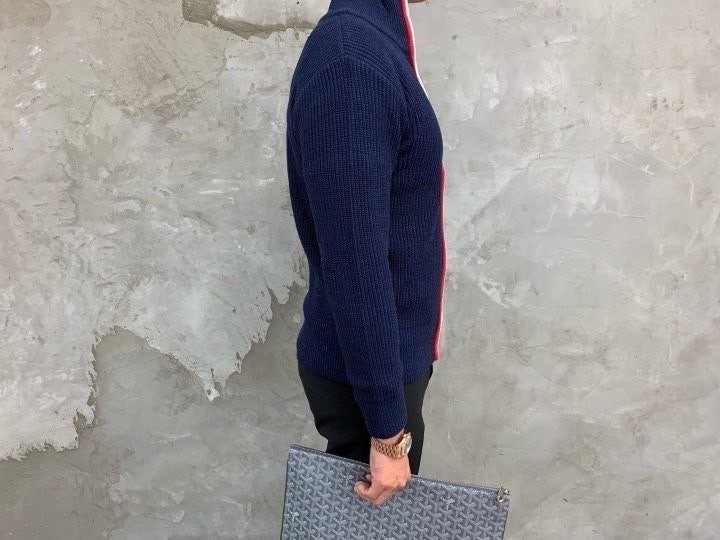 3단 배색 삼선포인트의 고급니트집업 입니다. 몸의 실루엣을 잘 잡아주어 탄탄해 보이는 효과가 있으며, 지퍼에 3단 배색 패턴과 팔에 사선이 더해져 세련된 느낌을 주도록 제작하였습니다. 색상 스타일에 상관없이 어떠한 코디에도 레이어링 가능하며 유행타지 않는 디자인으로 간결하고 고급스럽게 제작되어 언제나 손이 자주가는 고급 니트집업입니다.