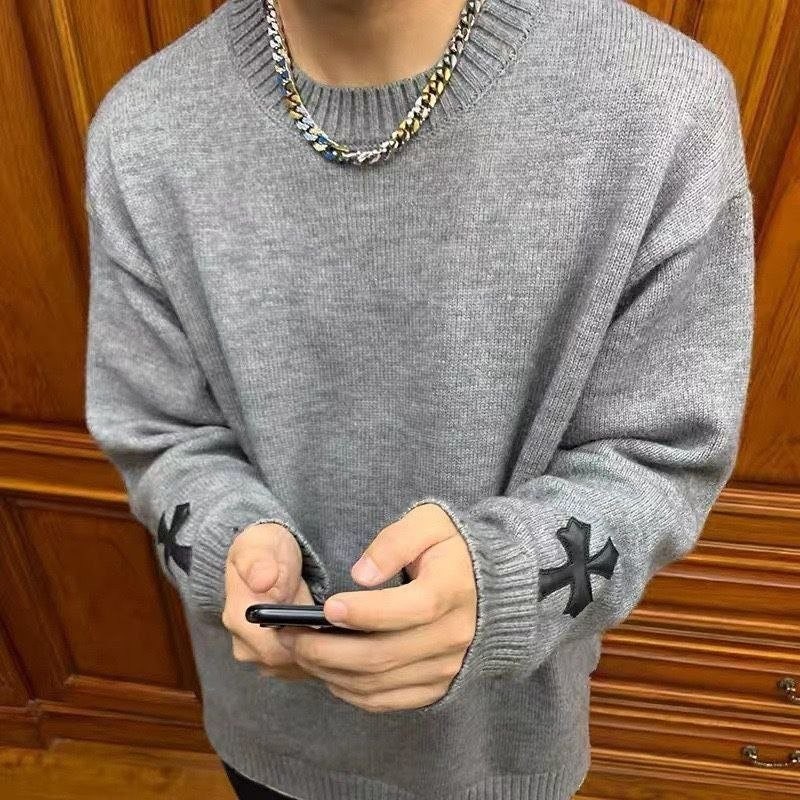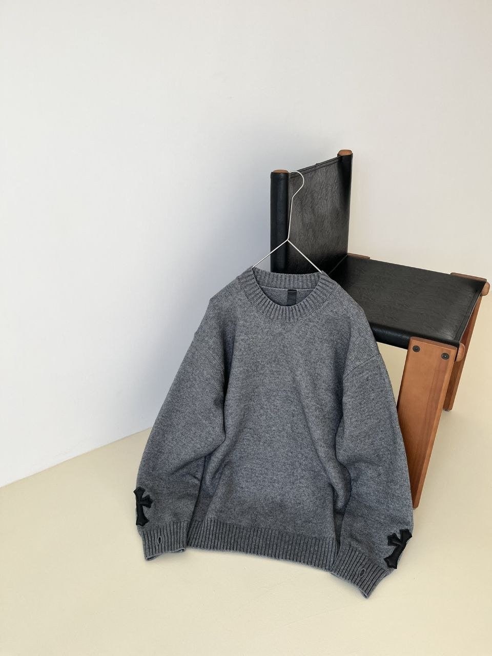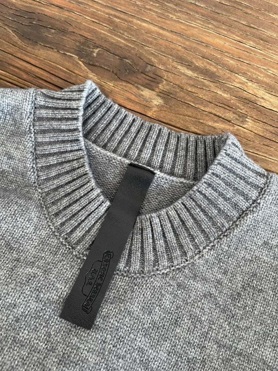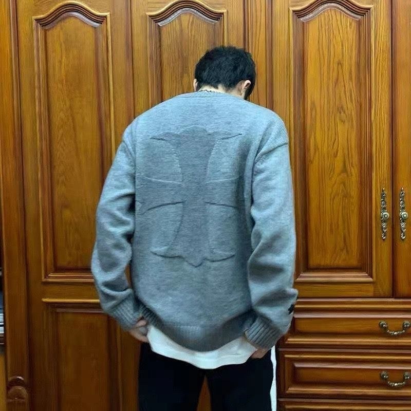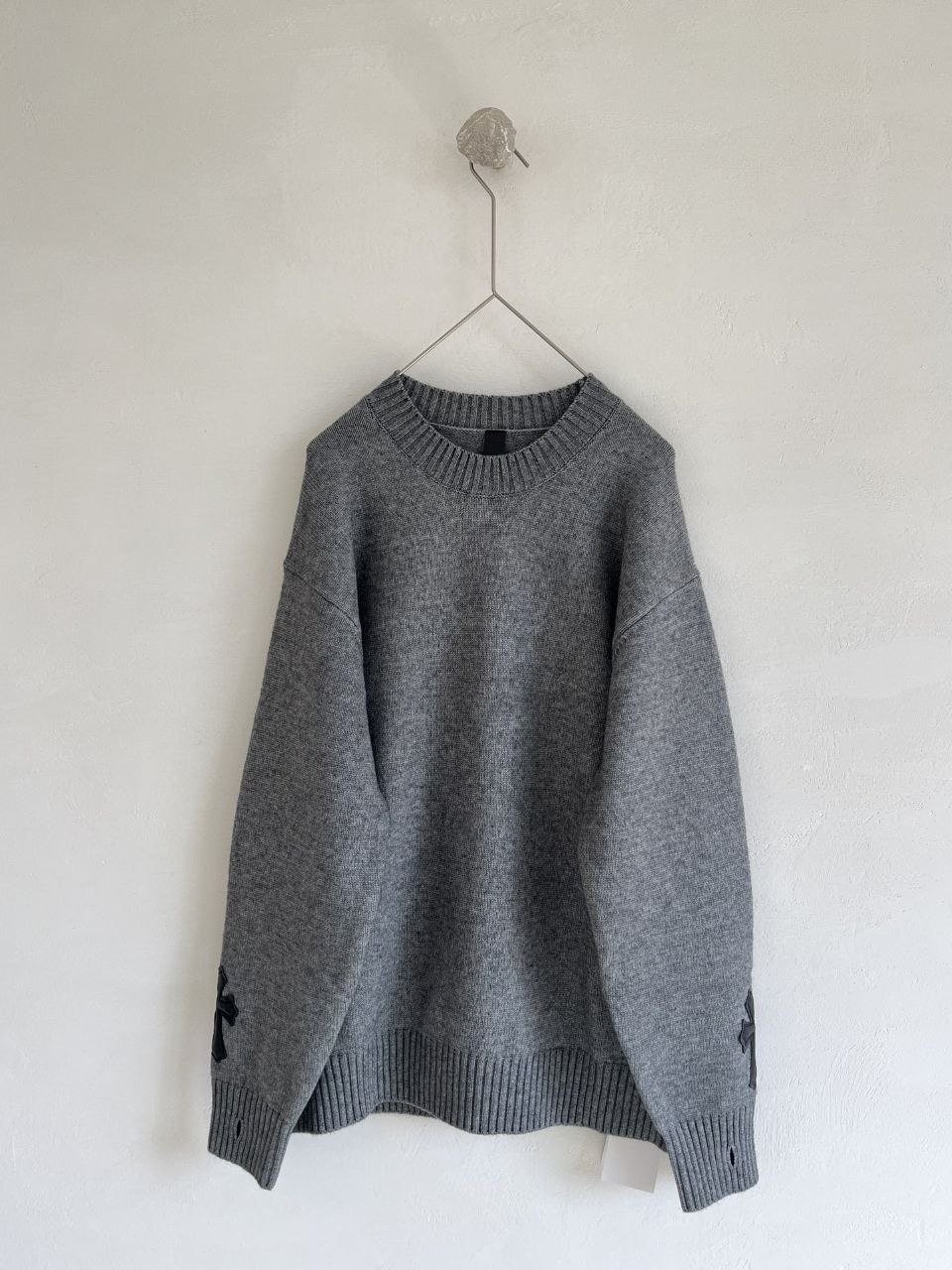 •Chrome Hear** 크* FW 가을·겨울 컬렉션의 십자가 가죽 라벨 입체 인서트 자수 니트 입니다. 회색 100% 양모(울)를 주문 염색·정교하게 편직해 만든 제품입니다. 초정밀 수입 밀편 기술로 촘촘하게 짜여 원단 자체의 두께와 중량감이 충분하며, 원사와 공정 모두 매우 높은 수준으로 완성되어 촉감이 조밀하고 부드러워 피부에 닿는 감이 좋습니다. 통기성과 보온성도 뛰어나 가을·겨울 단품으로 입거나 이너로 활용하기에 매우 쾌적한 착용감을 제공합니다.