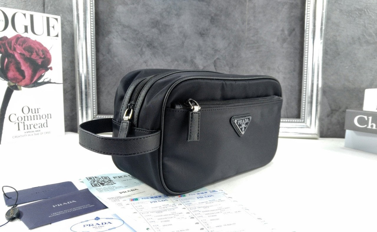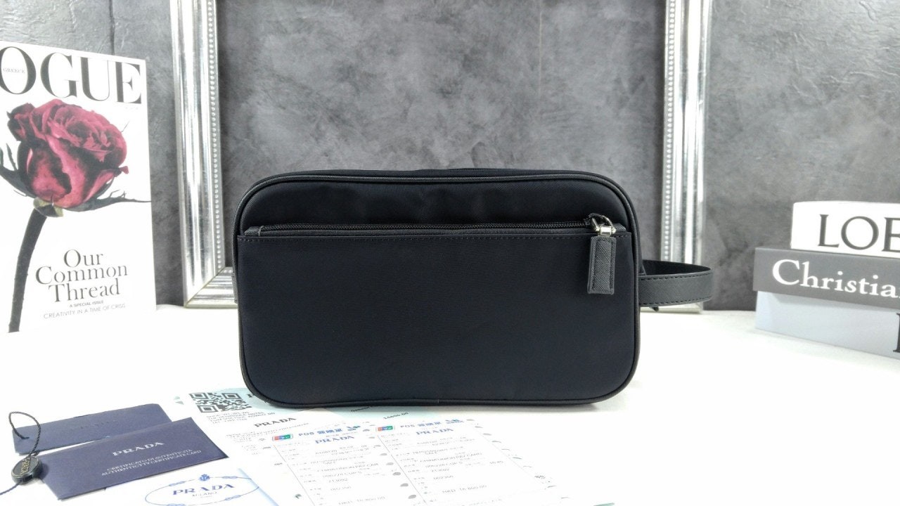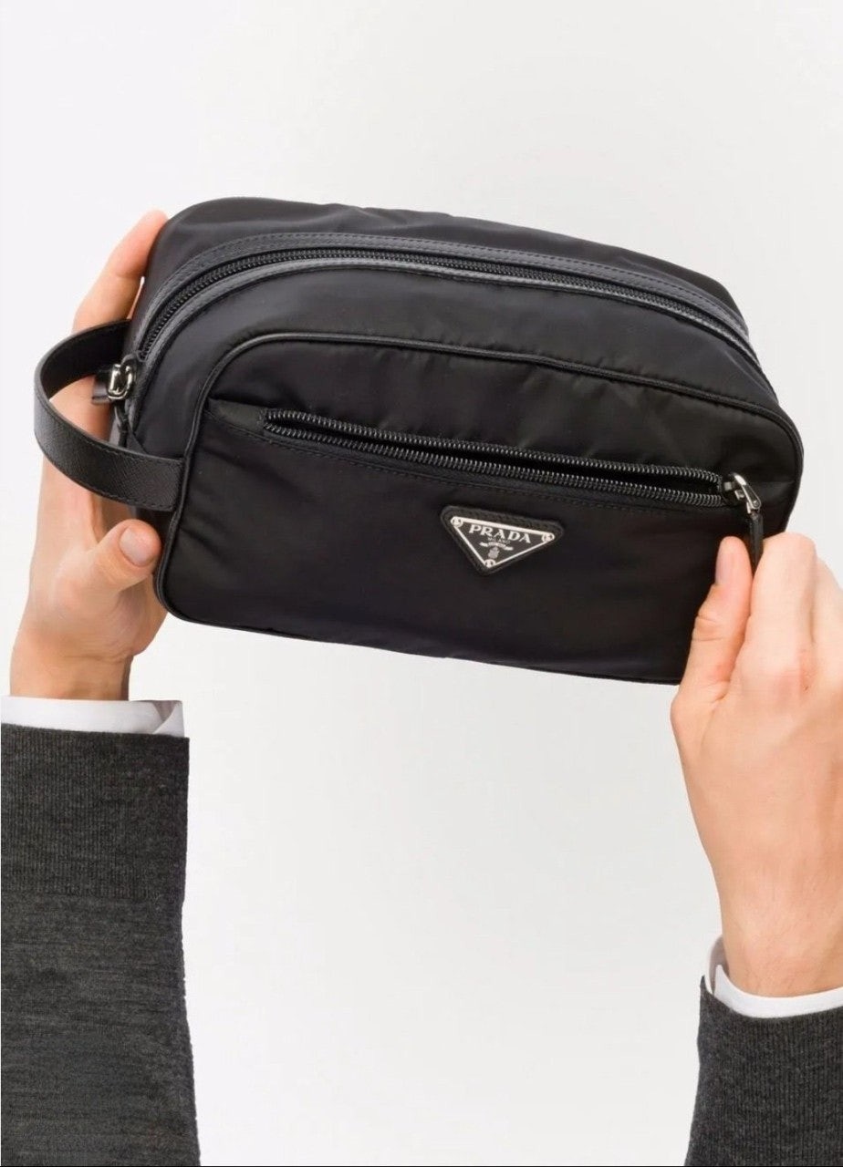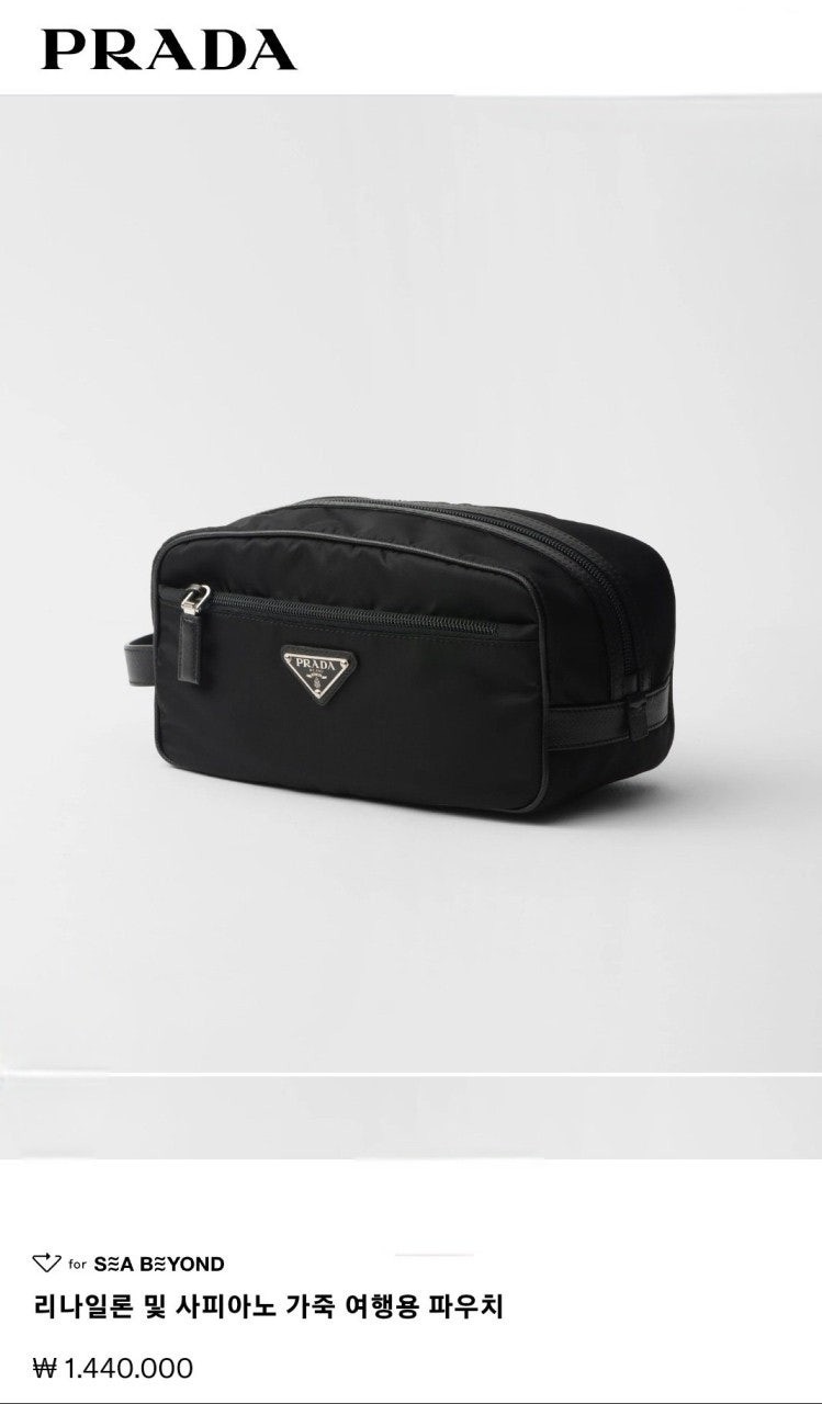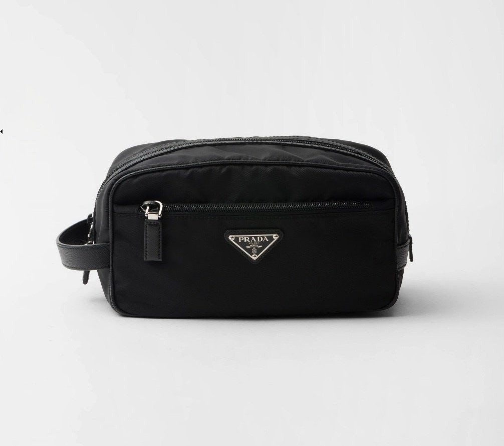 슬릭하고 기능적인 디자인의 트래블 파우치로, 리나일론으로 제작. 에나멜 트라이앵글 로고, 상단 지퍼 클로저가 인상적이며 사피아노 가죽 디테일로 장식했습니다.