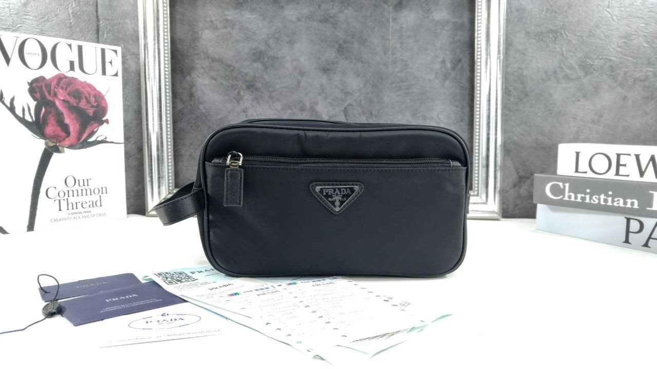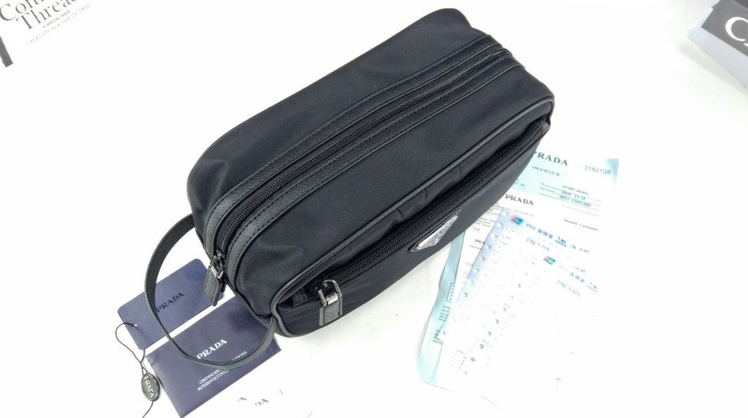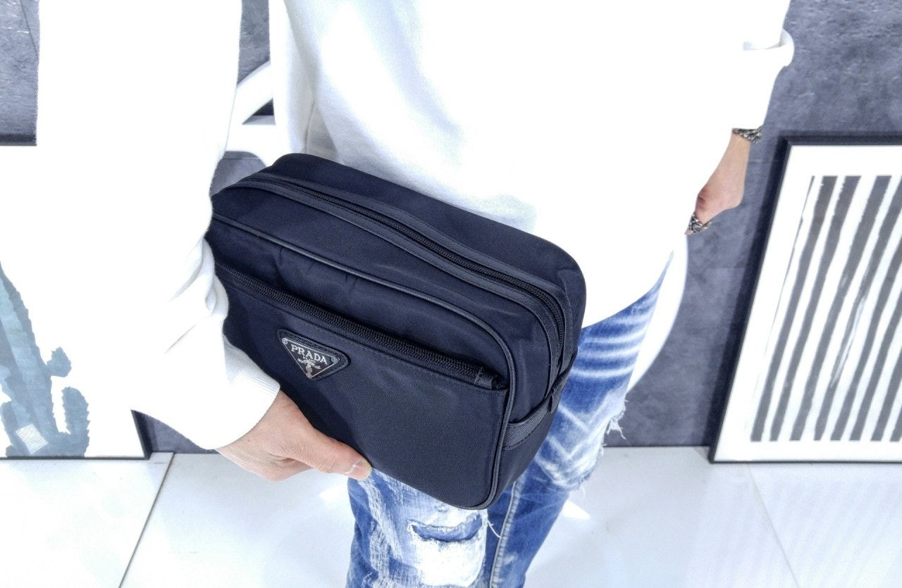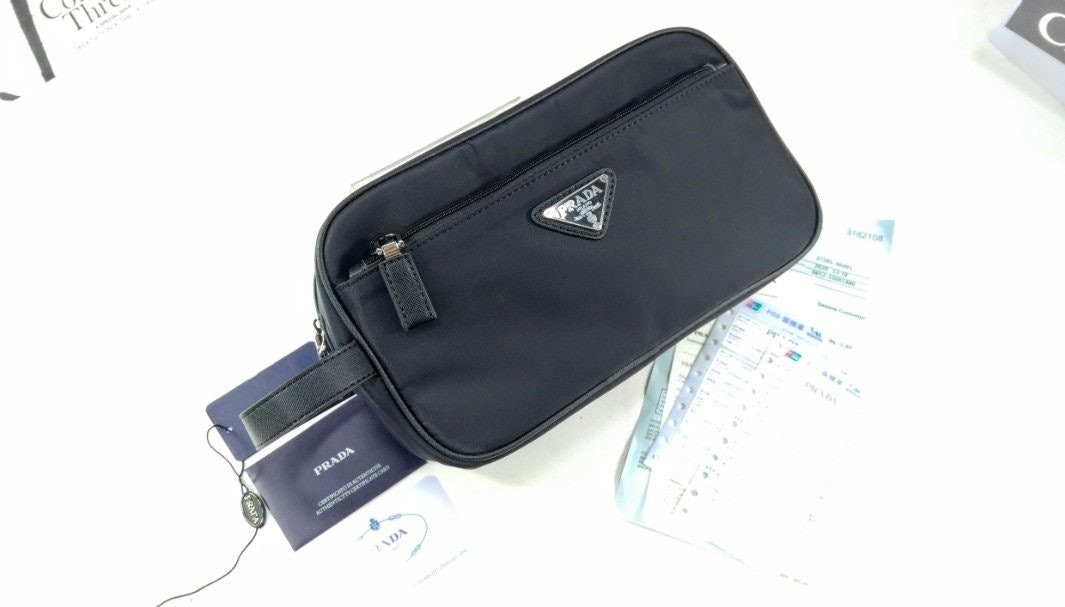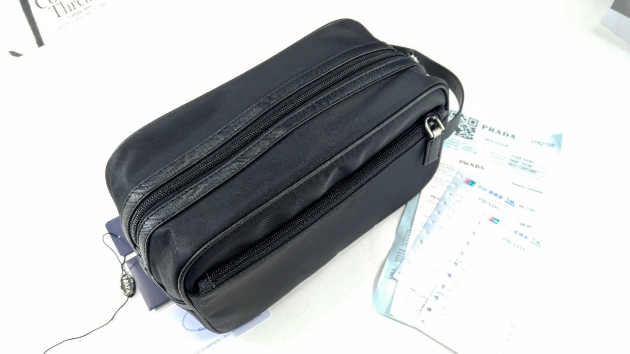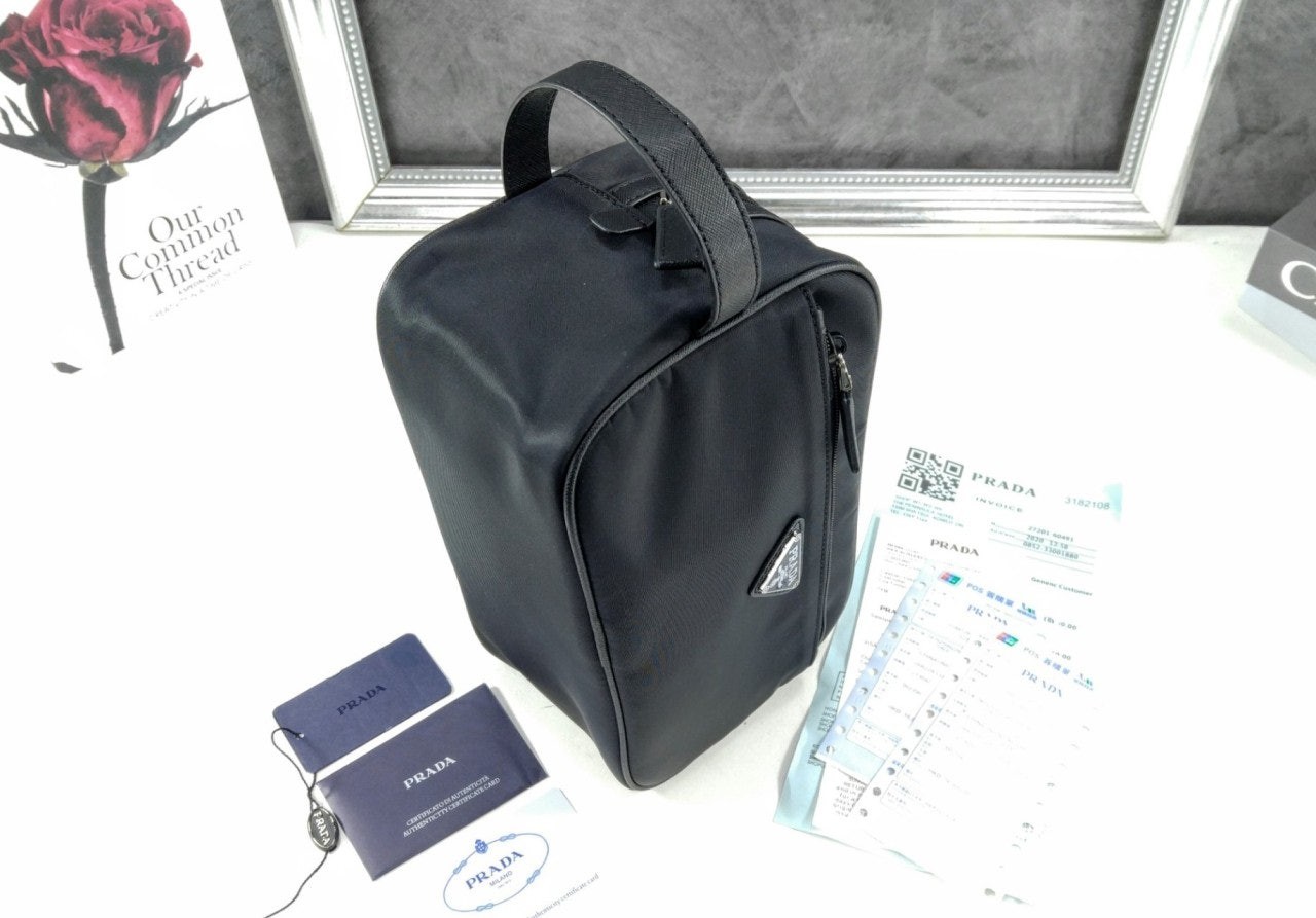 슬릭하고 기능적인 디자인의 트래블 파우치로, 리나일론으로 제작. 에나멜 트라이앵글 로고, 상단 지퍼 클로저가 인상적이며 사피아노 가죽 디테일로 장식했습니다.