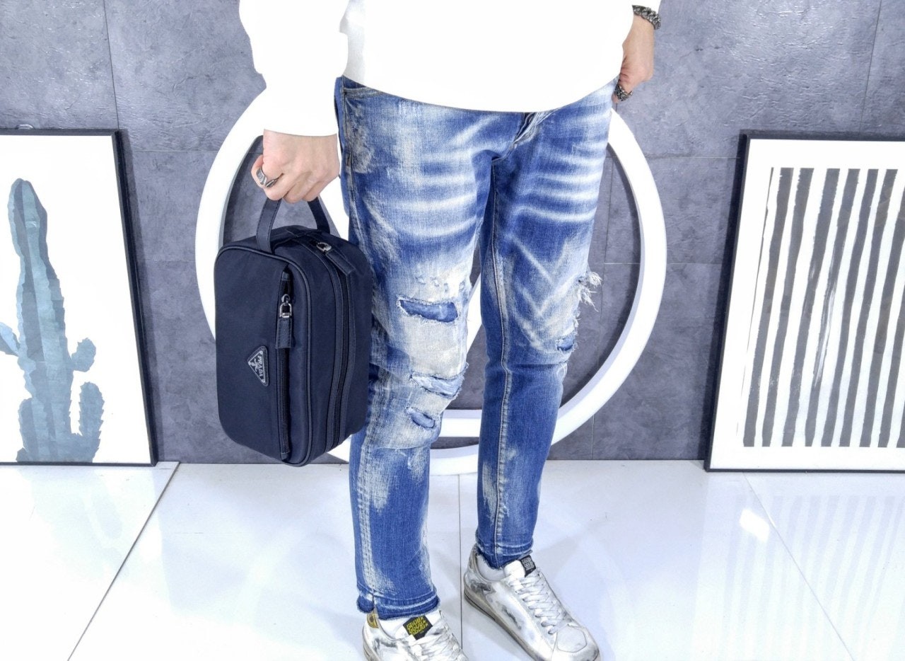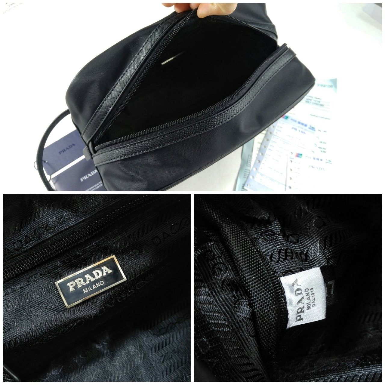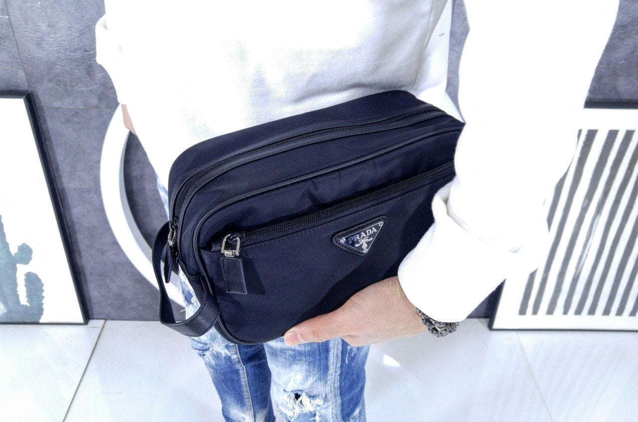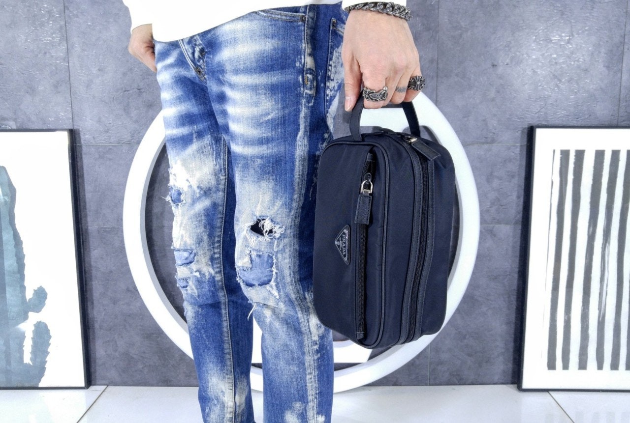 슬릭하고 기능적인 디자인의 트래블 파우치로, 리나일론으로 제작. 에나멜 트라이앵글 로고, 상단 지퍼 클로저가 인상적이며 사피아노 가죽 디테일로 장식했습니다.